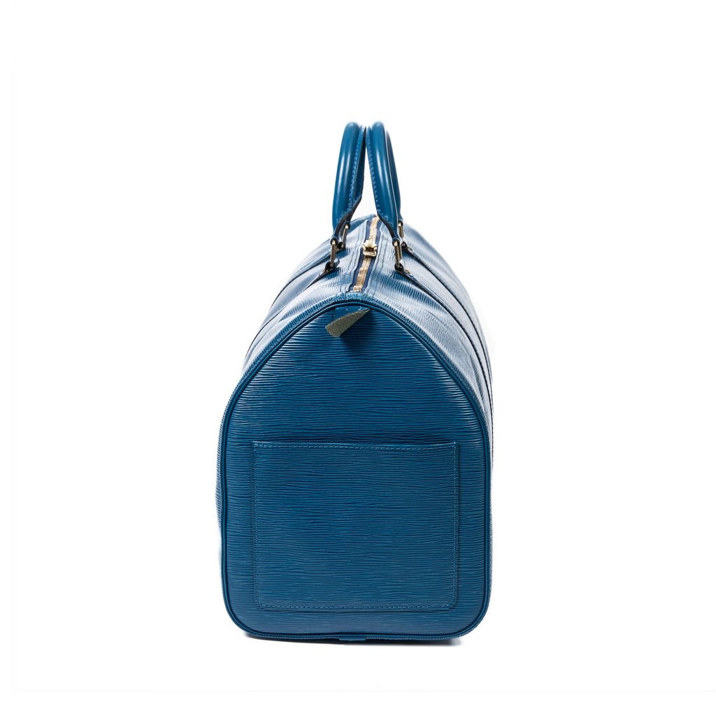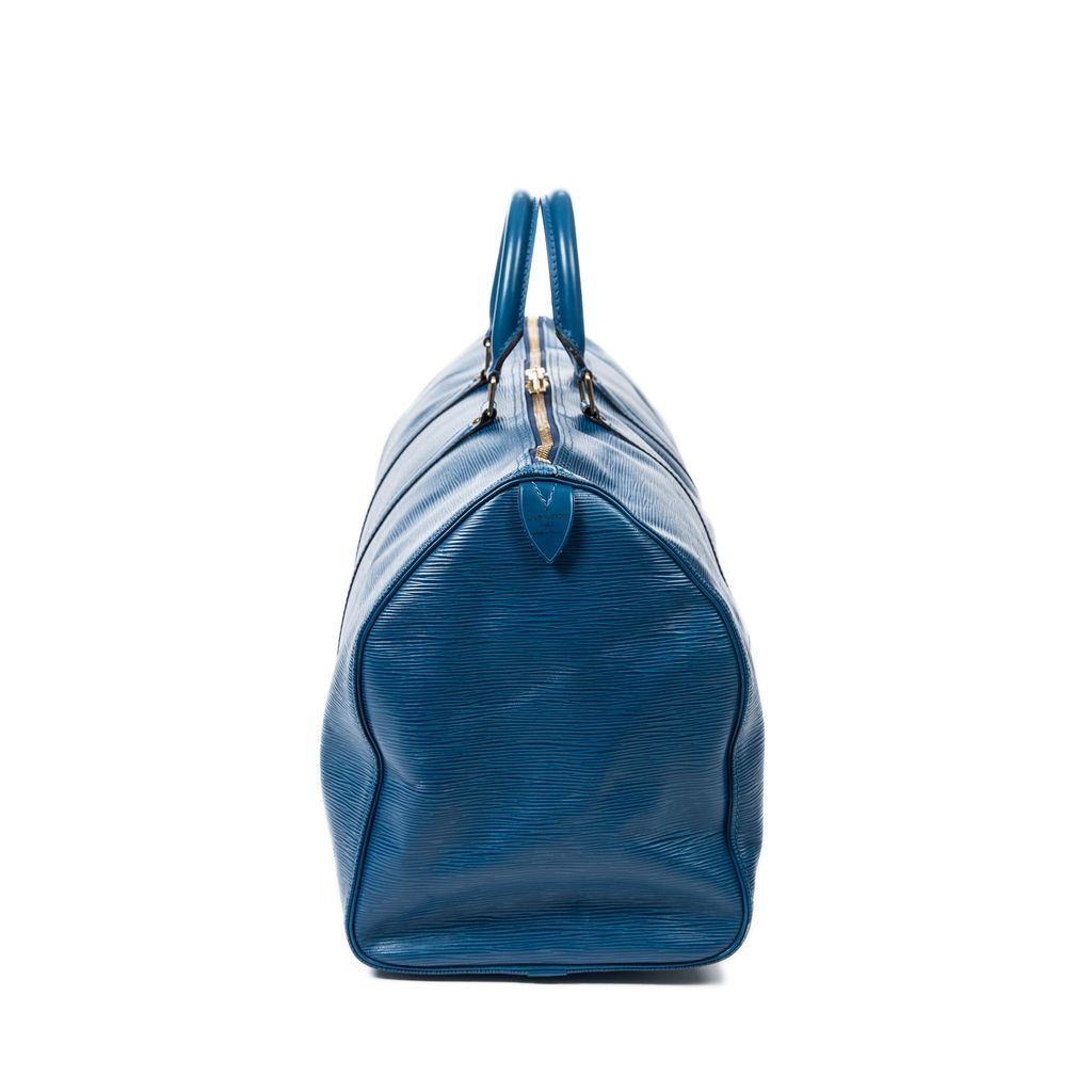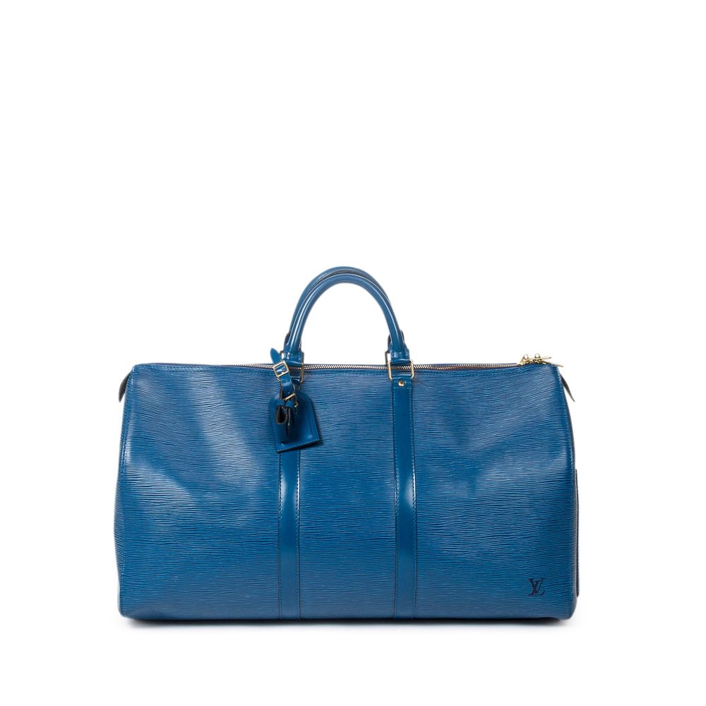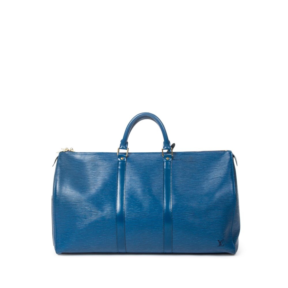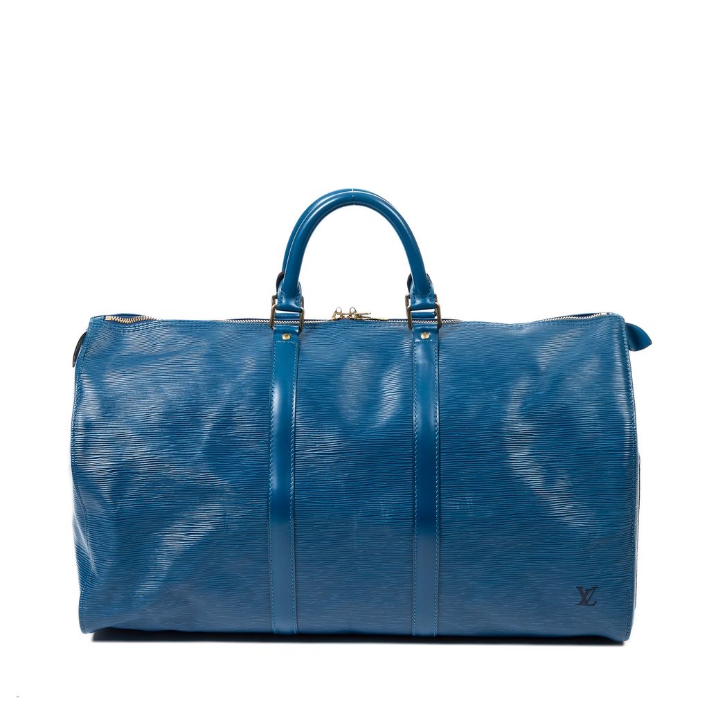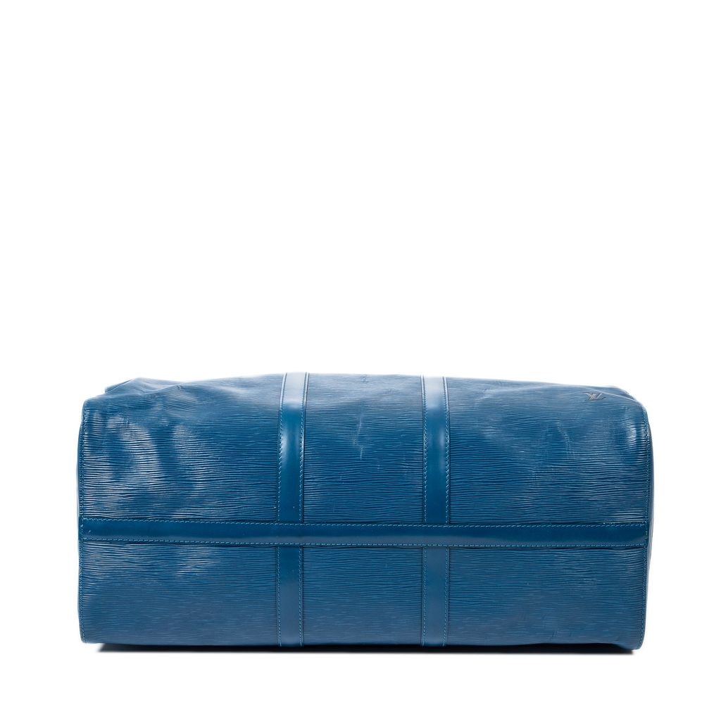 A vintage Louis Vuitton blue calf leather Keepall bag with a certificate of authenticity, Approximately 29cm height, 52cm width.