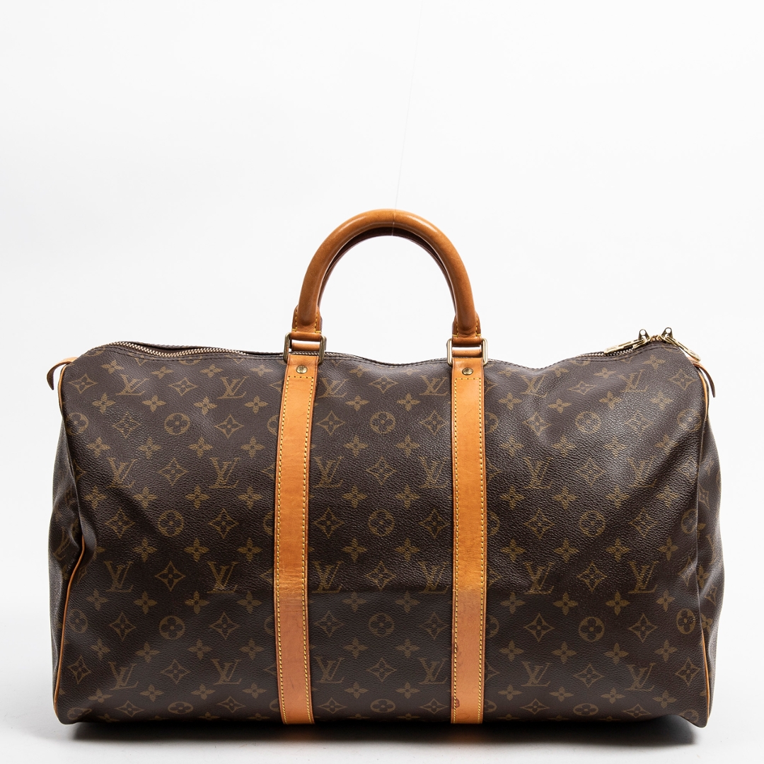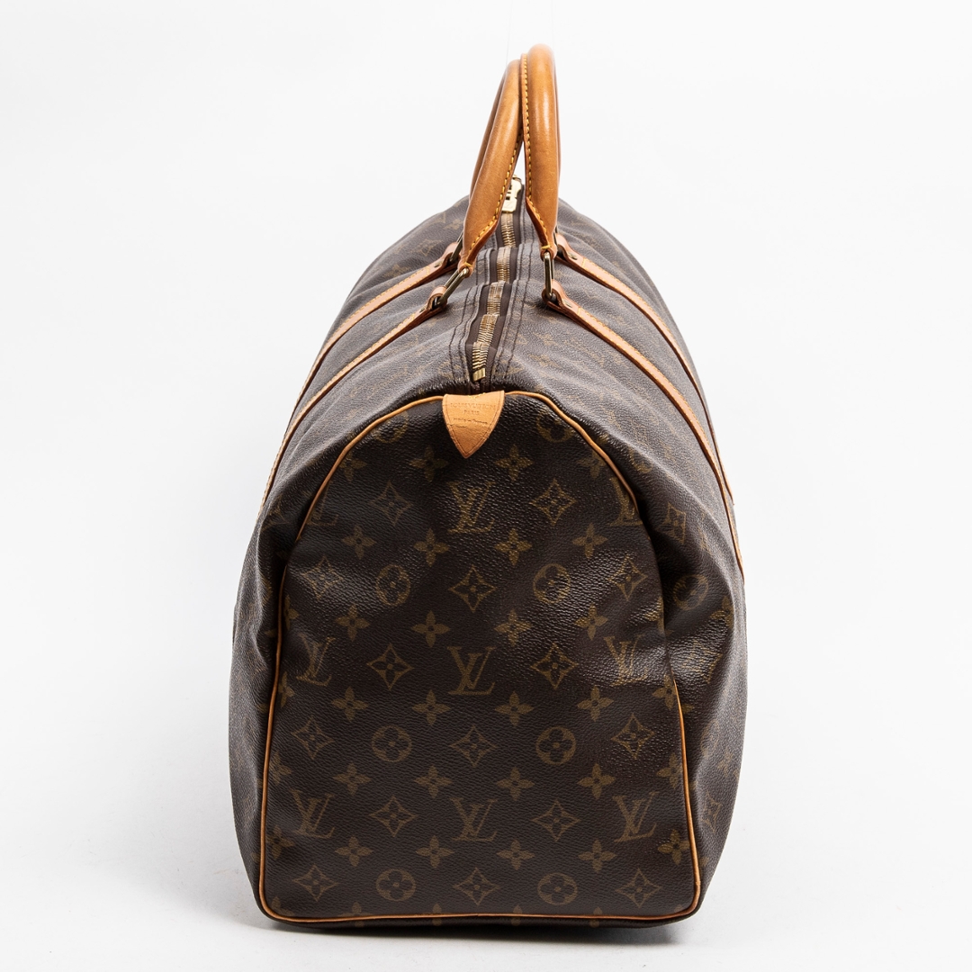 A vintage Louis Vuitton monogram coated canvas Keepall bag, showcasing one of the most recognisable and enduring travel designs in luxury fashion. Crafted from the iconic monogram canvas, it is complemented by natural leather trims, structured rolled handles, and signature gold-tone hardware, delivering a timeless and instantly recognisable aesthetic.