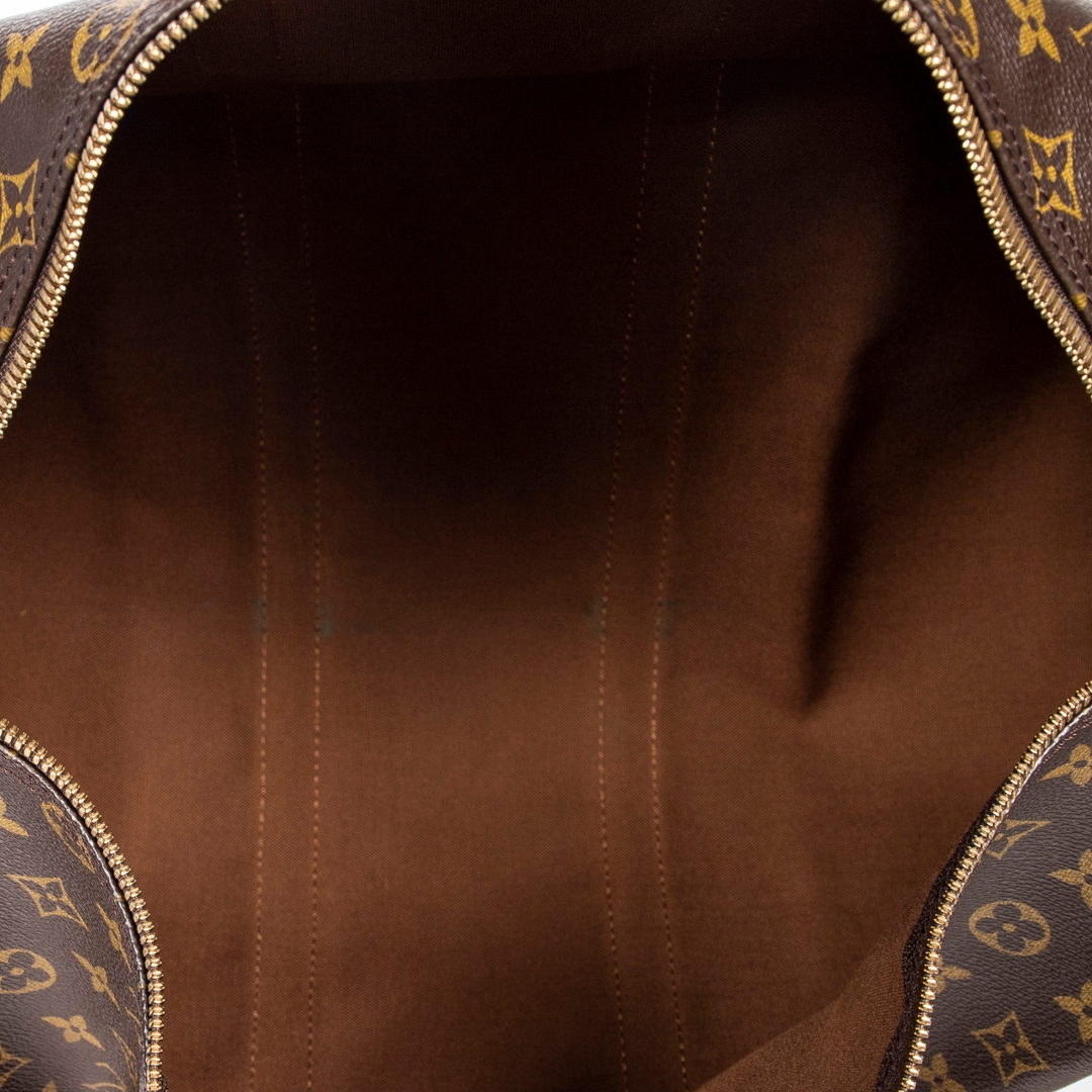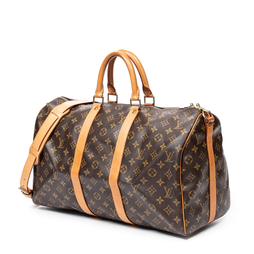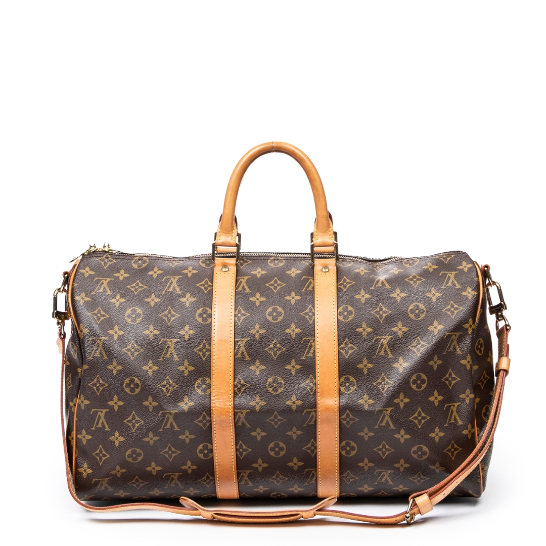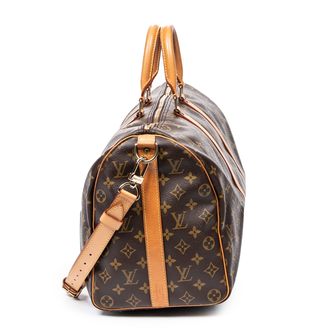 A vintage Louis Vuitton Keepall Bandoulière bag crafted in the iconic brown Monogram coated canvas, representing one of the house’s most celebrated travel designs. The classic silhouette is enhanced by natural leather trim, rolled top handles, and the addition of a detachable shoulder strap, offering both timeless style and versatile functionality.