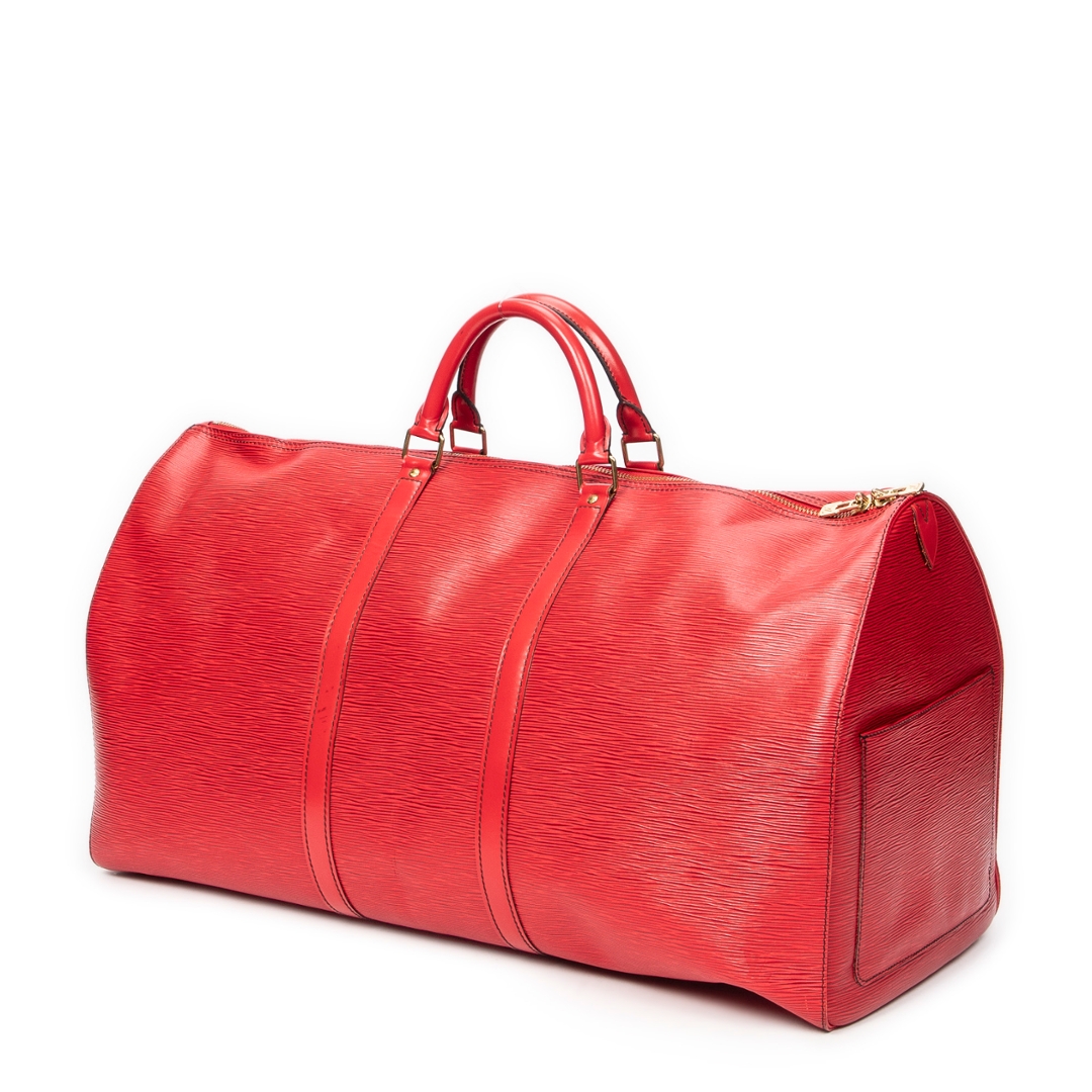 A vintage Louis Vuitton Keepall bag crafted in striking red calf leather, featuring the house’s signature textured finish and distinctive black contrast stitching. This bold interpretation of the classic travel silhouette is complemented by matching rolled handles and gold-tone hardware, delivering a statement piece that blends heritage design with a contemporary edge.