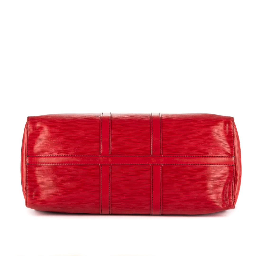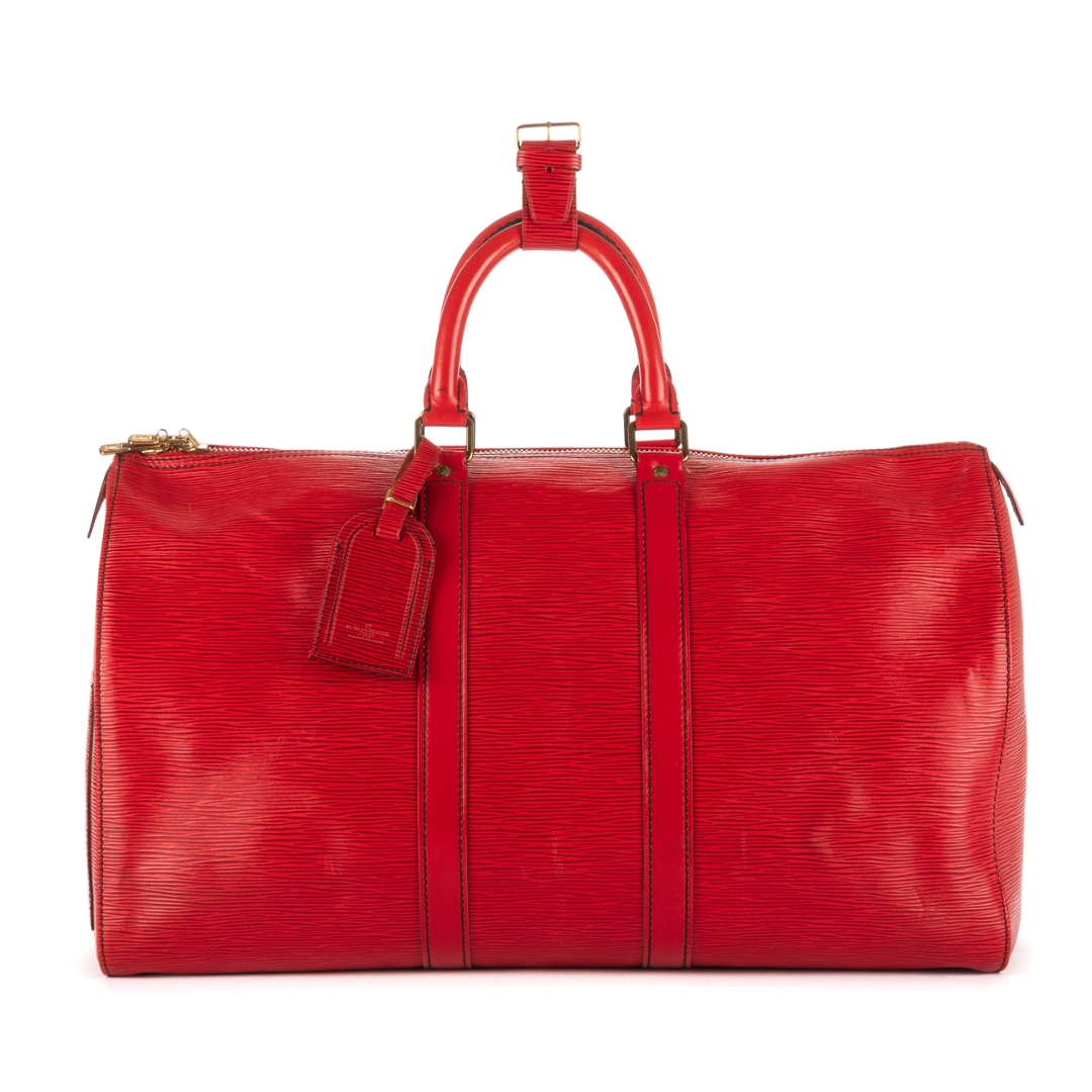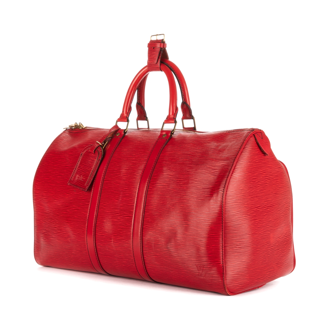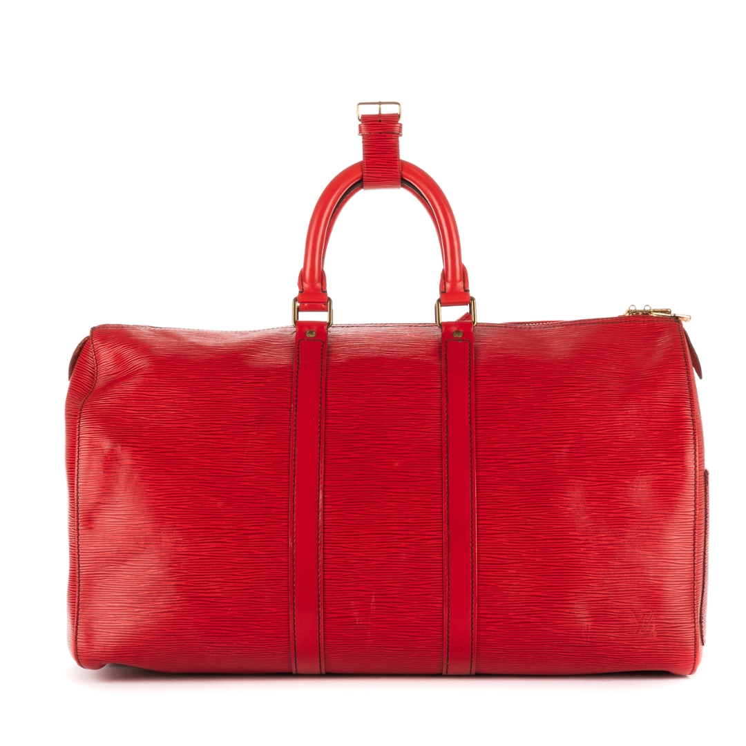 A vintage Louis Vuitton red calf leather Keepall Black Stitchings bag with a certificate of authenticity. Approximately 28cm height, 46cm width.
