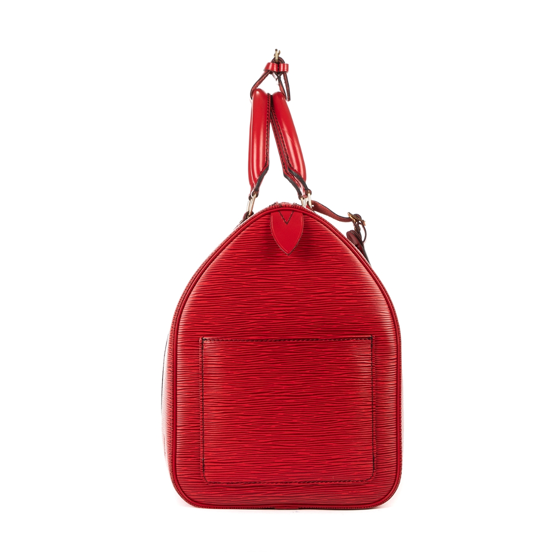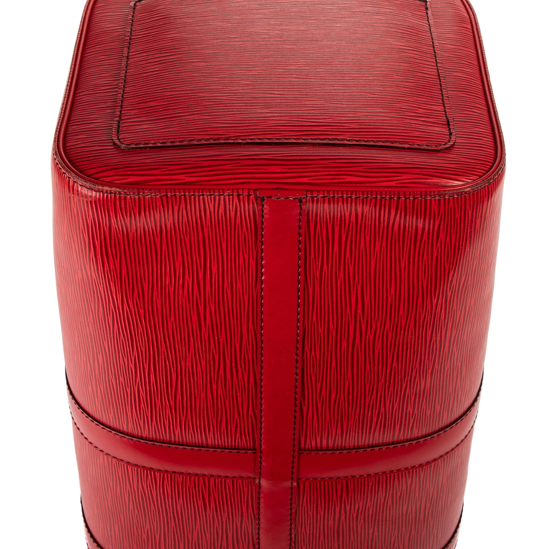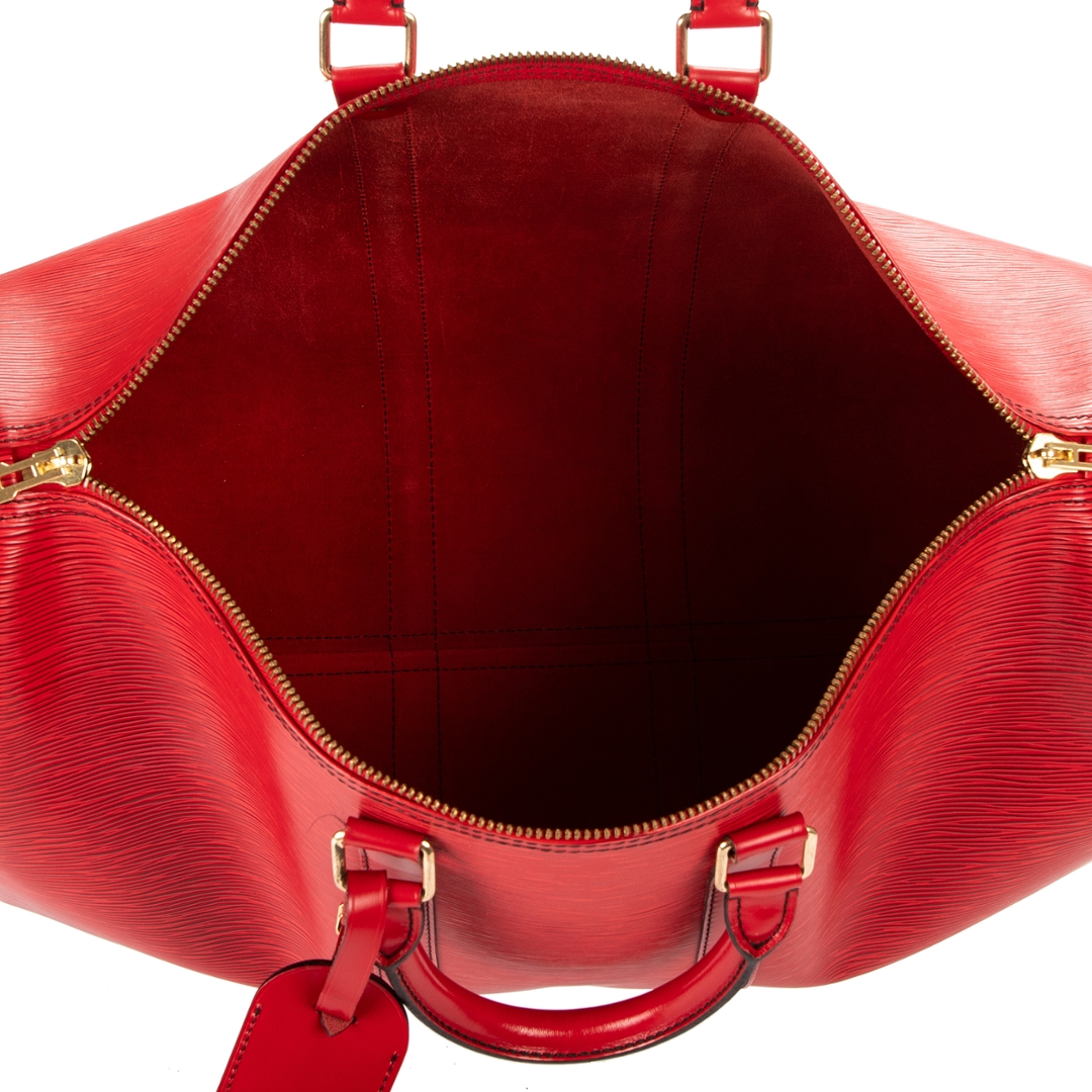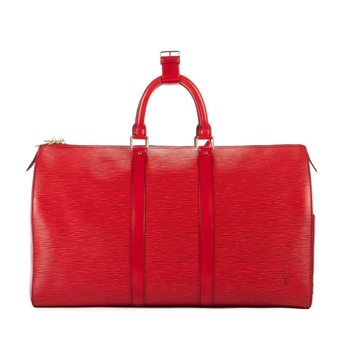 A vintage Louis Vuitton red calf leather Keepall Black Stitchings bag with a certificate of authenticity, Approximately 28cm height, 48cm width.