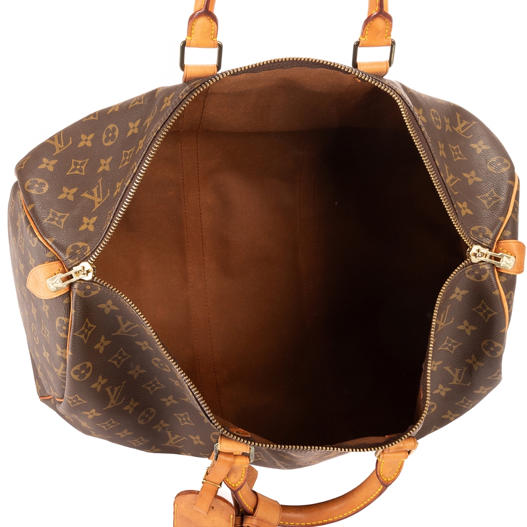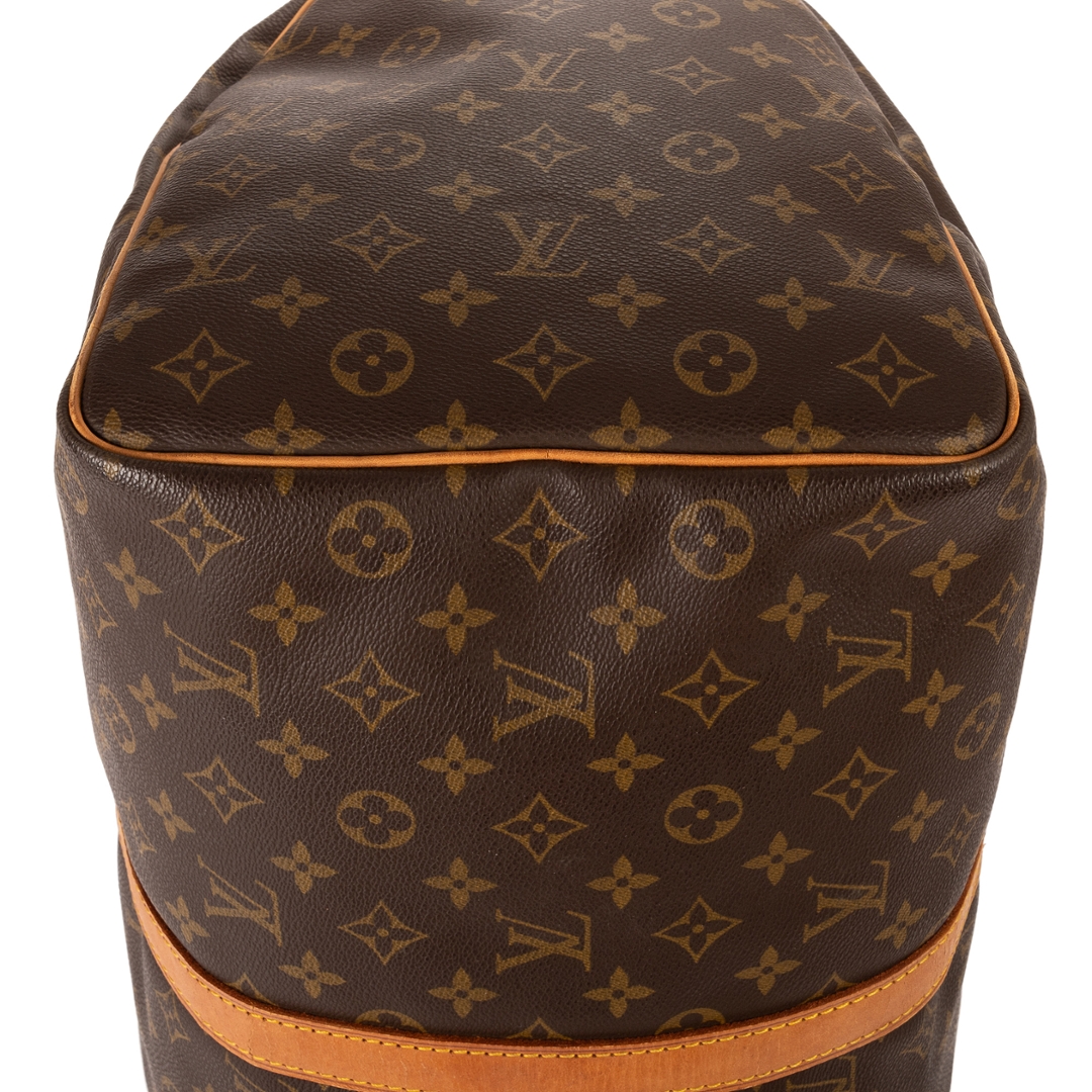 A vintage Louis Vuitton monogram coated canvas Keepall bag with a certificate of authenticity. Approximately 26cm height, 50cm width.