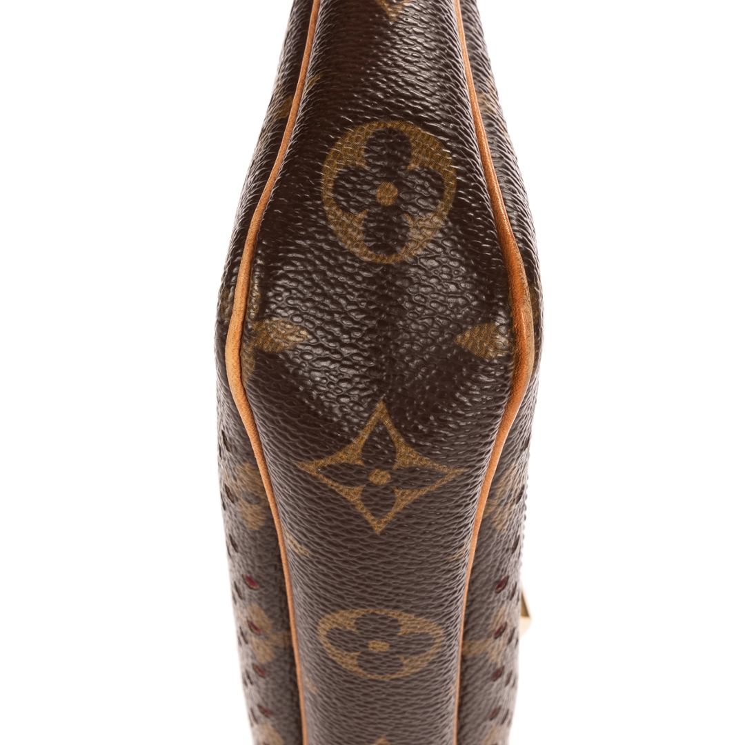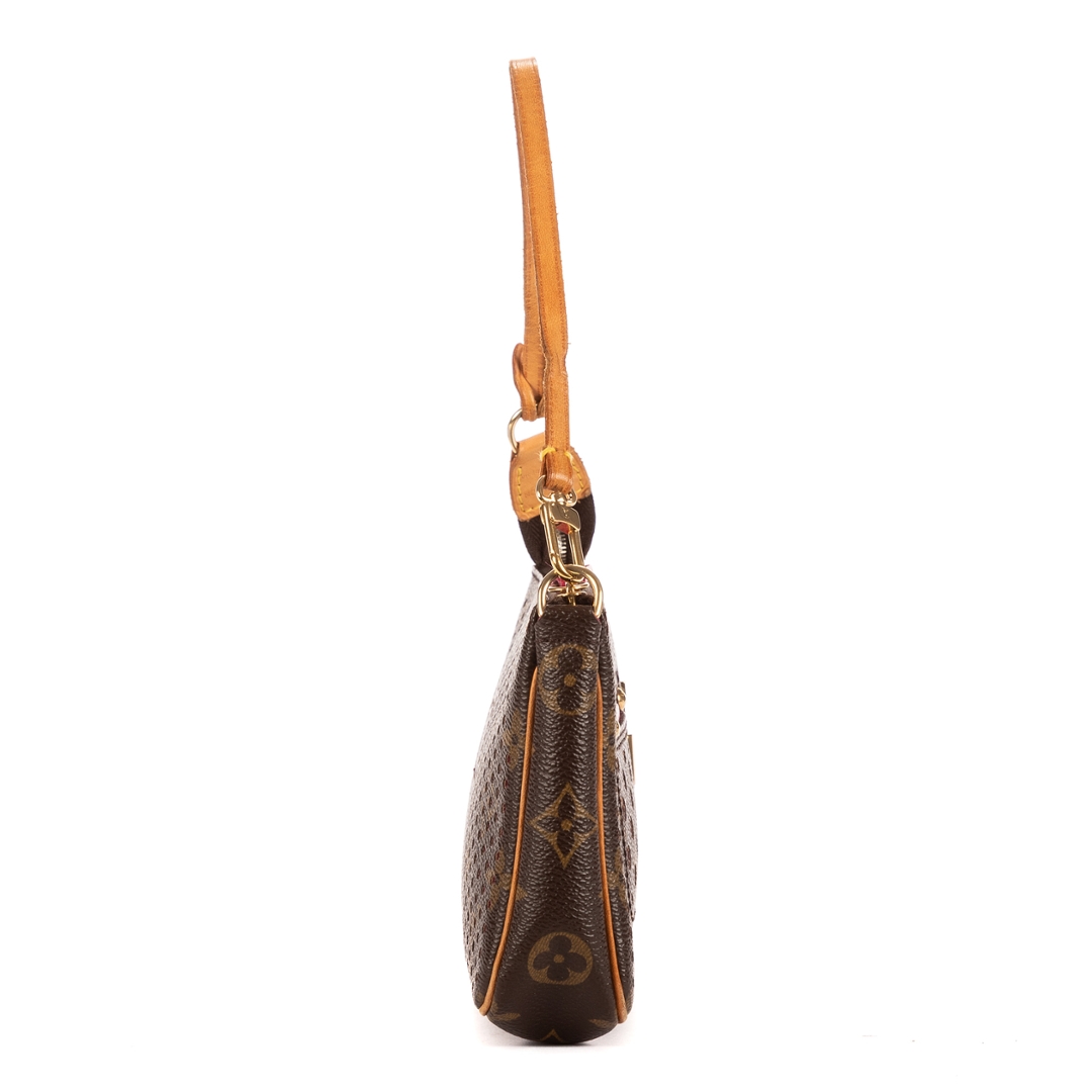 A vintage Louis Vuitton brown/fuchsia coated canvas Ltd. Ed. Monogram Perforated 2006 Accessory Pouch bag with a certificate of authenticity, Approximately 13cm height, 21cm width.