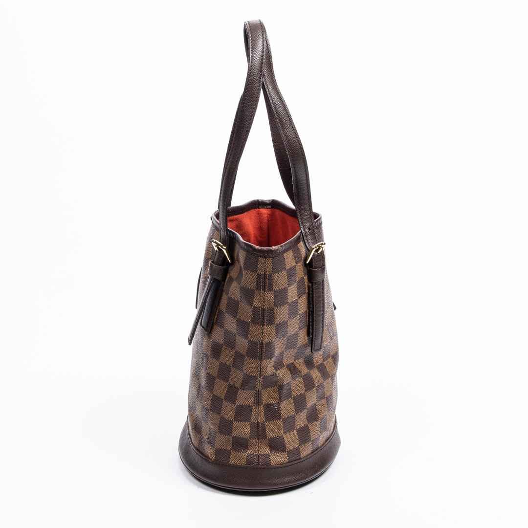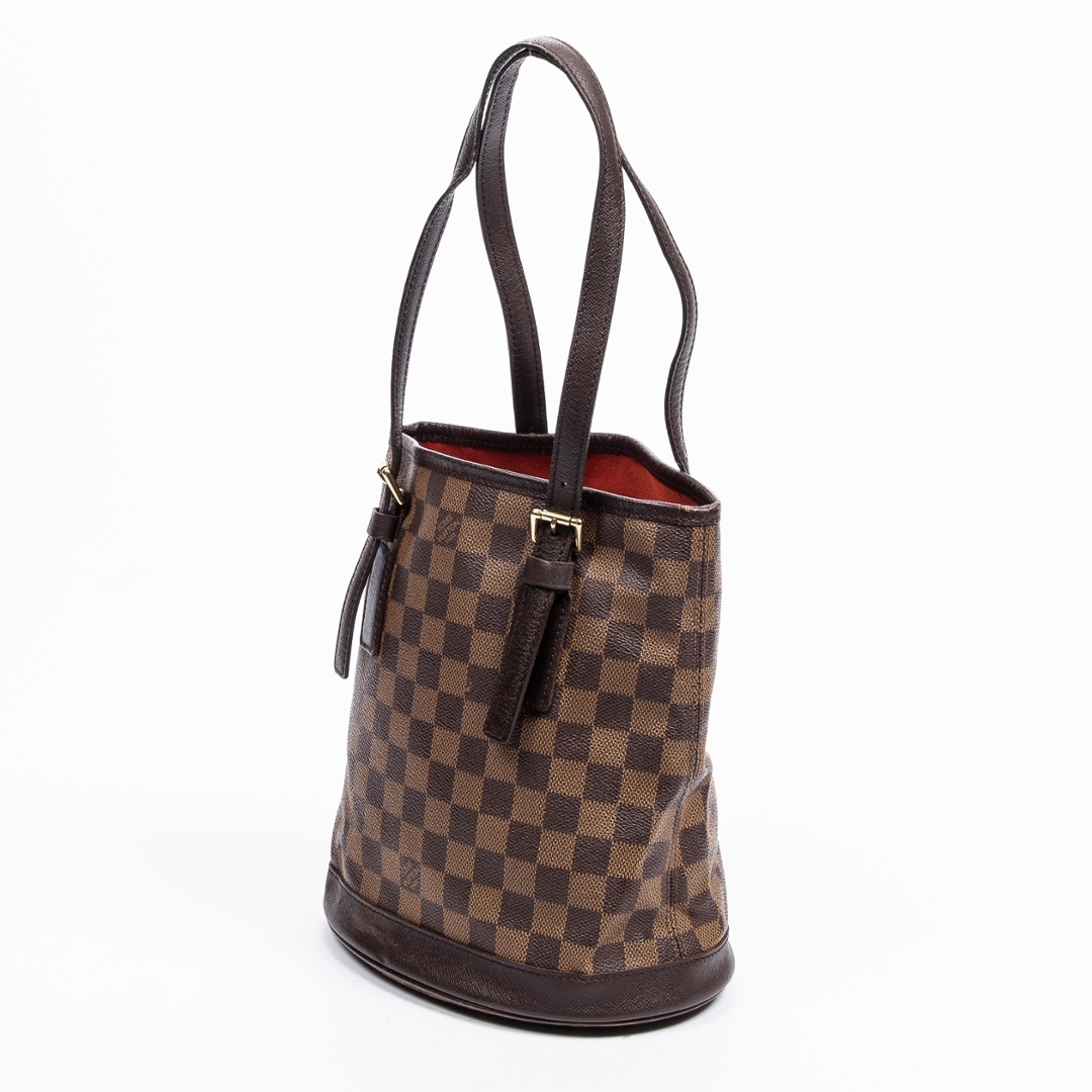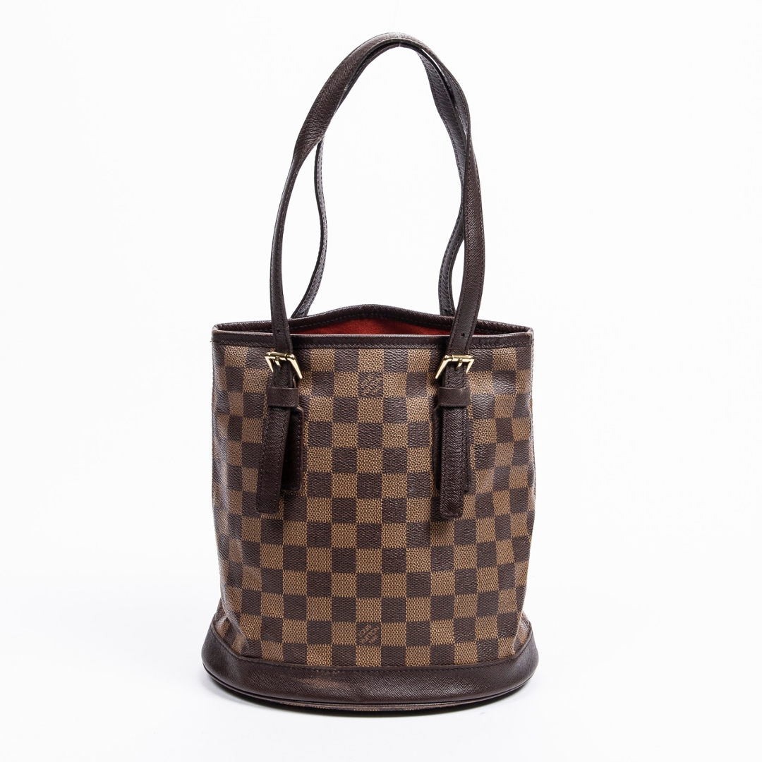 A vintage Louis Vuitton Marais bag crafted in the iconic brown Damier Ebene coated canvas, presenting a structured bucket-style silhouette that reflects the brand’s timeless and practical design ethos. The piece is finished with smooth leather trim, adjustable shoulder straps with buckle detailing, and subtle gold-tone hardware, offering a refined and versatile everyday bag.