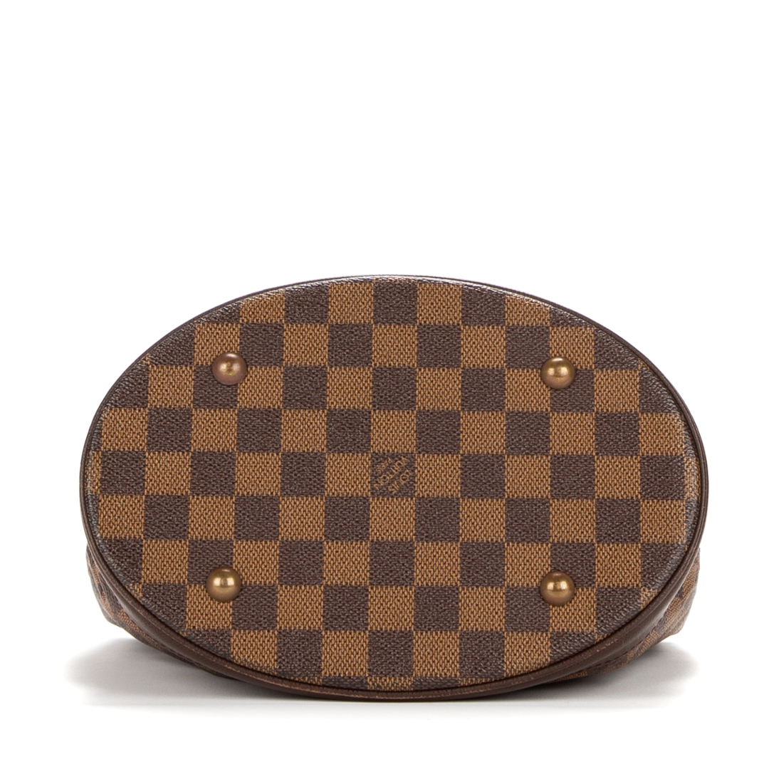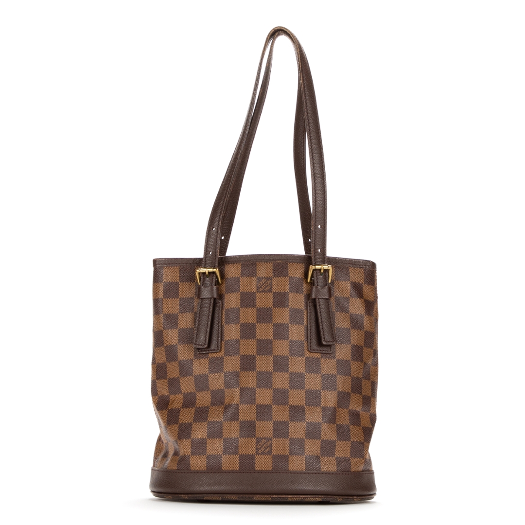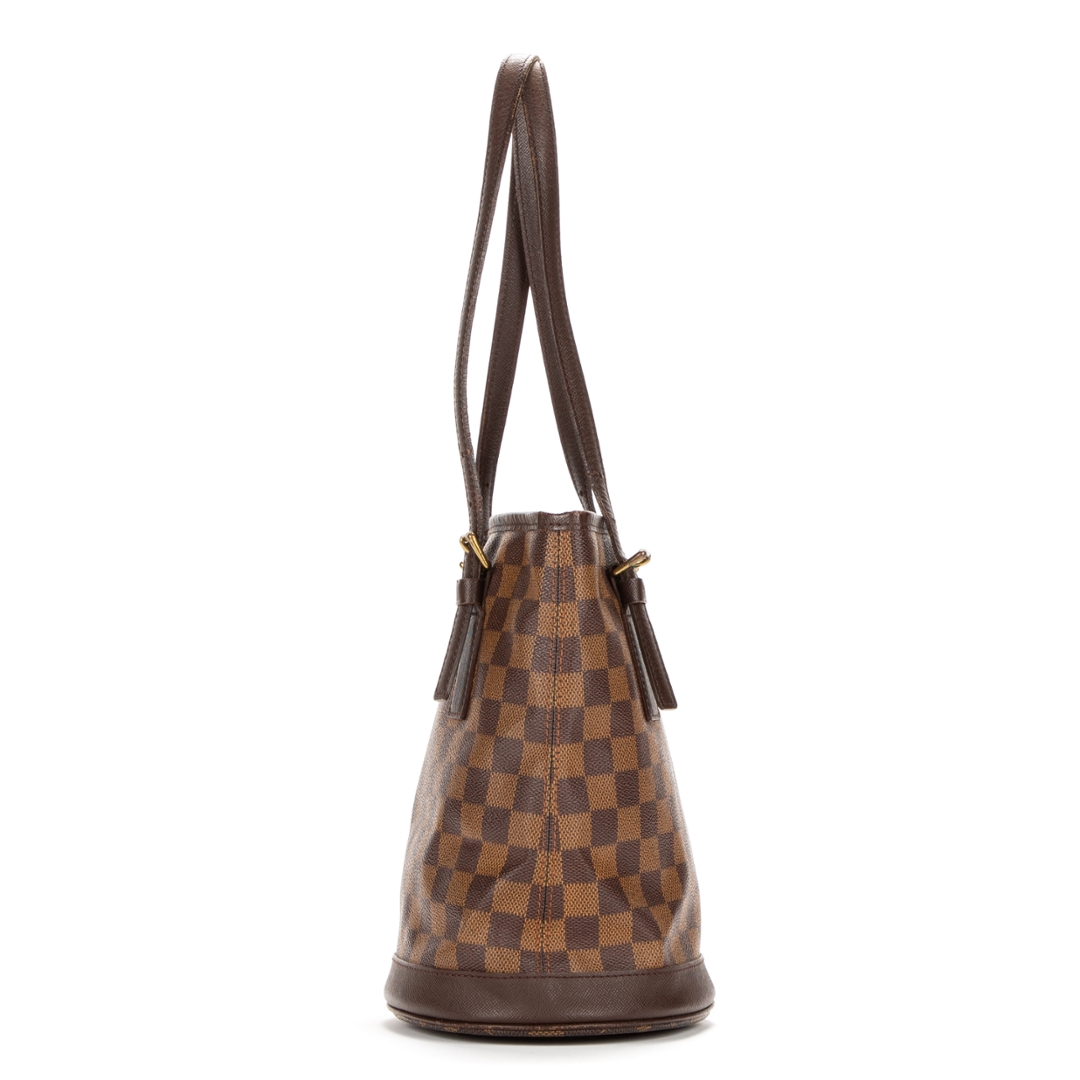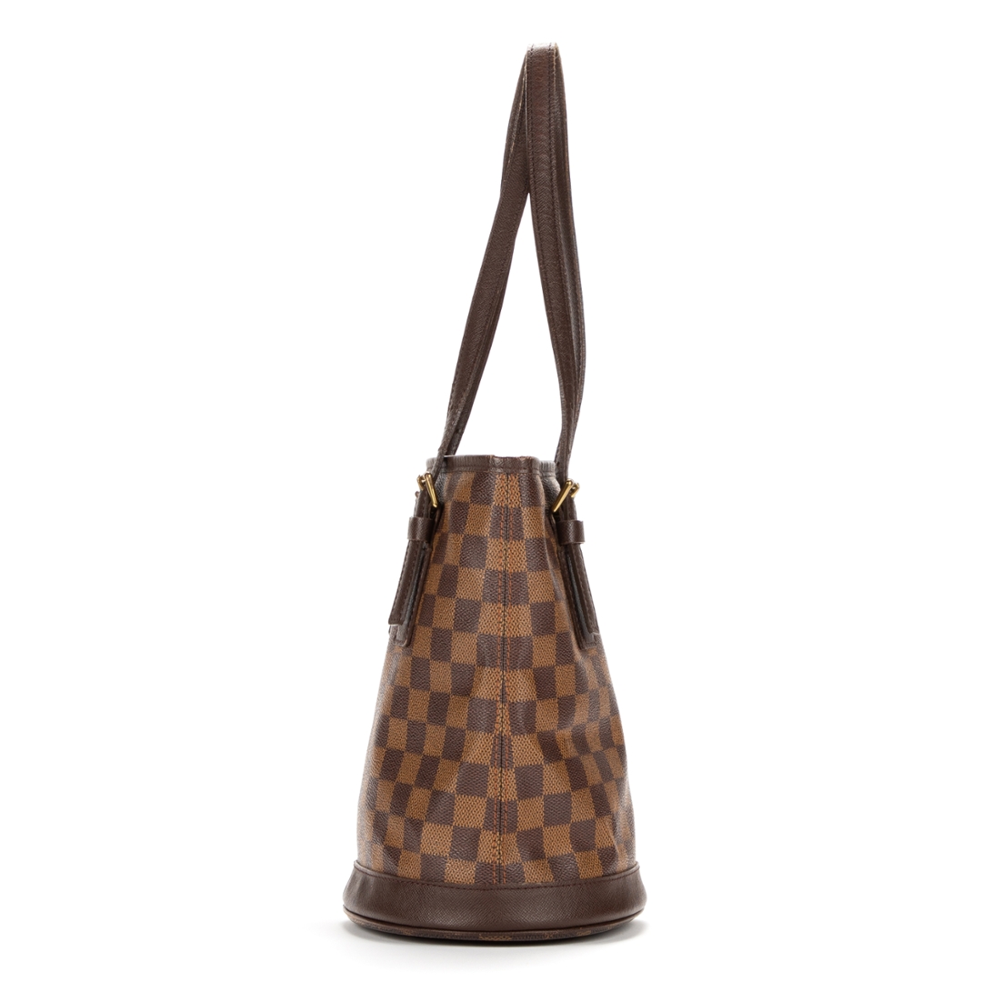 A vintage Louis Vuitton Marais bag crafted in the iconic brown Damier Ebene coated canvas, presenting a structured bucket-style silhouette that reflects the brand’s timeless and practical design ethos. The piece is finished with smooth leather trim, adjustable shoulder straps with buckle detailing, and subtle gold-tone hardware, offering a refined and versatile everyday bag.