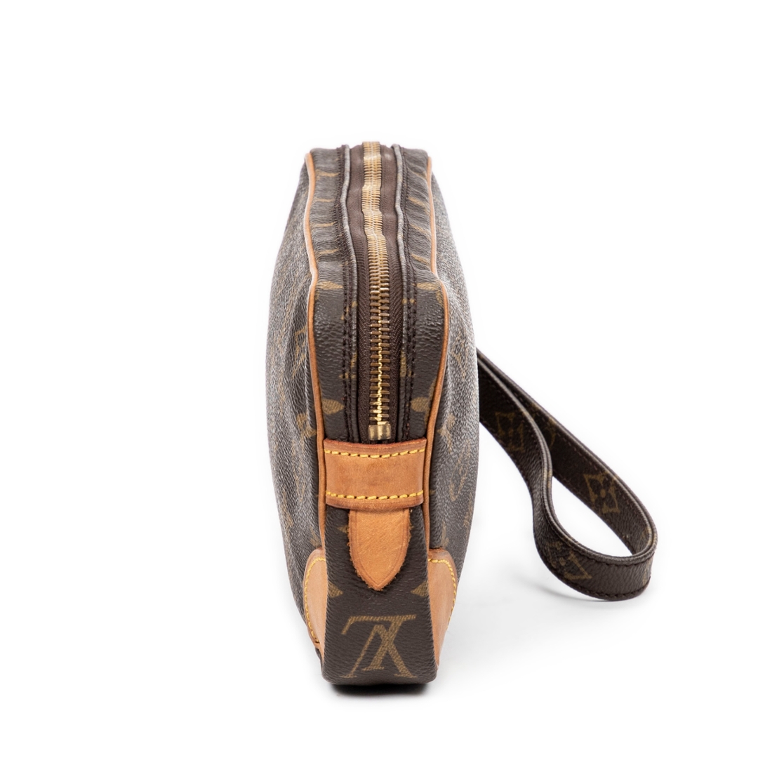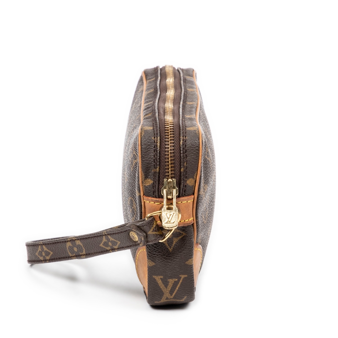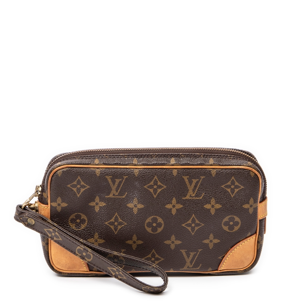 A vintage Louis Vuitton Marly Dragonne bag crafted in the iconic brown Monogram coated canvas, offering a sleek and compact design rooted in the brand’s timeless aesthetic. The piece is enhanced by natural leather trim and subtle detailing, delivering a refined accessory that perfectly reflects Louis Vuitton’s heritage craftsmanship.