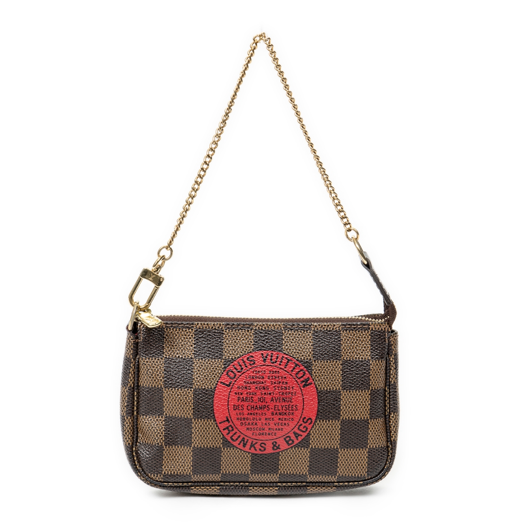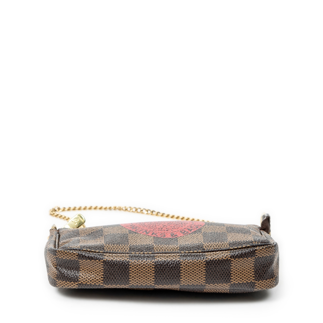 A vintage Louis Vuitton damier coated canvas Mini Pochette Accessoires bag with a certificate of authenticity, Approximately 10cm height, 15cm width.