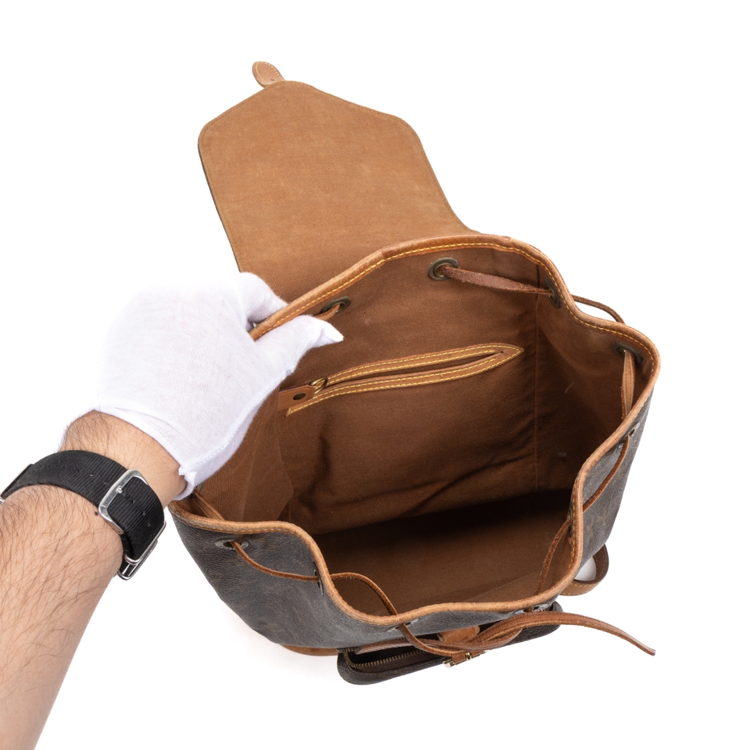A vintage Louis Vuitton Montsouris bag crafted in the iconic brown Monogram coated canvas, paired with natural leather trim and gold-tone hardware. This timeless backpack design showcases the house’s signature aesthetic, with a structured yet relaxed silhouette, front zip pocket, and drawstring closure secured by a buckle-fastened flap.