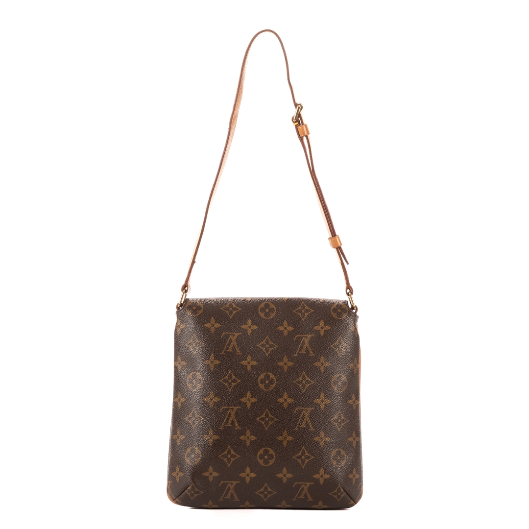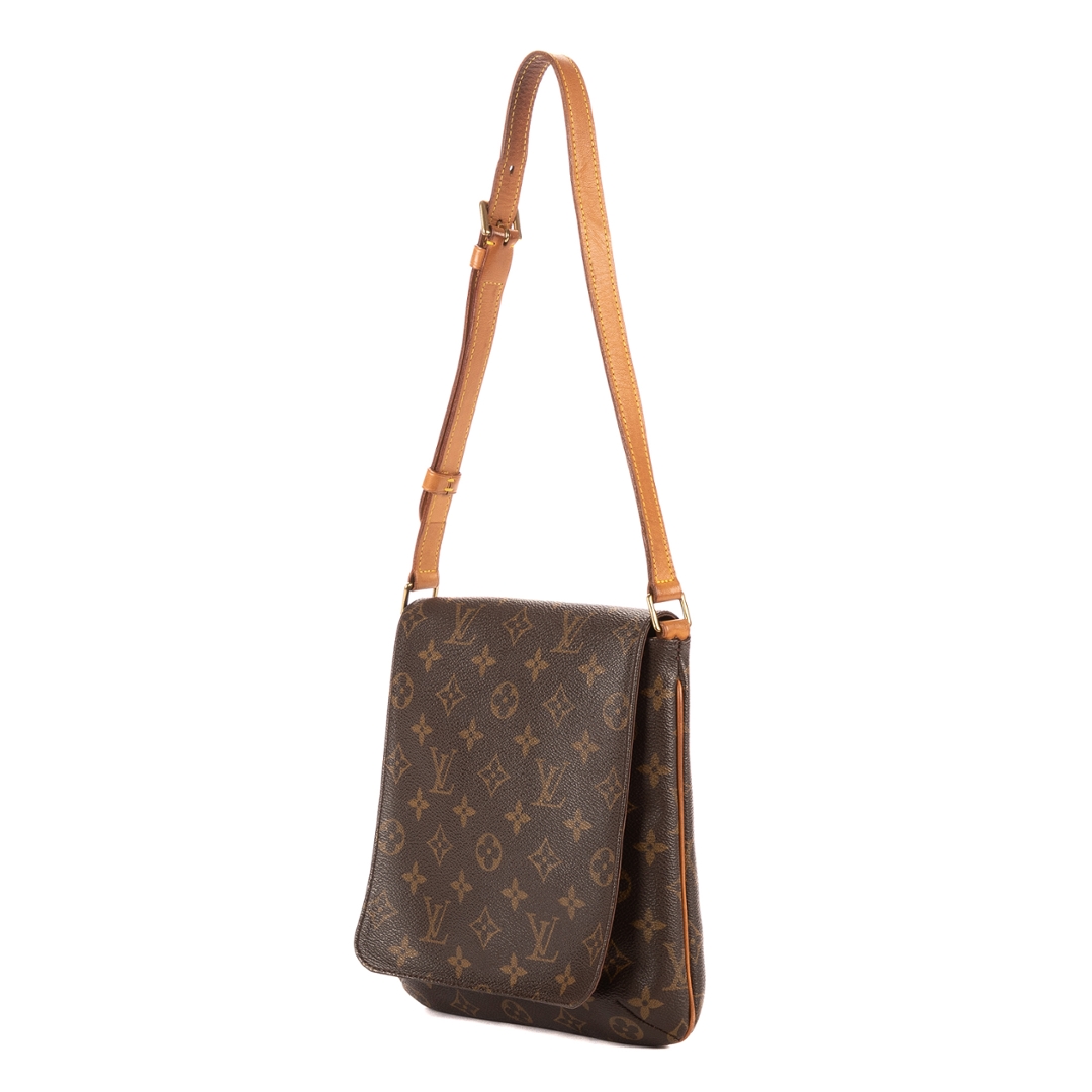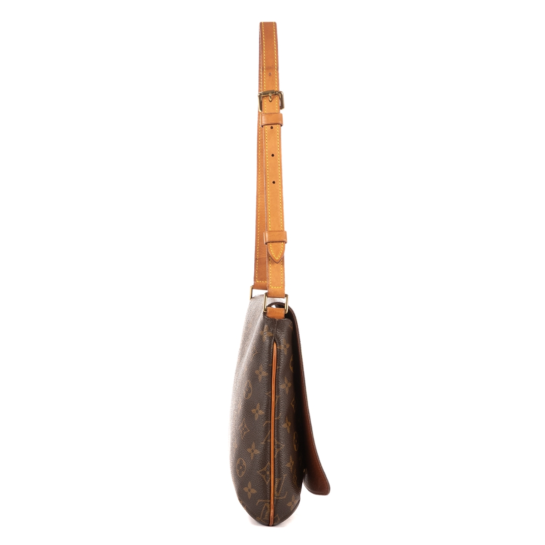 A vintage Louis Vuitton Musette Salsa bag crafted in the iconic brown Monogram coated canvas, complemented by natural leather trim and gold-tone hardware. This refined shoulder style highlights the house’s timeless design, featuring a sleek flap-front closure and a softly structured silhouette.