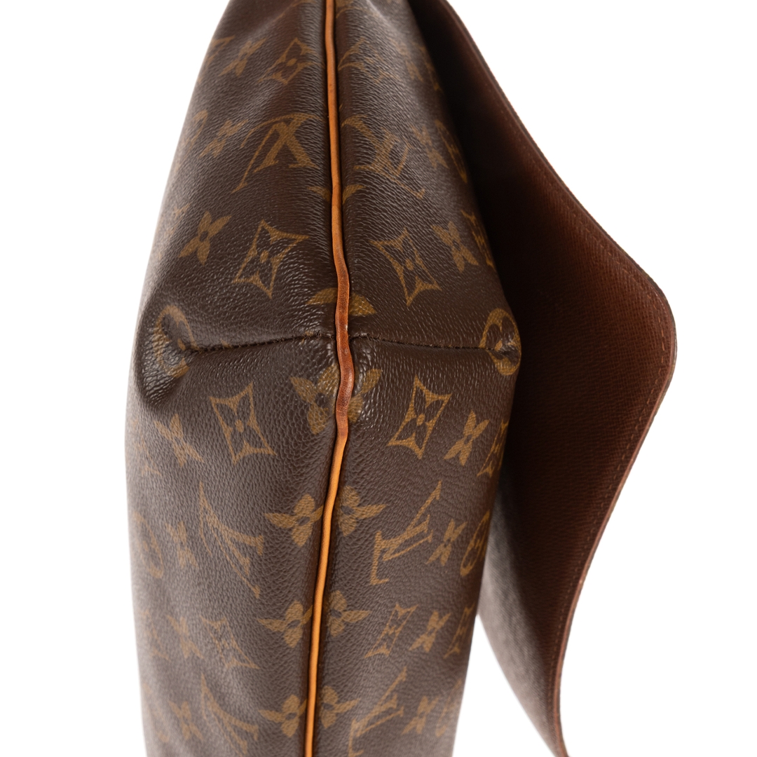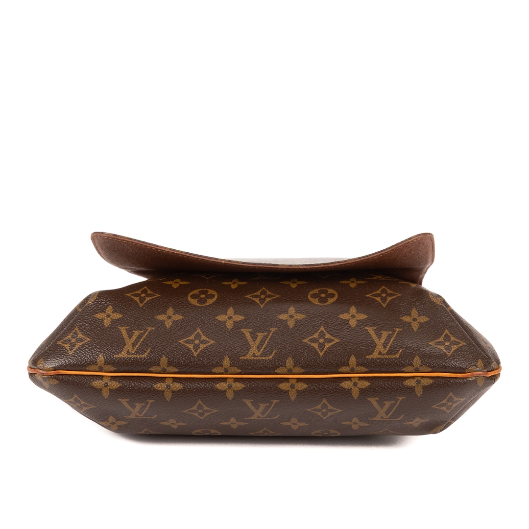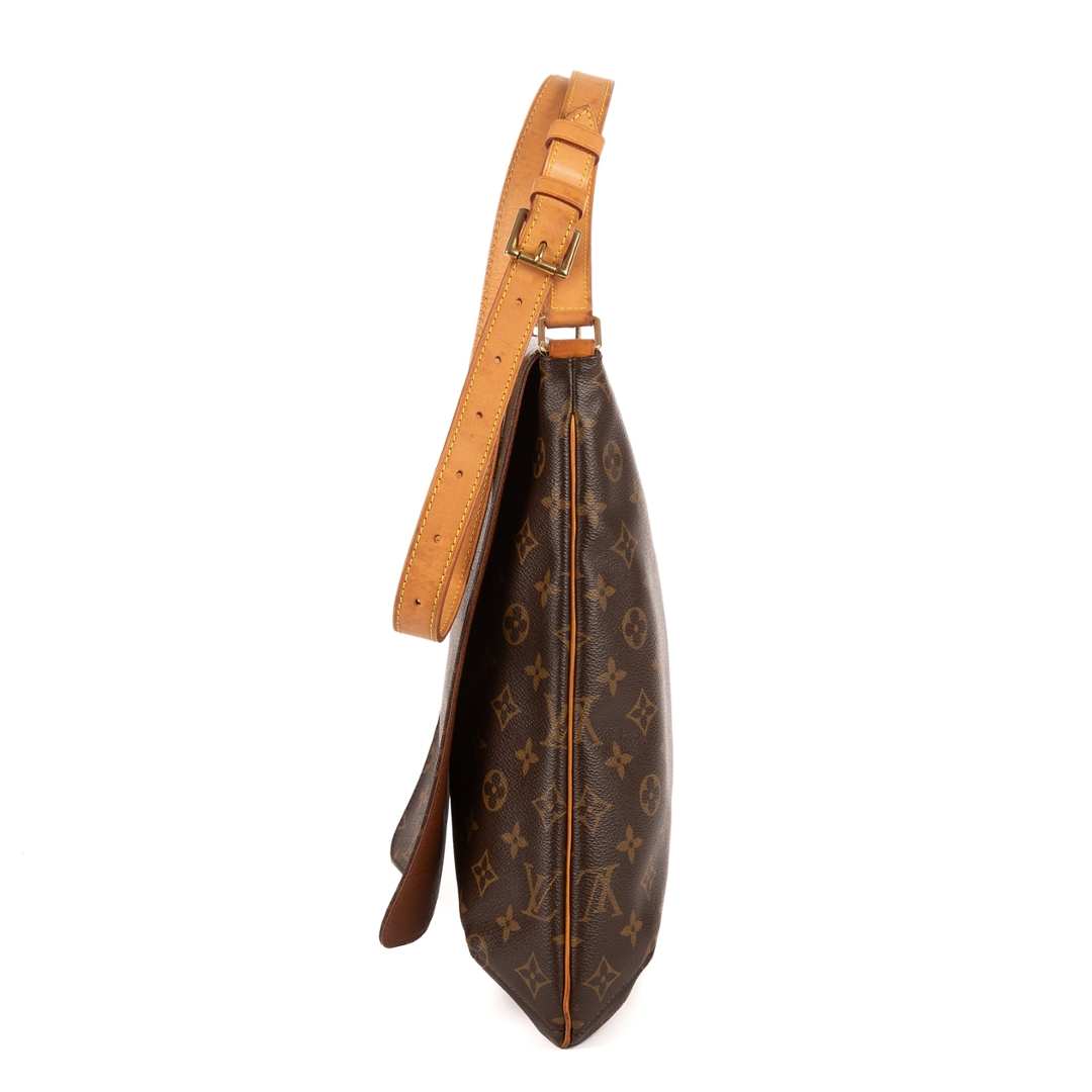 A vintage Louis Vuitton Musette Salsa Long Strap bag crafted in the iconic brown Monogram coated canvas, complemented by natural leather trim and gold-tone hardware. The sleek, structured silhouette highlights the enduring appeal of this classic design, with the longer adjustable strap offering added versatility for modern wear.