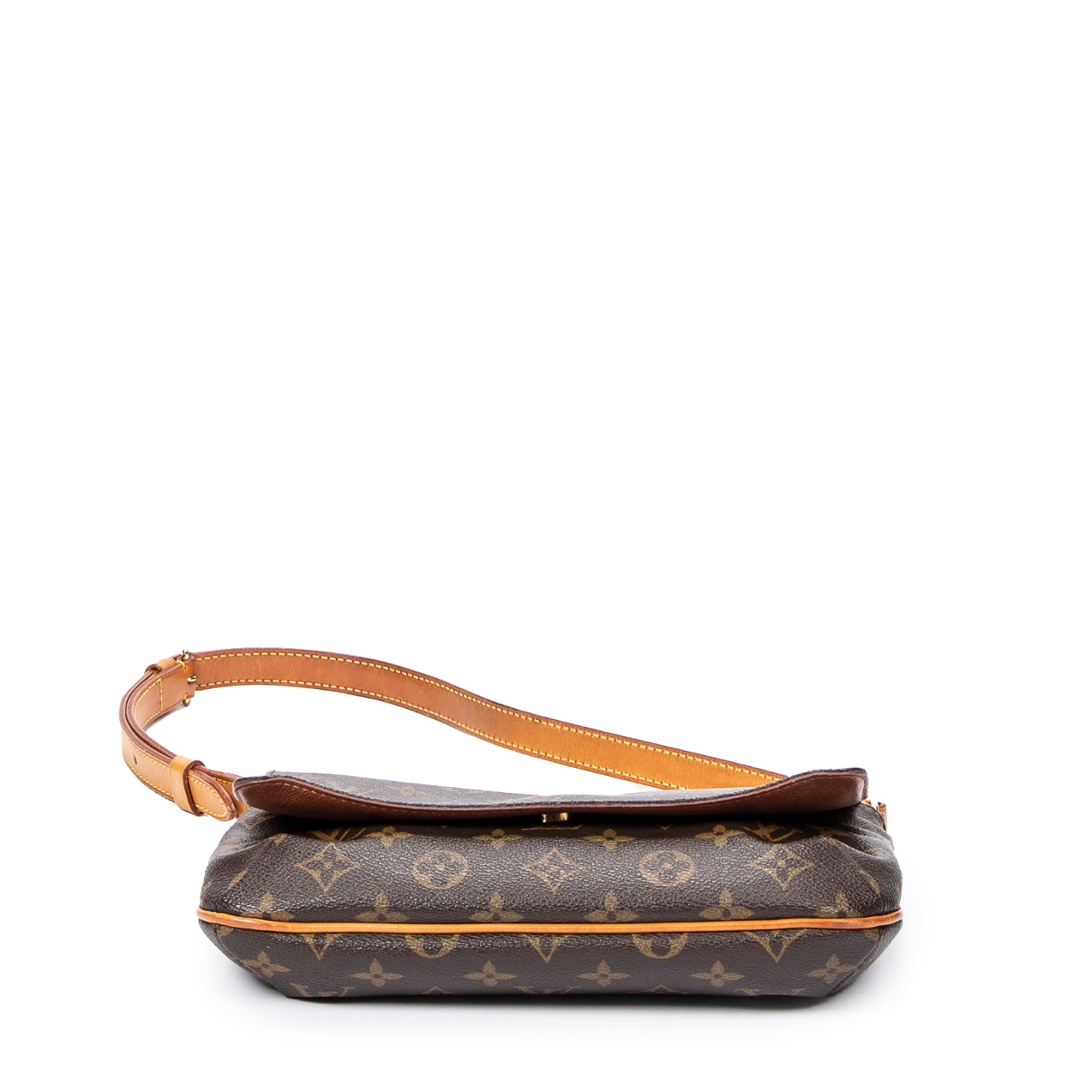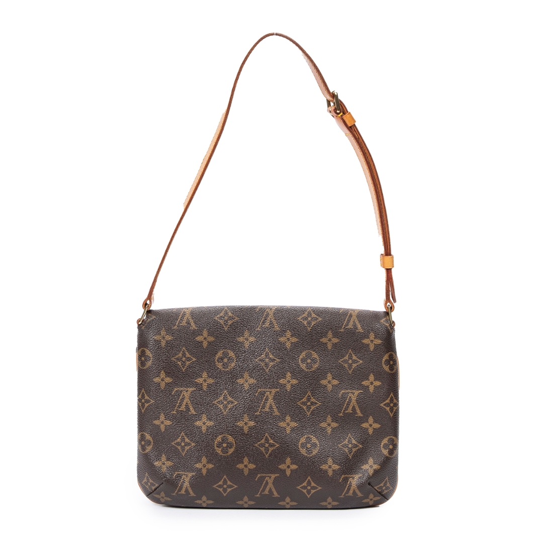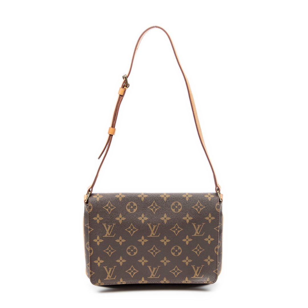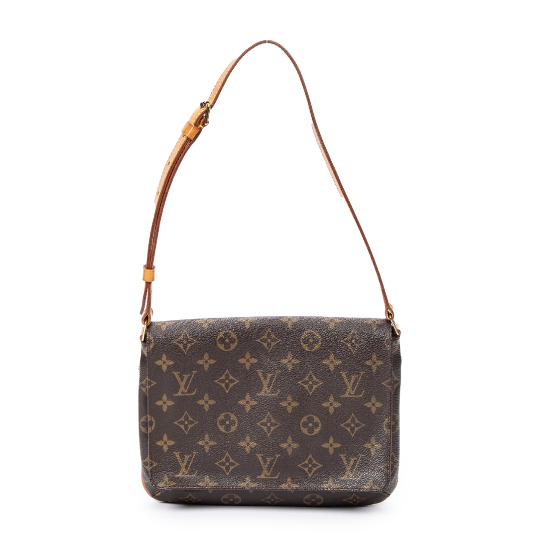A vintage Louis Vuitton Musette Tango bag crafted in the iconic brown Monogram coated canvas, complemented by natural leather trim and gold-tone hardware. The compact, softly structured silhouette offers a refined take on everyday styling, with the adjustable strap allowing for a comfortable shoulder carry.