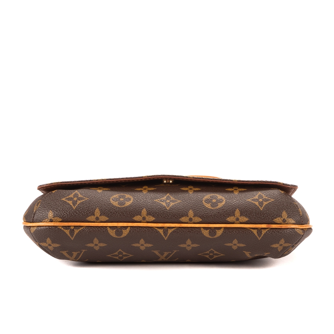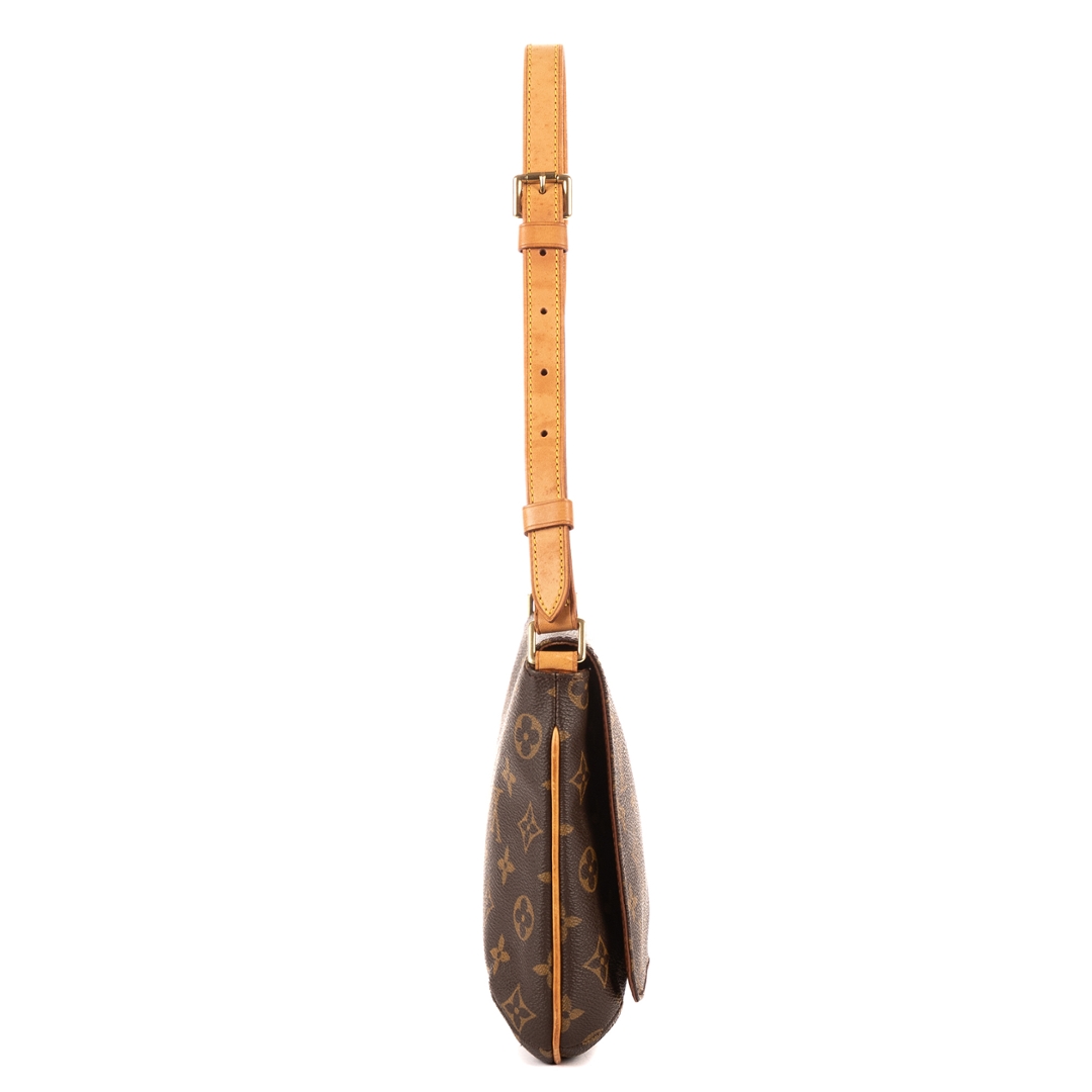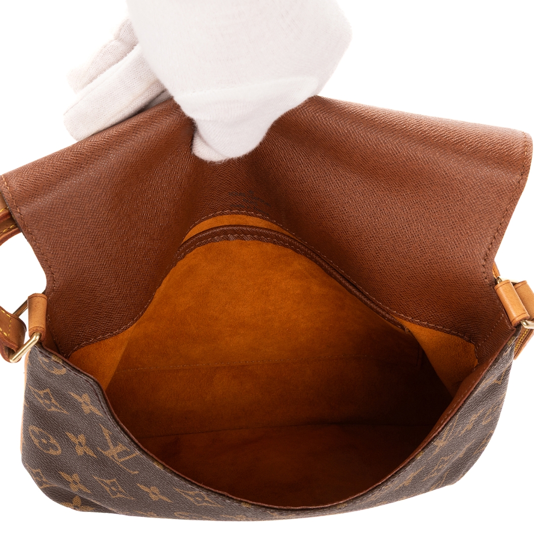 A vintage Louis Vuitton Musette Tango bag crafted in the iconic brown Monogram coated canvas, complemented by natural leather trim and gold-tone hardware. The structured yet lightweight design reflects the enduring appeal of this classic shoulder bag, finished with an adjustable strap for a comfortable and adaptable fit.