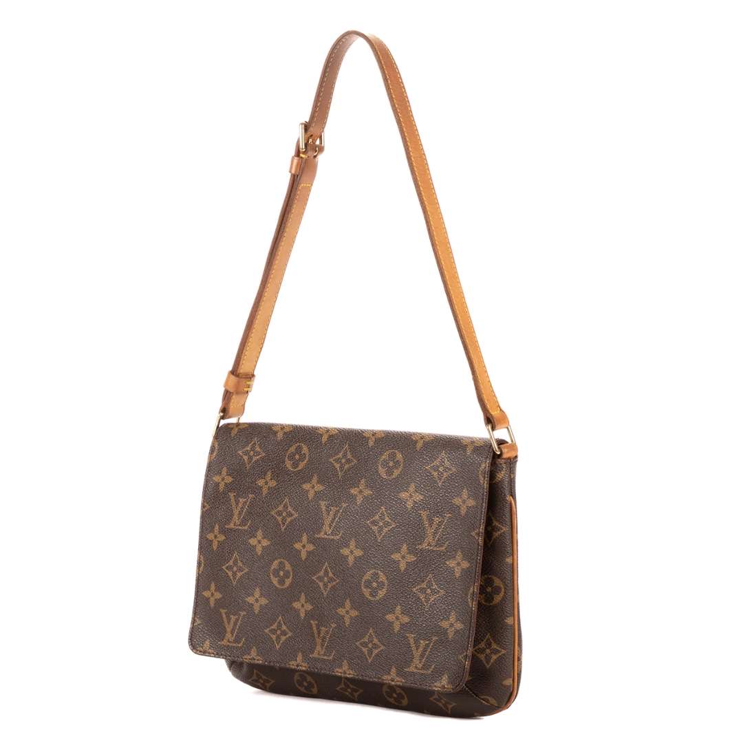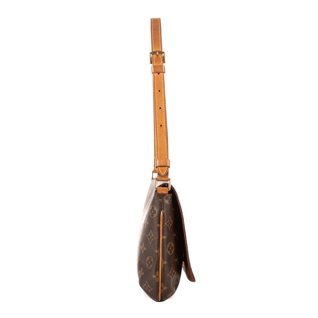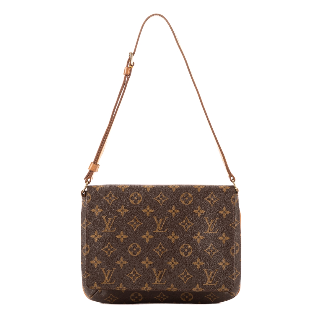 A vintage Louis Vuitton Musette Tango bag crafted in the iconic brown Monogram coated canvas, complemented by natural leather trim and gold-tone hardware. The refined, structured silhouette showcases the timeless appeal of this classic shoulder design, complete with an adjustable strap for comfortable everyday wear.
