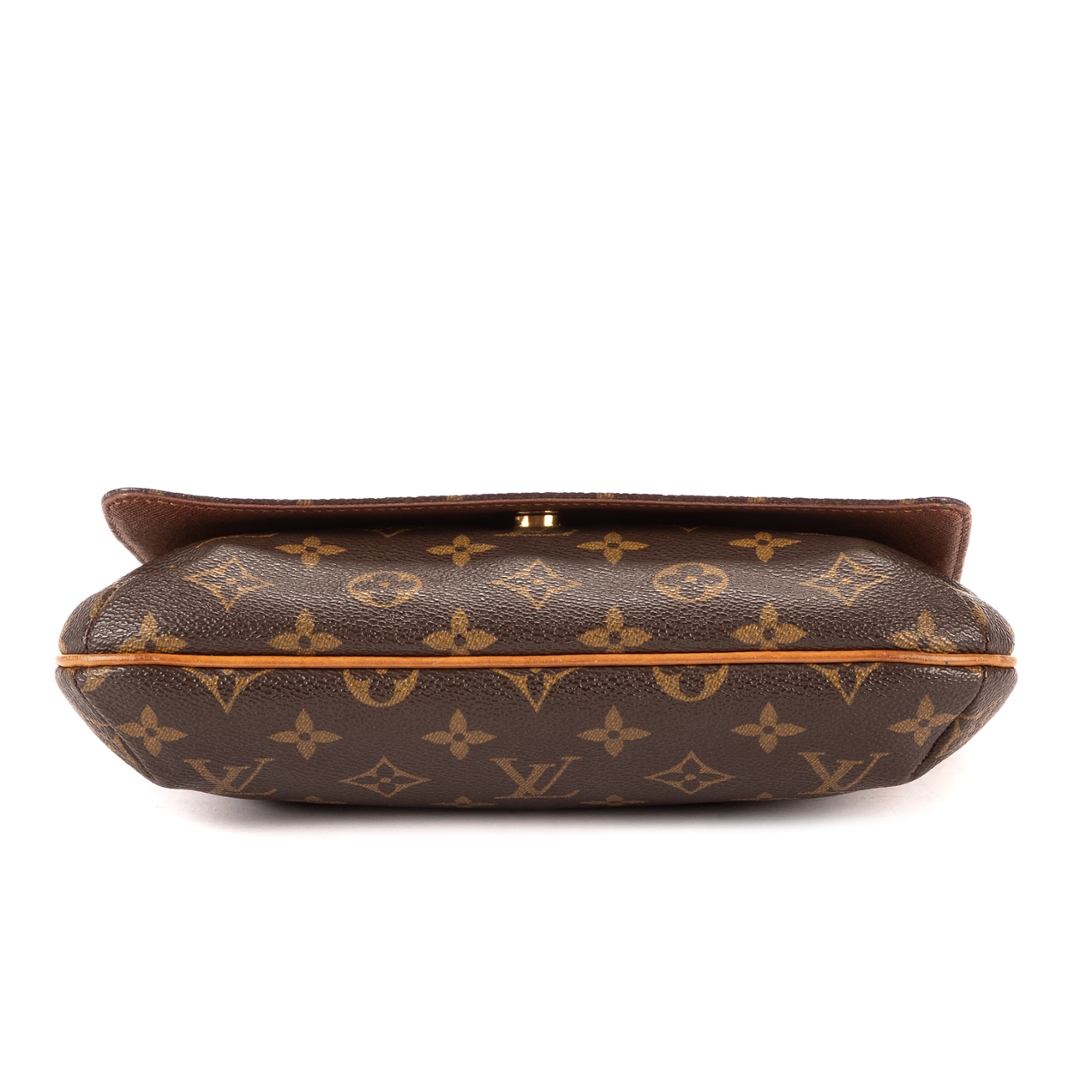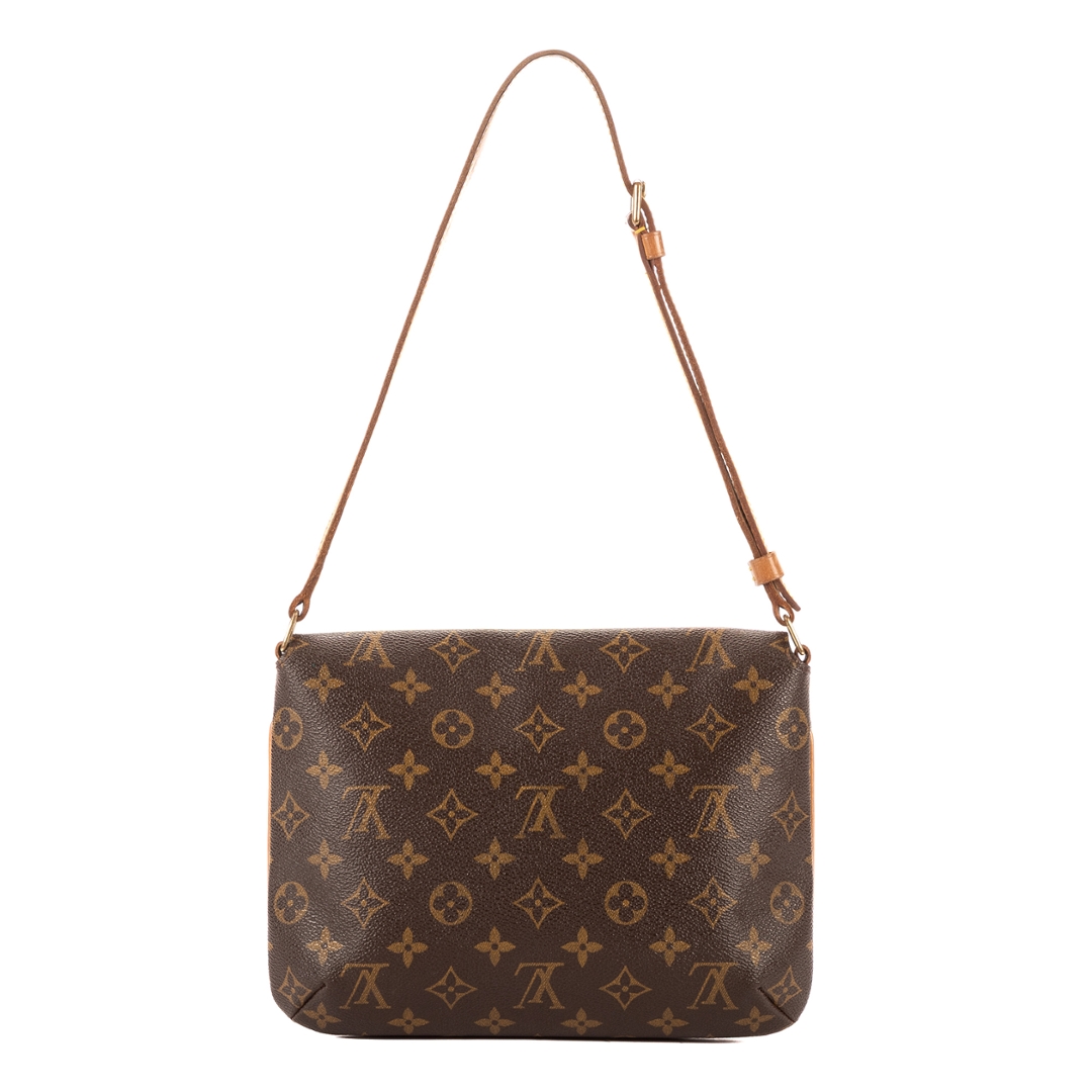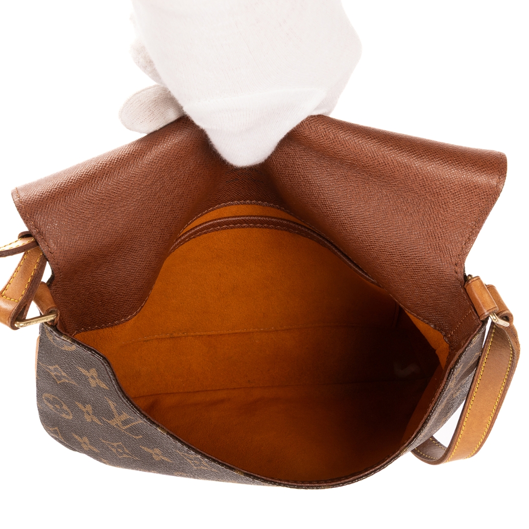 A vintage Louis Vuitton Musette Tango bag crafted in the iconic brown Monogram coated canvas, complemented by natural leather trim and gold-tone hardware. The refined, structured silhouette showcases the timeless appeal of this classic shoulder design, complete with an adjustable strap for comfortable everyday wear.
