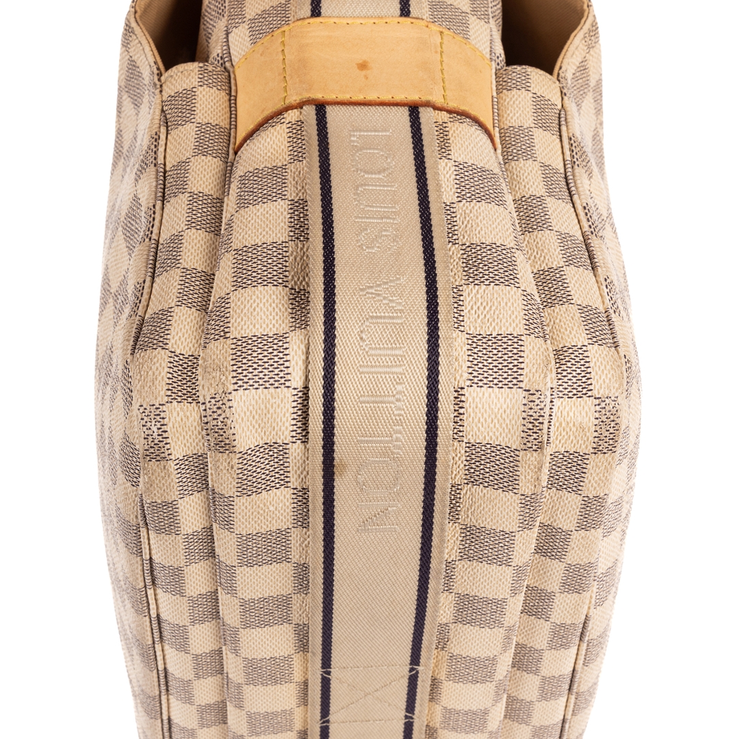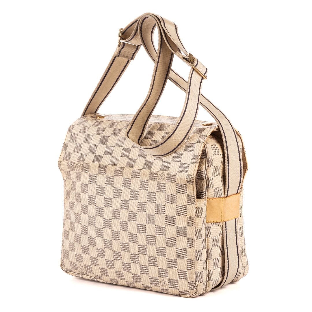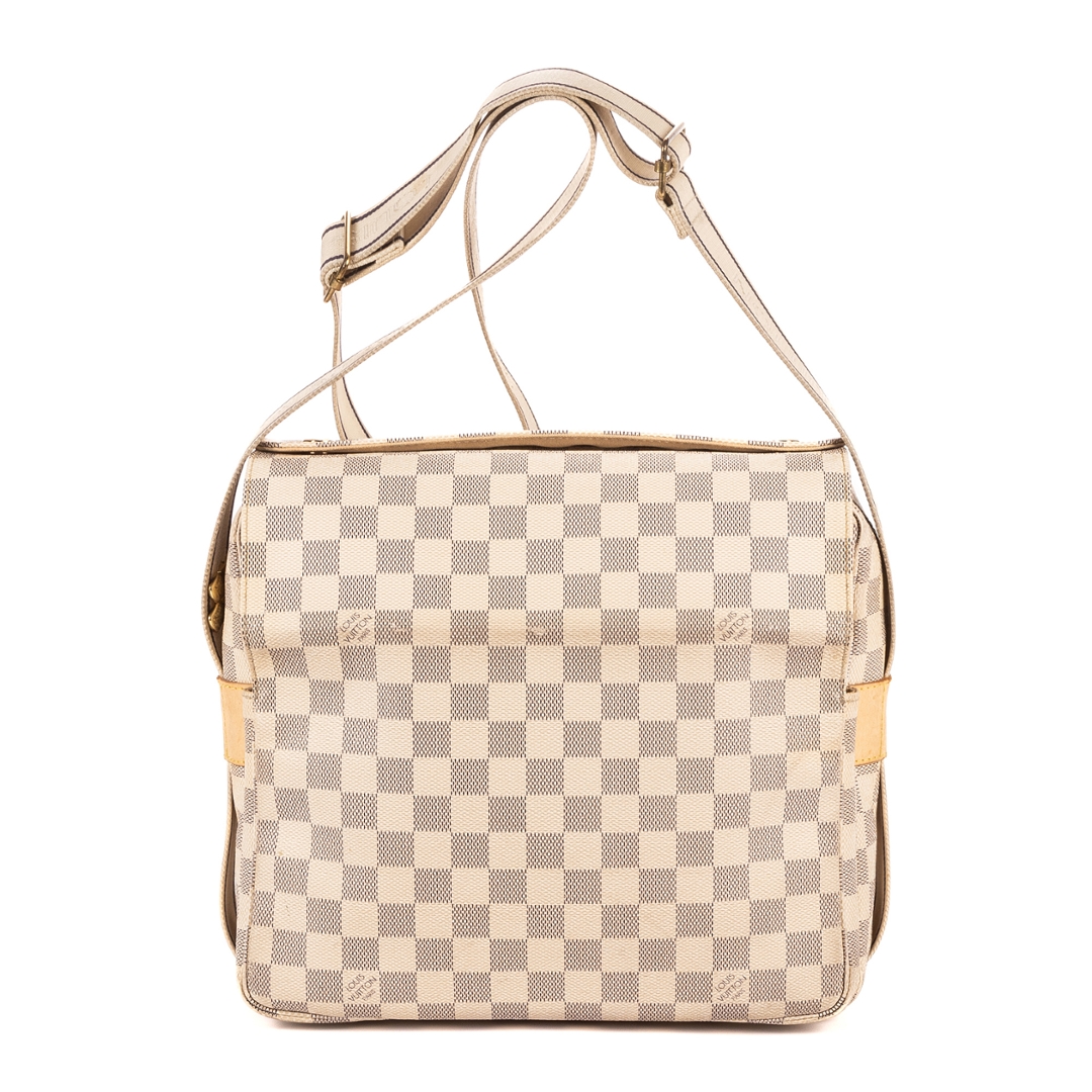 A vintage Louis Vuitton Naviglio bag crafted in refined white coated canvas, showcasing the house’s signature checkerboard pattern in a lighter, more contemporary palette. The structured silhouette is complemented by natural leather trim and a wide adjustable shoulder strap, delivering a practical yet elevated everyday design.
