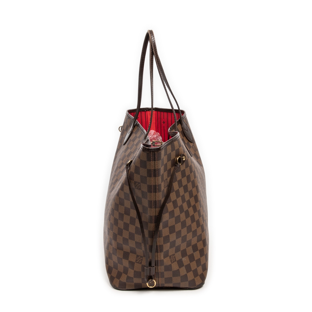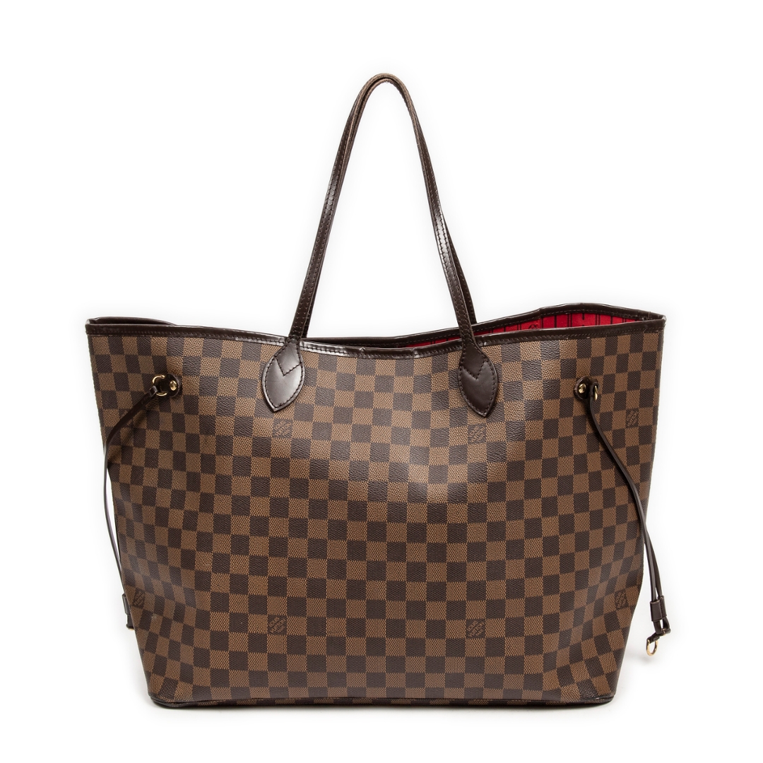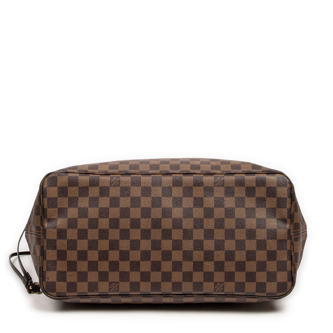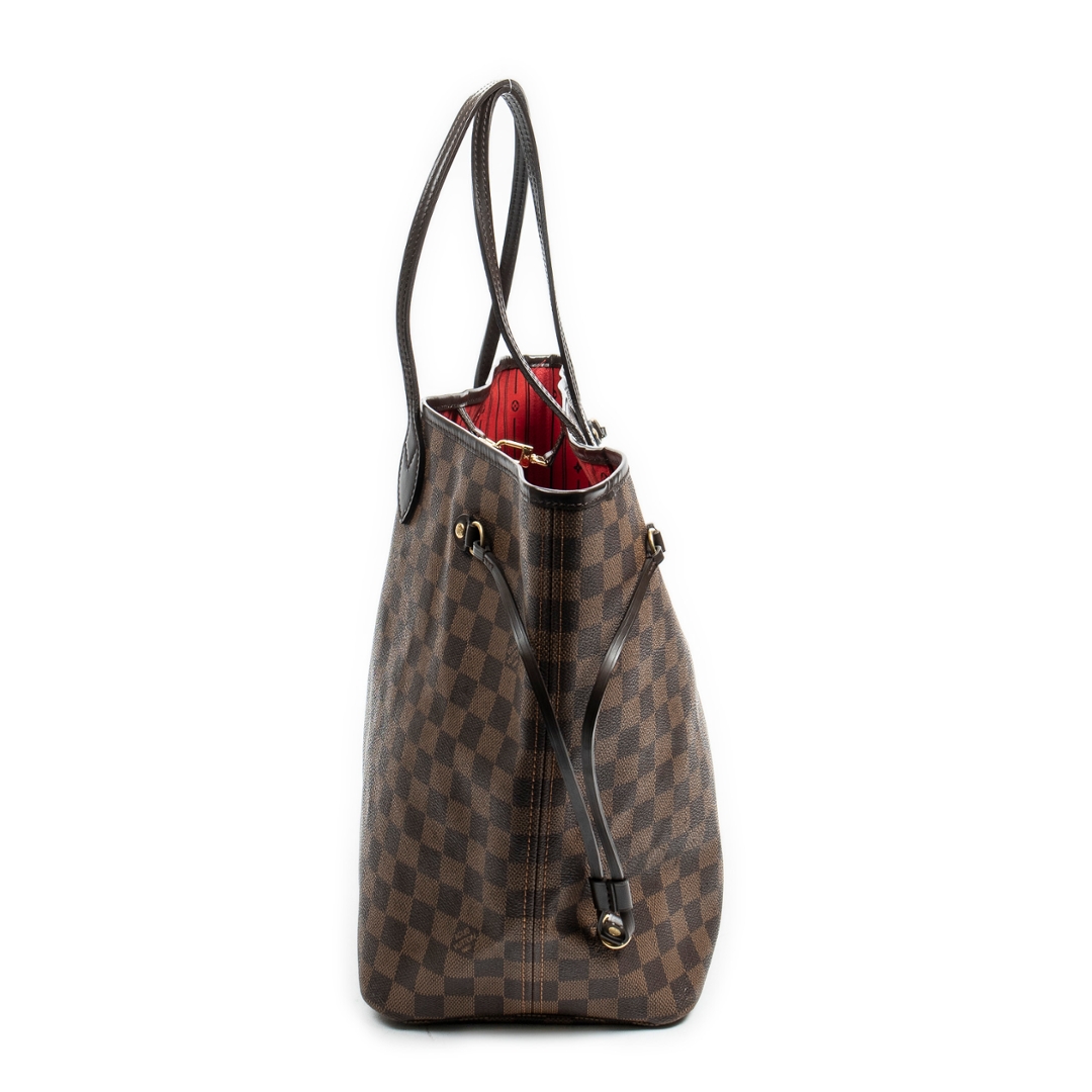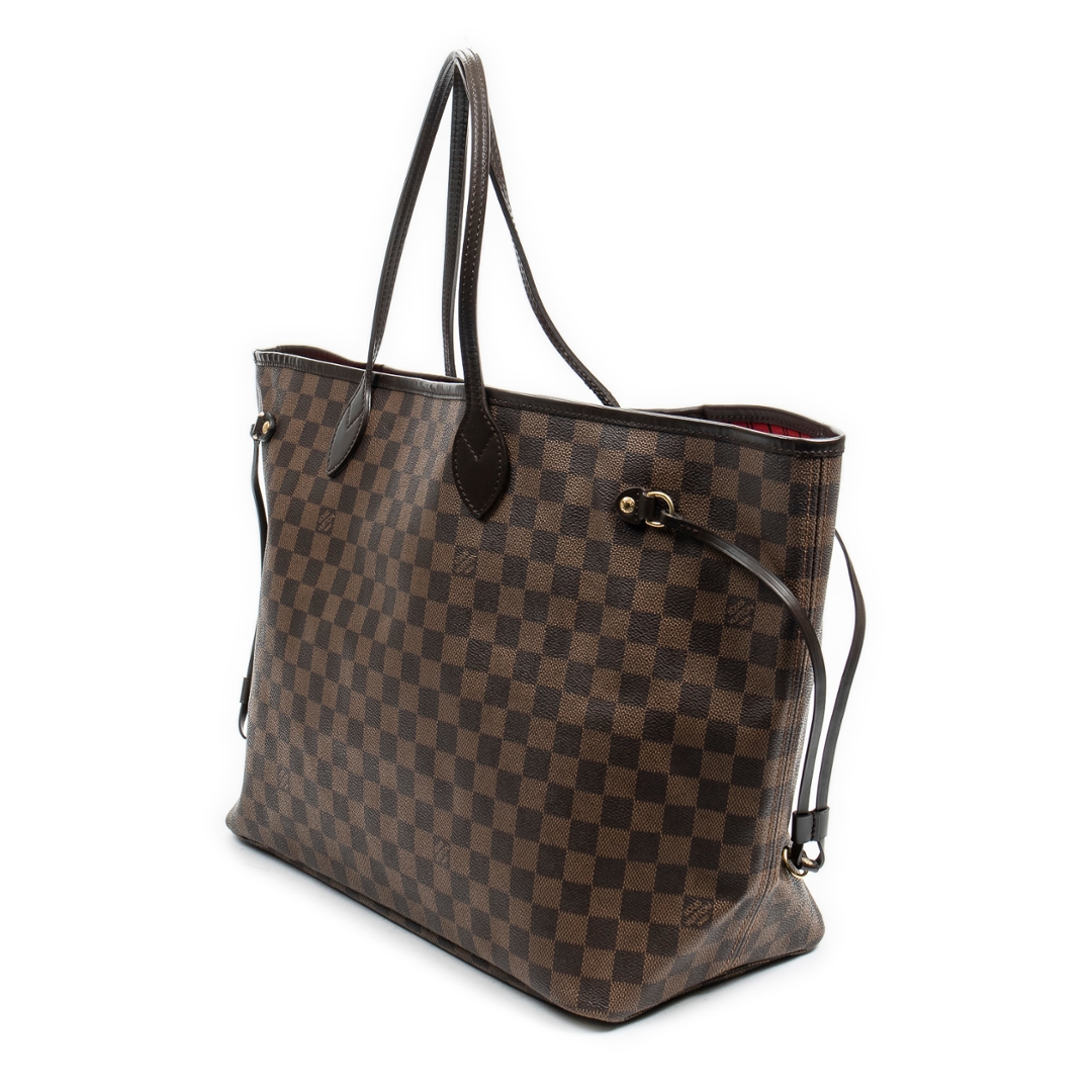 A vintage Louis Vuitton Neverfull bag crafted in the iconic brown Damier Ebene coated canvas, complemented by dark leather trim and gold-tone hardware. The instantly recognisable tote silhouette is both timeless and practical, with the signature checkerboard pattern offering a refined, understated luxury aesthetic.