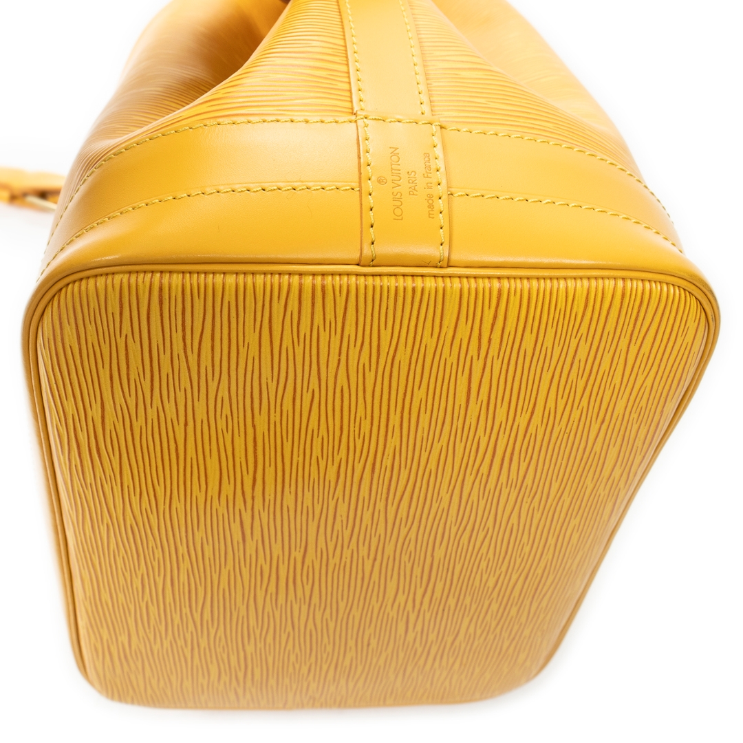 A vintage Louis Vuitton Noé bag crafted in vibrant yellow textured calf leather, offering a bold and distinctive take on one of the house’s most iconic silhouettes. The structured bucket design is enhanced by the signature drawstring closure and tonal leather trim, while the rich colourway adds a striking statement to this timeless piece.