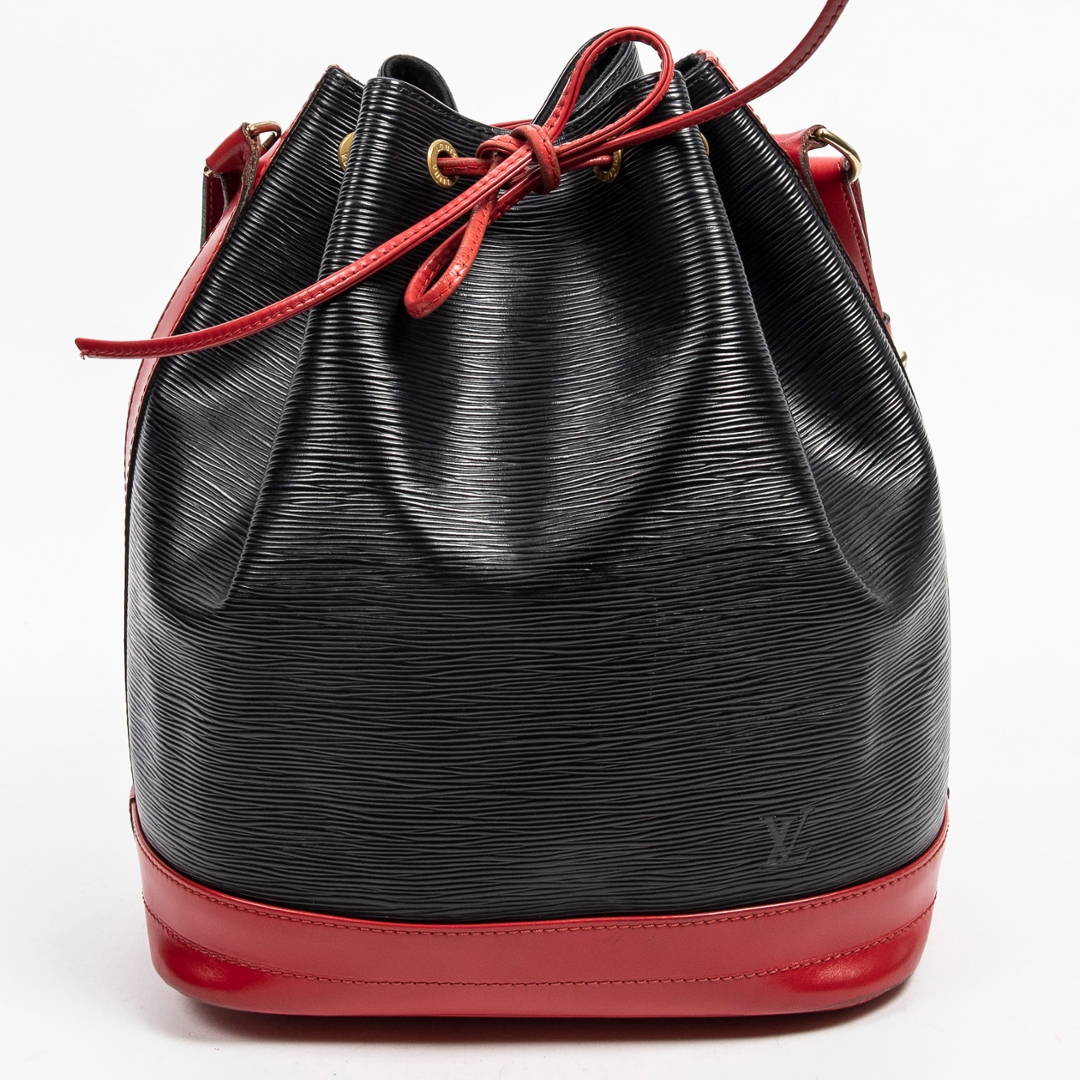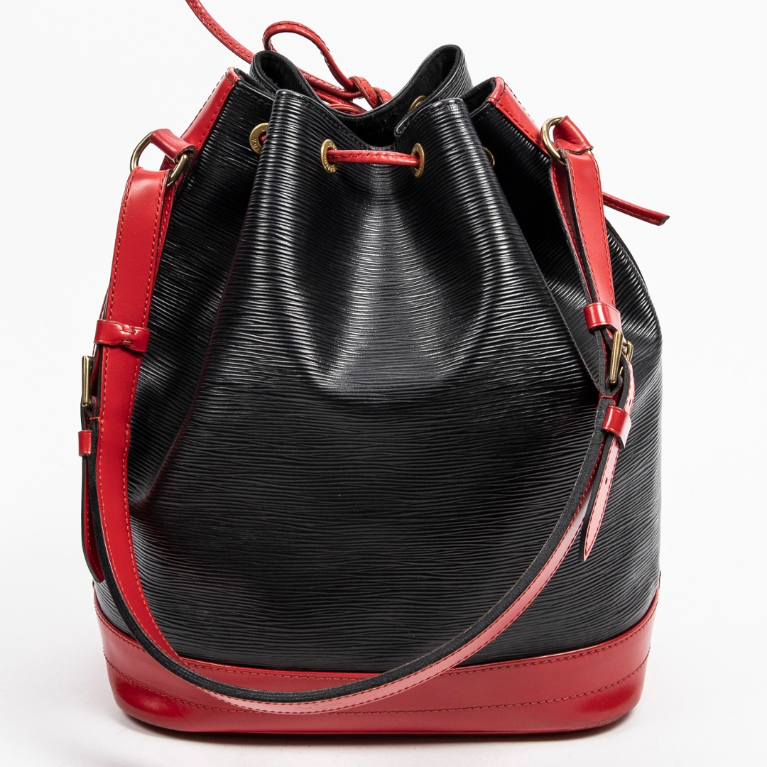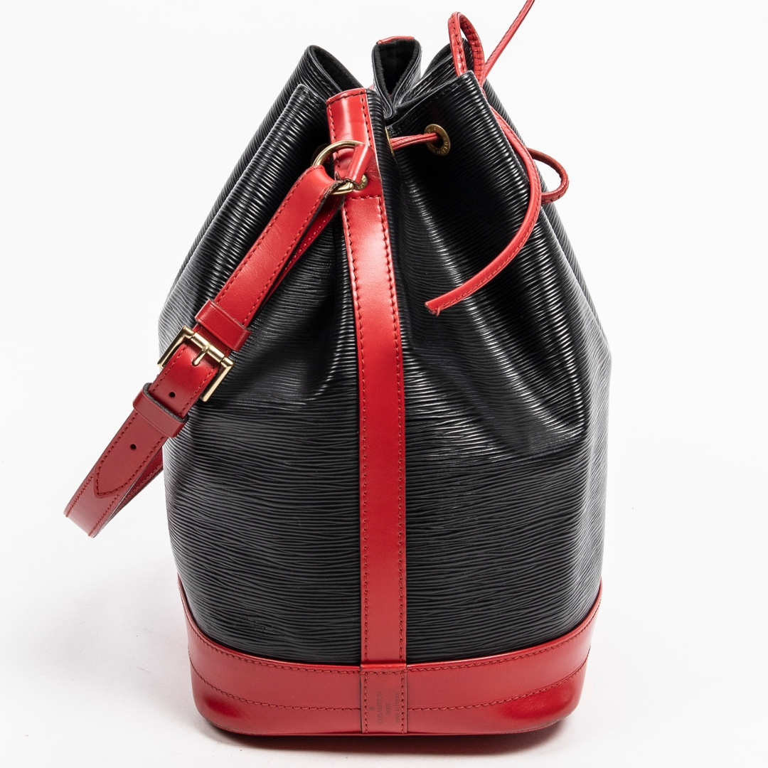A vintage Louis Vuitton black/red calf leather Noe Bicolor bag with a certificate of authenticity. Approximately 34cm height, 27cm width.