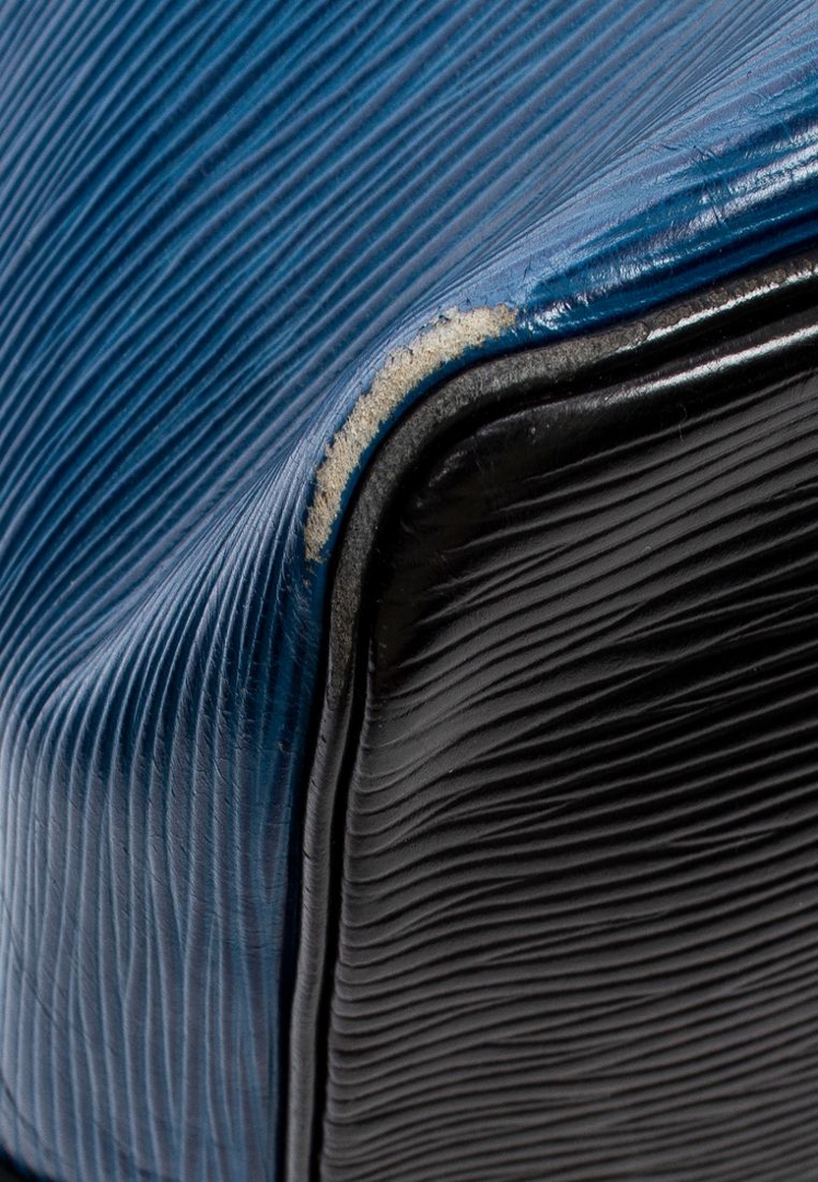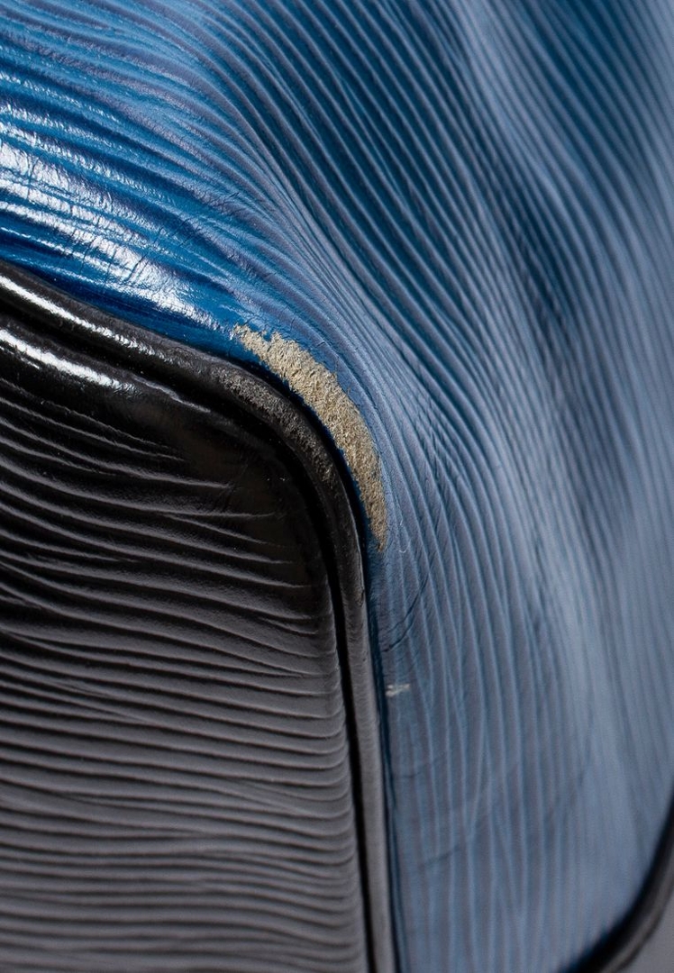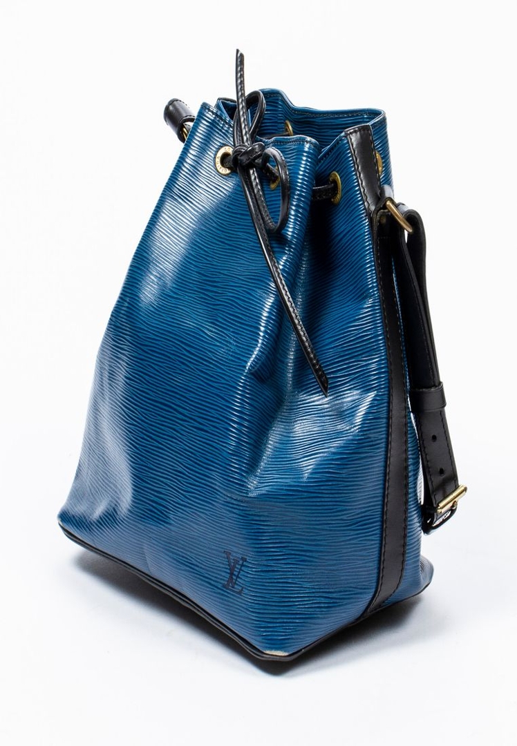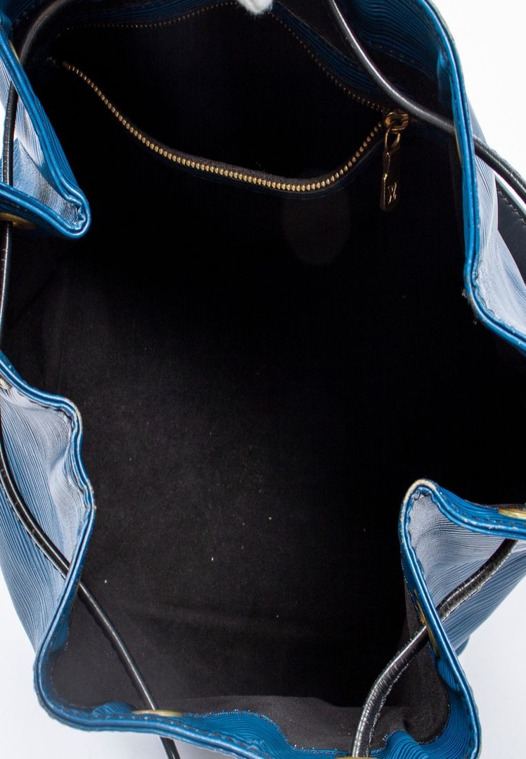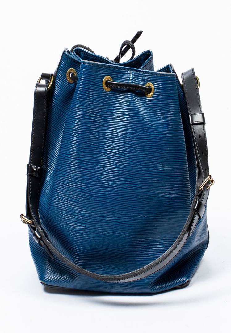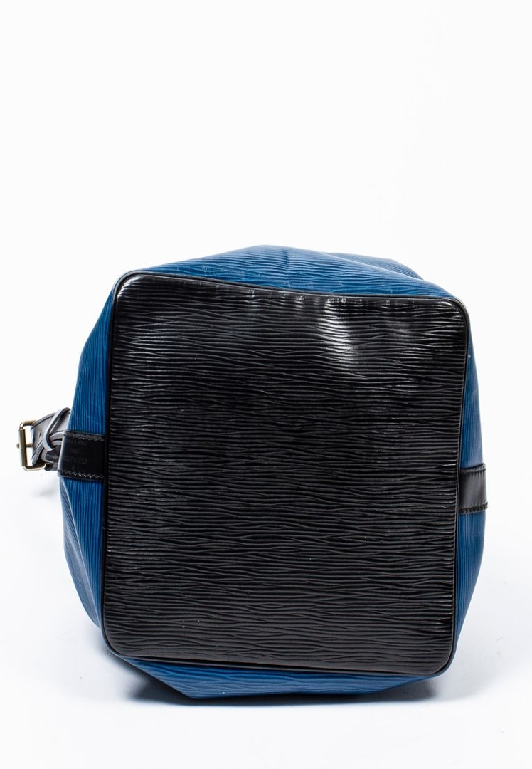 A vintage Louis Vuitton blue/black calf leather Noe Bicolor bag with a certificate of authenticity. Approximately 26cm height, 24cm width.