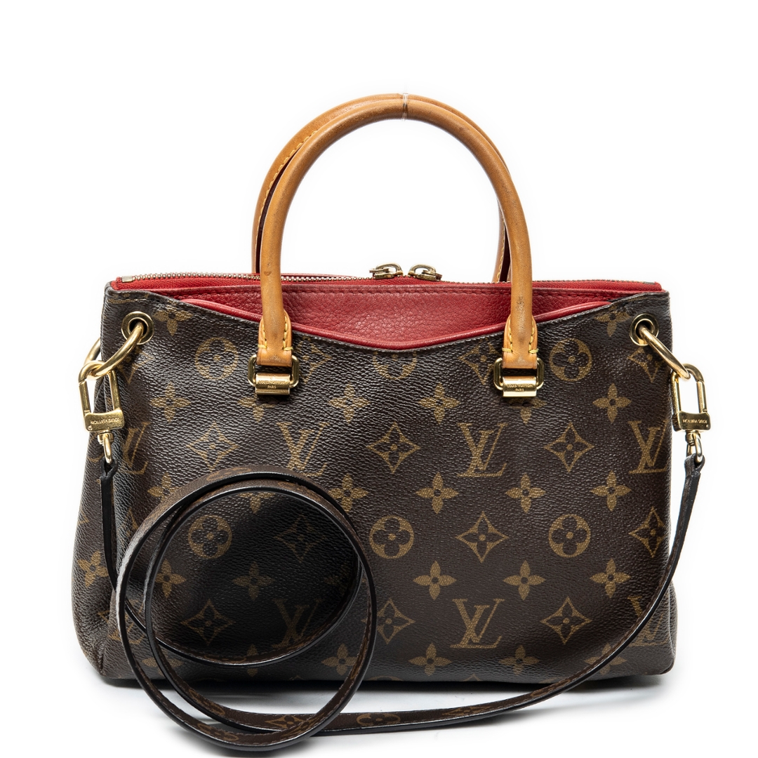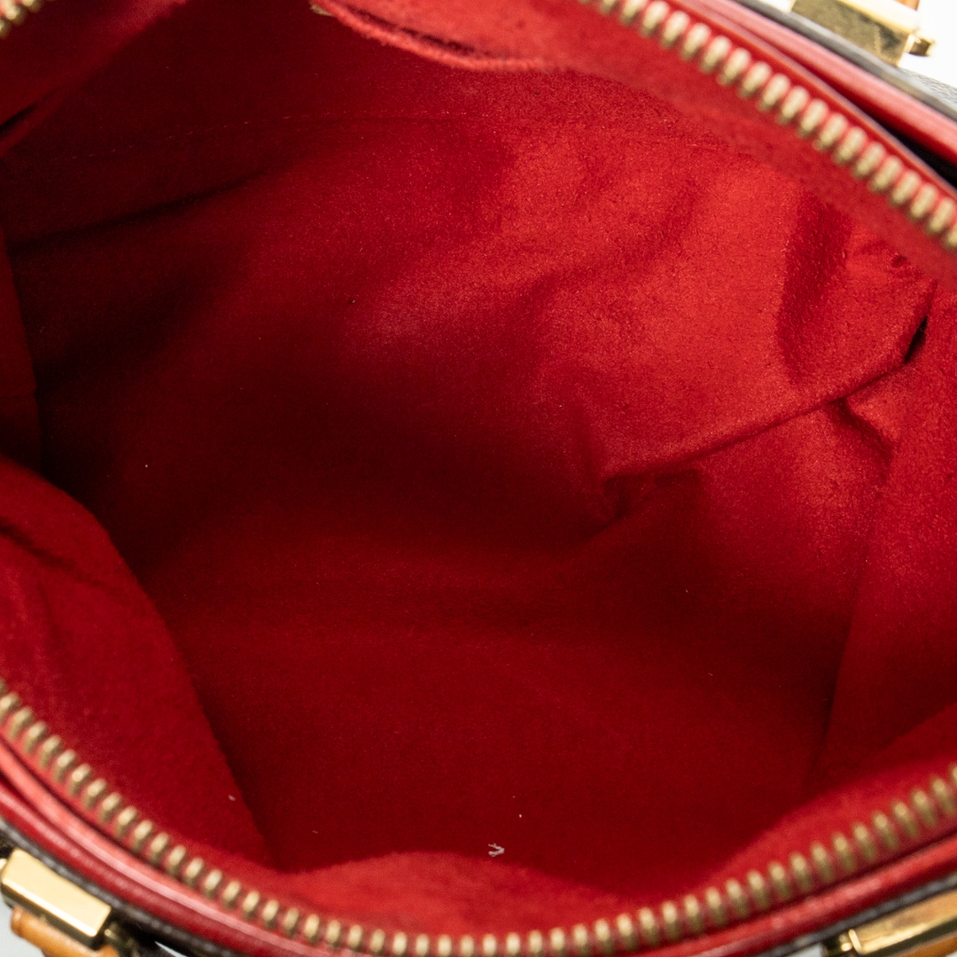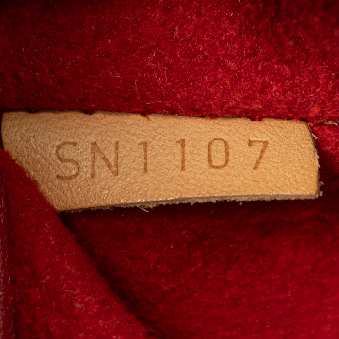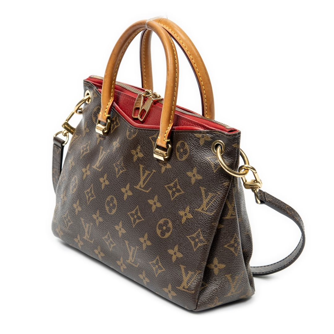 A vintage Louis Vuitton brown/red coated canvas Pallas bag with a certificate of authenticity. Approximately 18cm height, 26cm width.