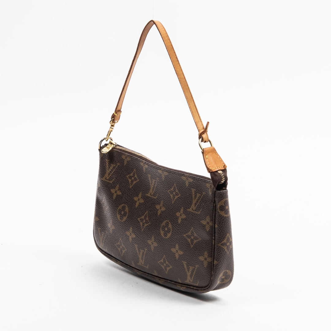 A vintage Louis Vuitton Pochette Accessoires bag crafted in the house’s iconic monogram coated canvas, finished with natural leather trim and gold-tone hardware. This compact and highly recognisable design embodies effortless Parisian styling, making it a staple piece within the Louis Vuitton collection.