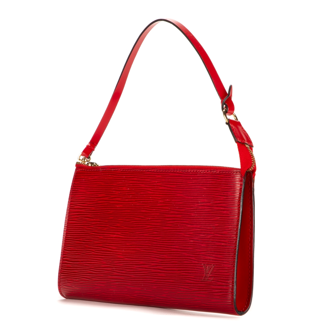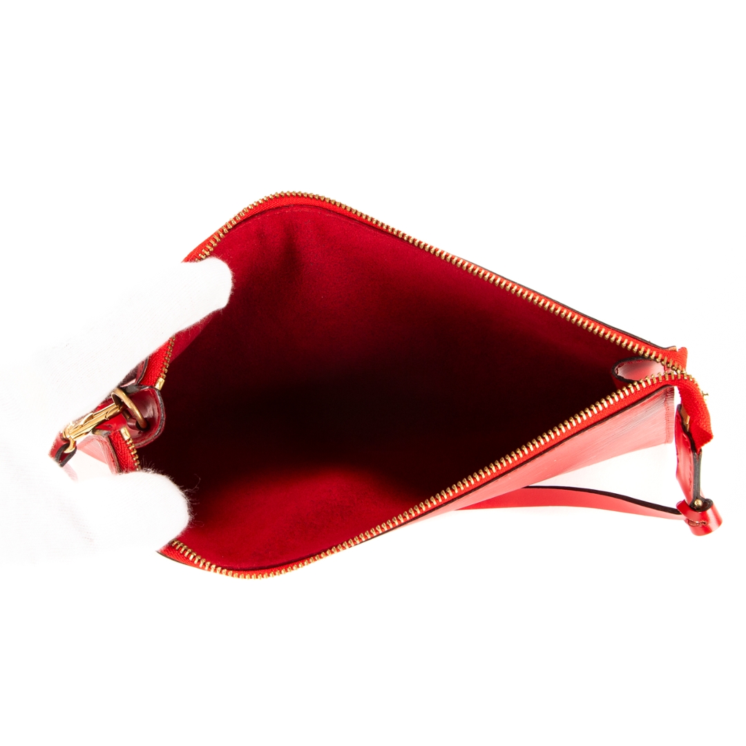 A vintage Louis Vuitton red calf leather Pochette Accessoires bag with a certificate of authenticity. Approximately 13cm height, 24cm width.