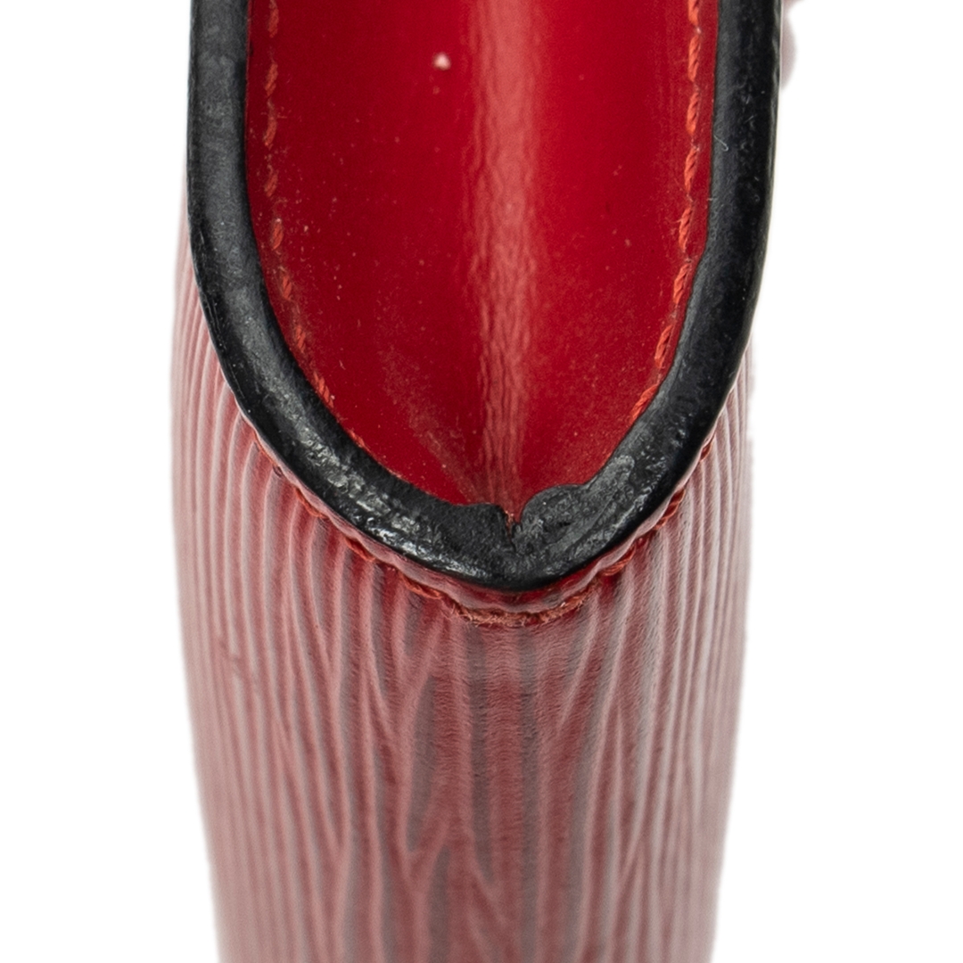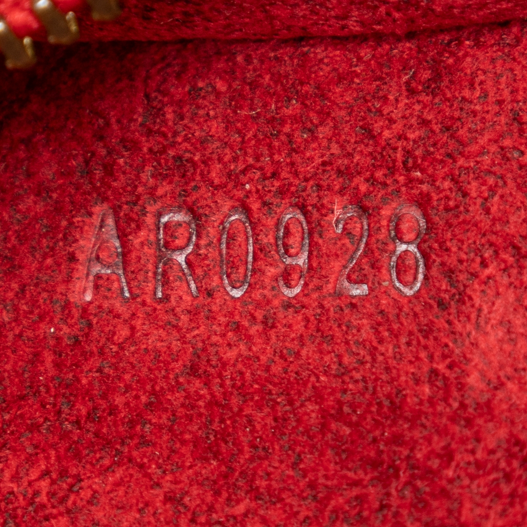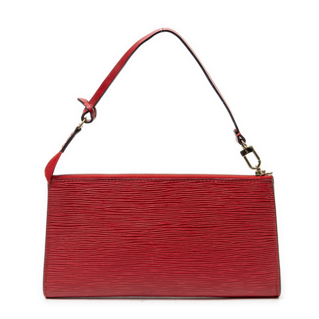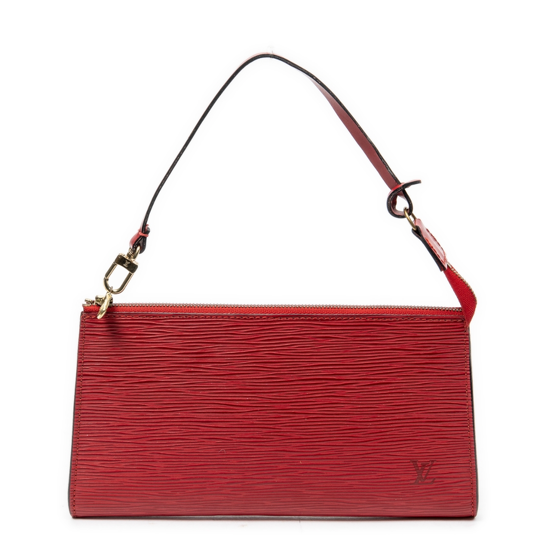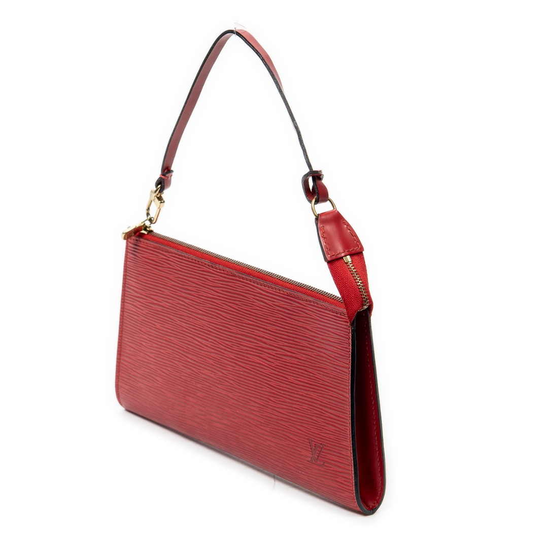 A vintage Louis Vuitton red calf leather Pochette Accessoires bag with a certificate of authenticity. Approximately 13cm height, 24cm width.