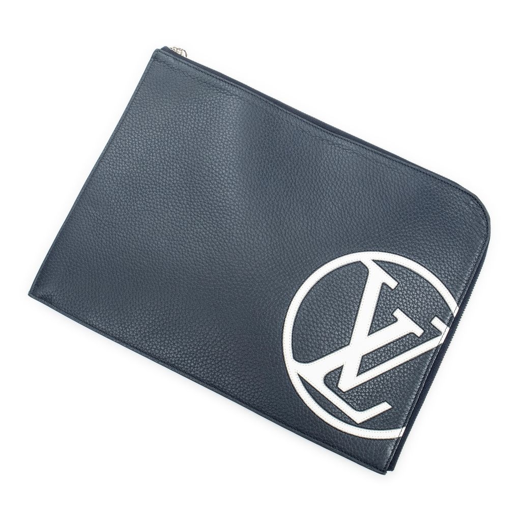 A vintage Louis Vuitton navy calf leather Pochette Jour bag with a certificate of authenticity, measuring approximately 25cm in height and 34cm in width. This refined piece showcases a smooth navy finish accented by a striking oversized LV circle logo in white, adding a contemporary twist to the timeless Louis Vuitton aesthetic. Its clean, structured silhouette makes it an effortlessly stylish choice for modern use.