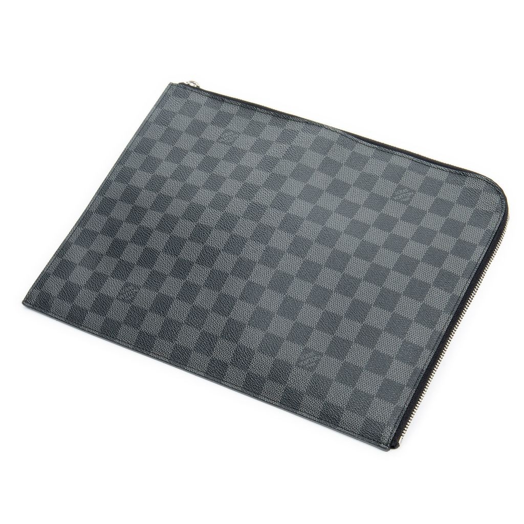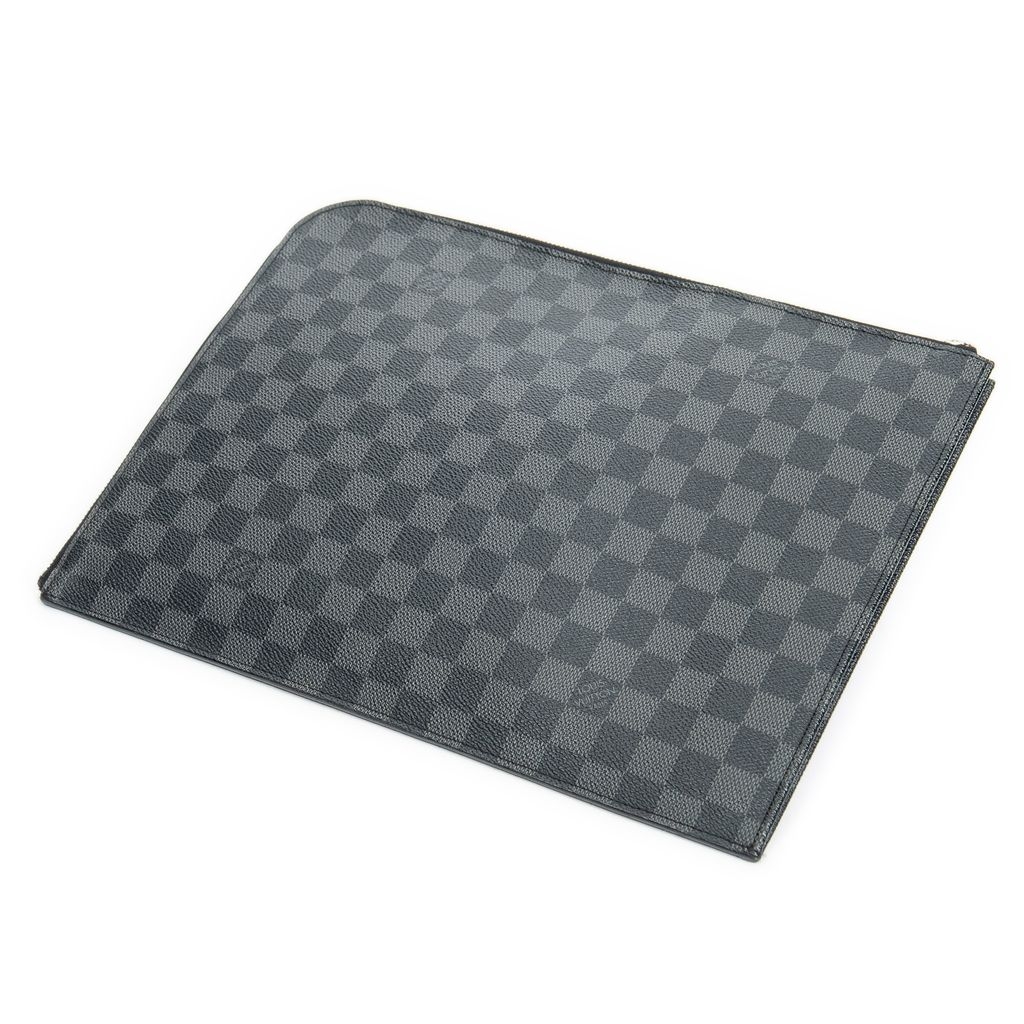 A vintage Louis Vuitton black calf leather Pochette Jour bag with a certificate of authenticity, measuring approximately 24cm in height and 33cm in width. Crafted in Louis Vuitton’s iconic Damier Graphite canvas, this sleek and versatile pouch is designed to combine practicality with understated elegance. Its minimalist silhouette highlights the refined pattern, making it an ideal choice for both professional and casual use.