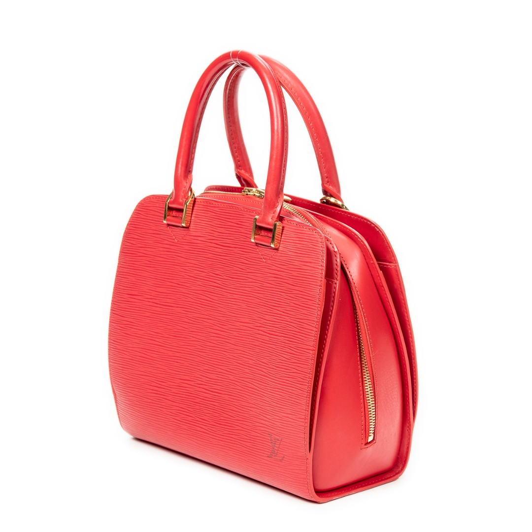 A vintage Louis Vuitton red calf leather Pont-Neuf bag with a certificate of authenticity, Approximately 22cm height, 24cm width.