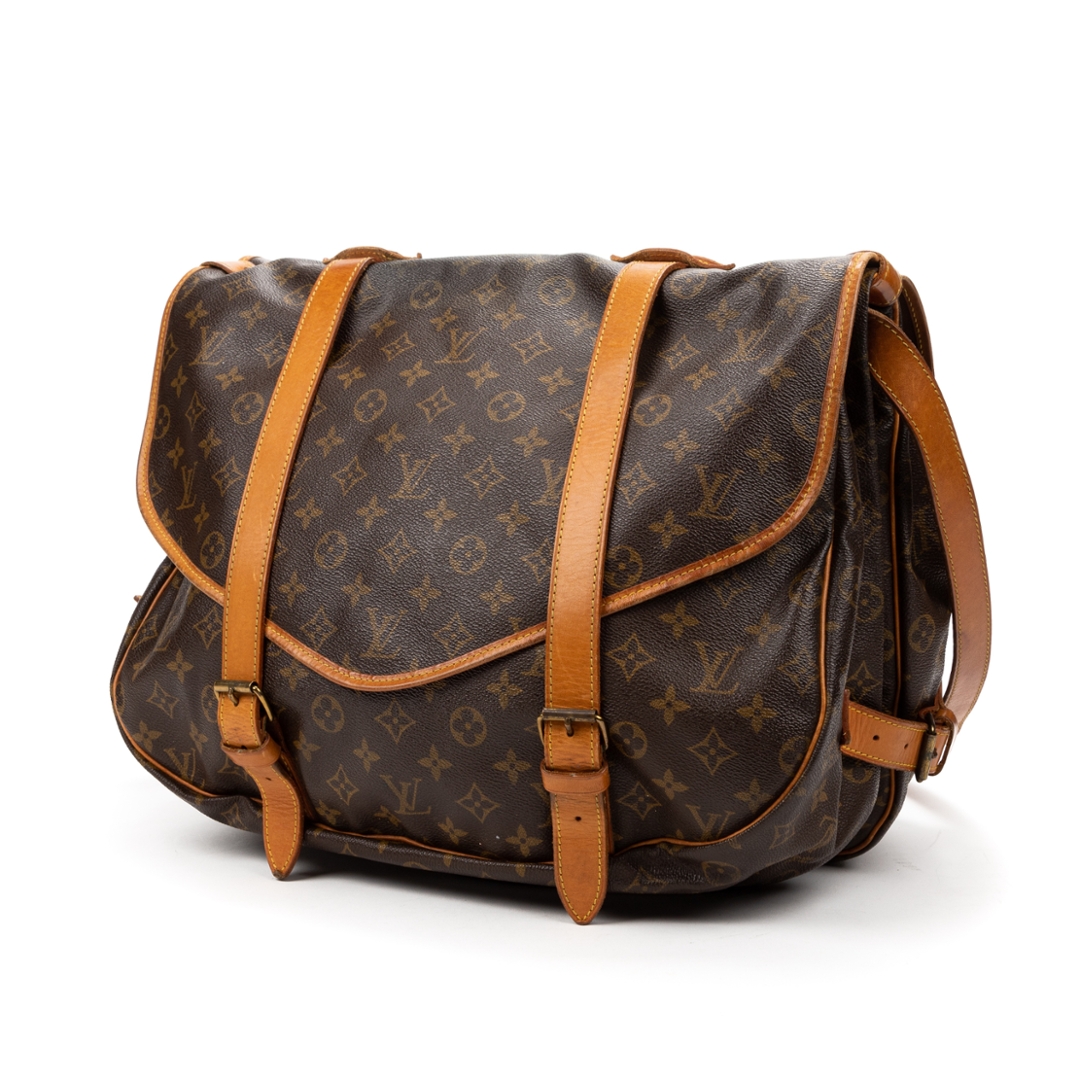 A vintage Louis Vuitton monogram coated canvas Saumur Double Straps bag with a certificate of authenticity, Approximately 33cm height, 35cm width.