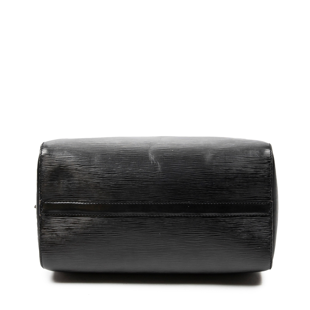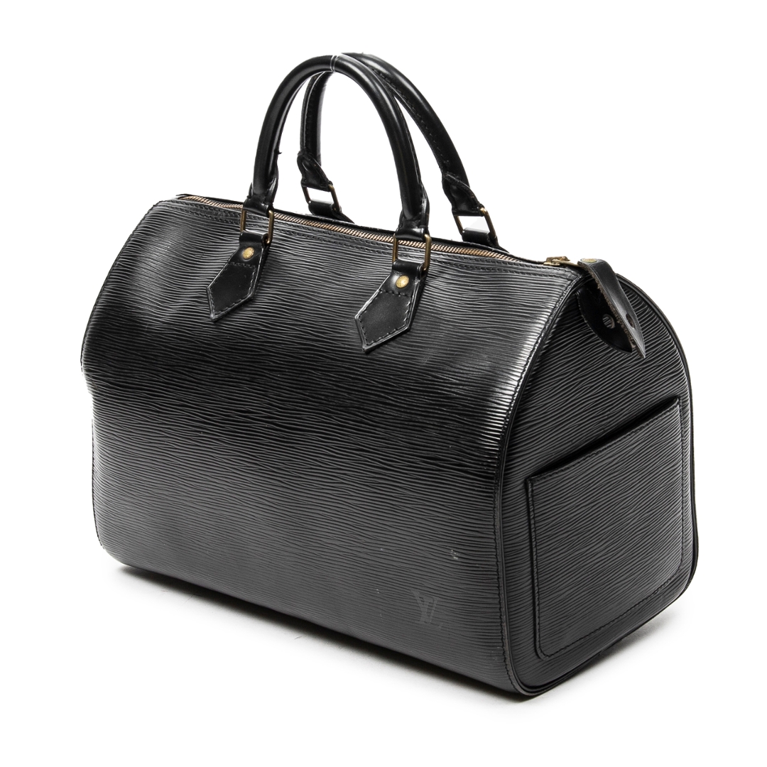 A vintage Louis Vuitton black calf leather Speedy bag with a certificate of authenticity. Approximately 22cm height, 32cm width.