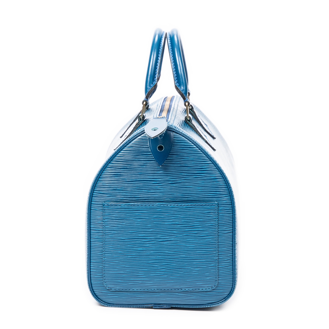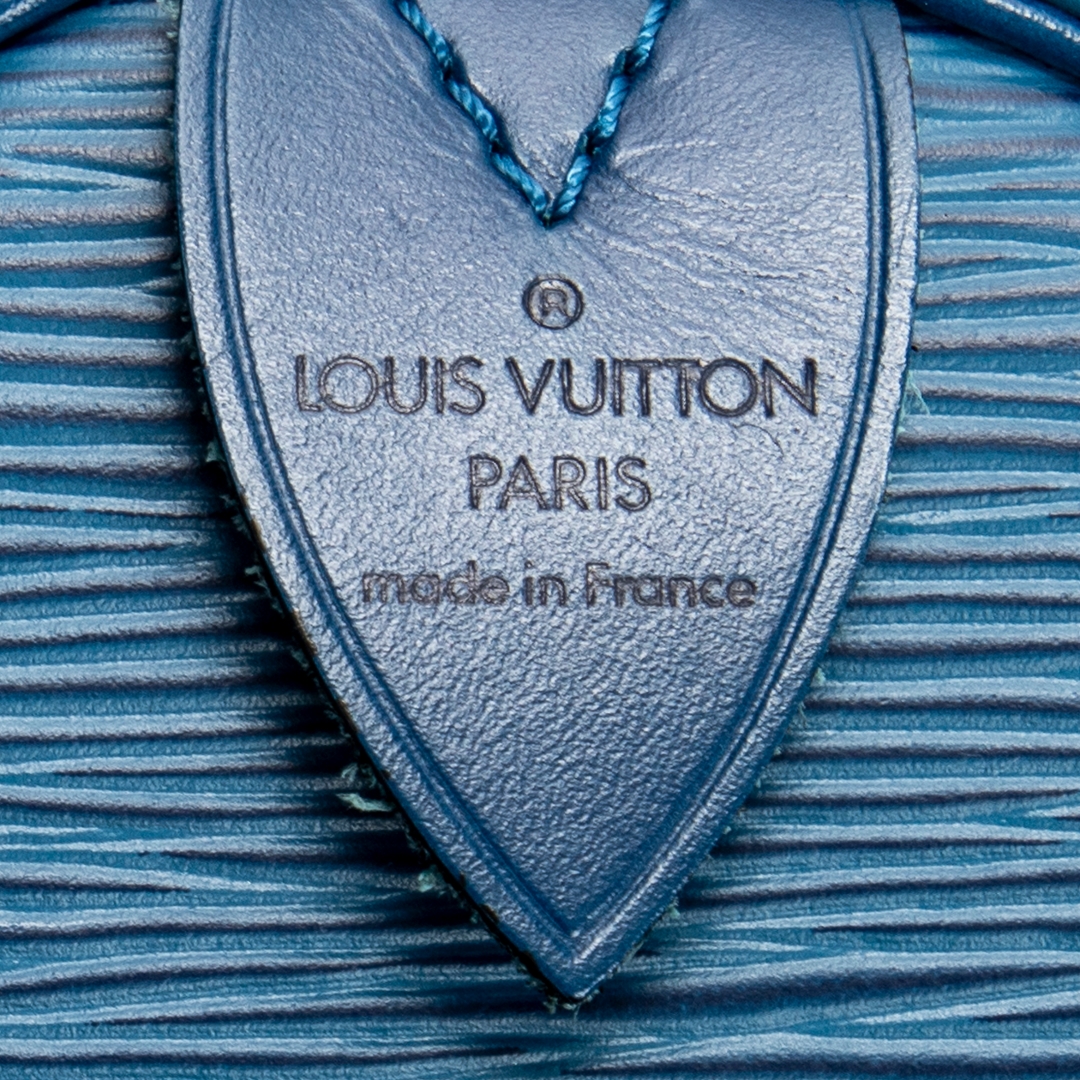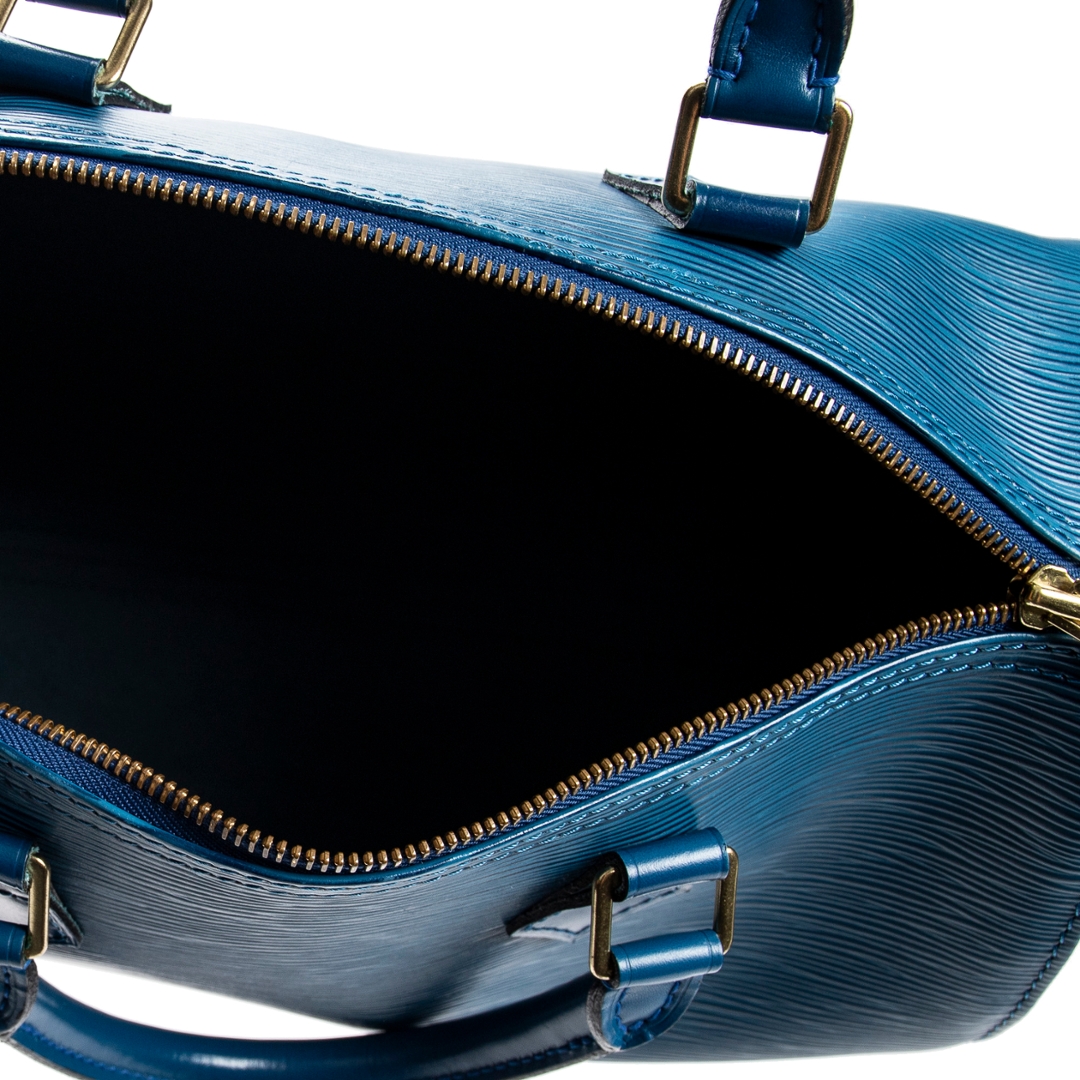 A vintage Louis Vuitton blue calf leather Speedy bag with a certificate of authenticity. Approximately 22cm height, 32cm width.