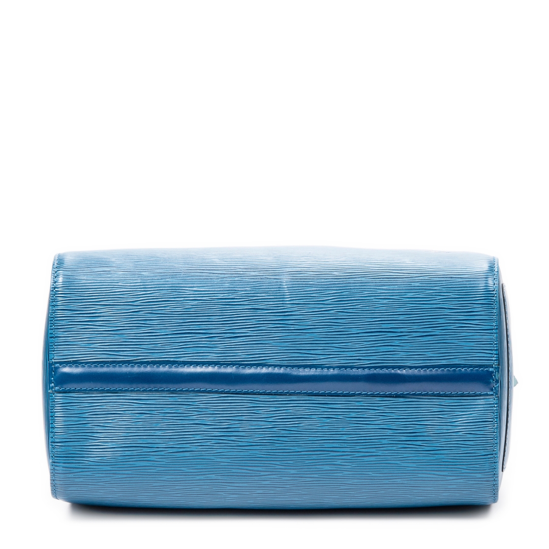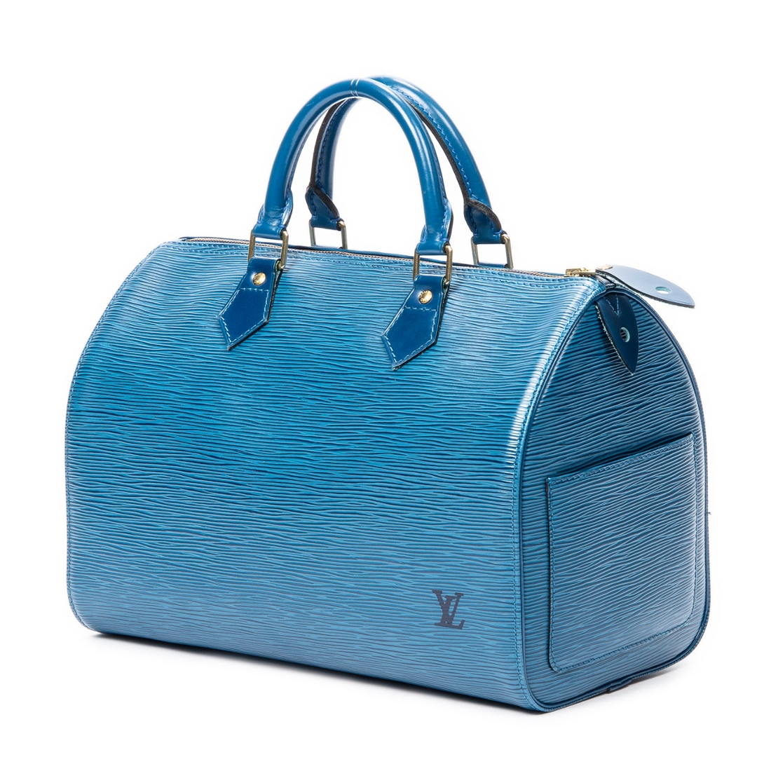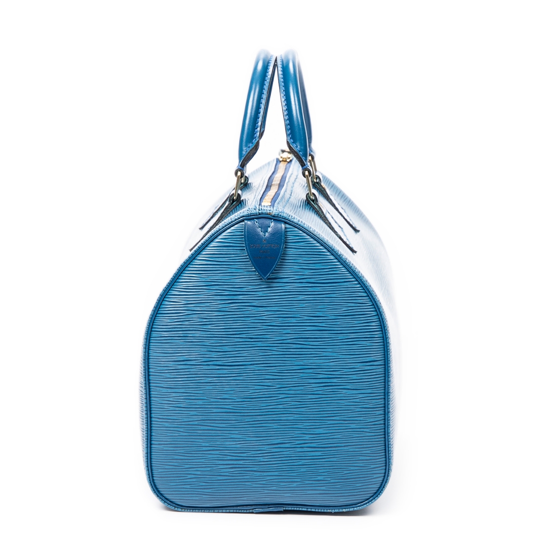 A vintage Louis Vuitton blue calf leather Speedy bag with a certificate of authenticity. Approximately 22cm height, 32cm width.