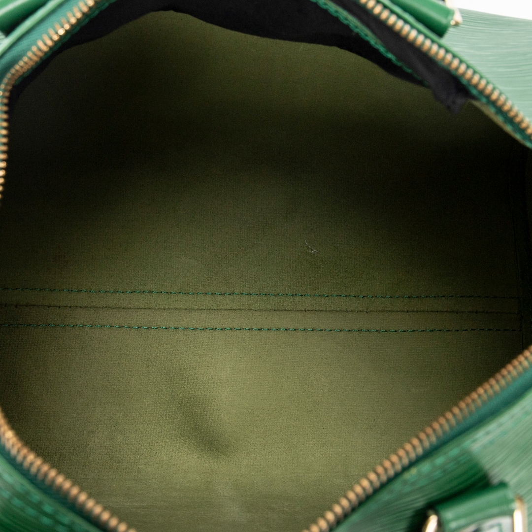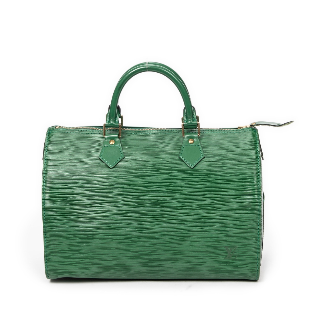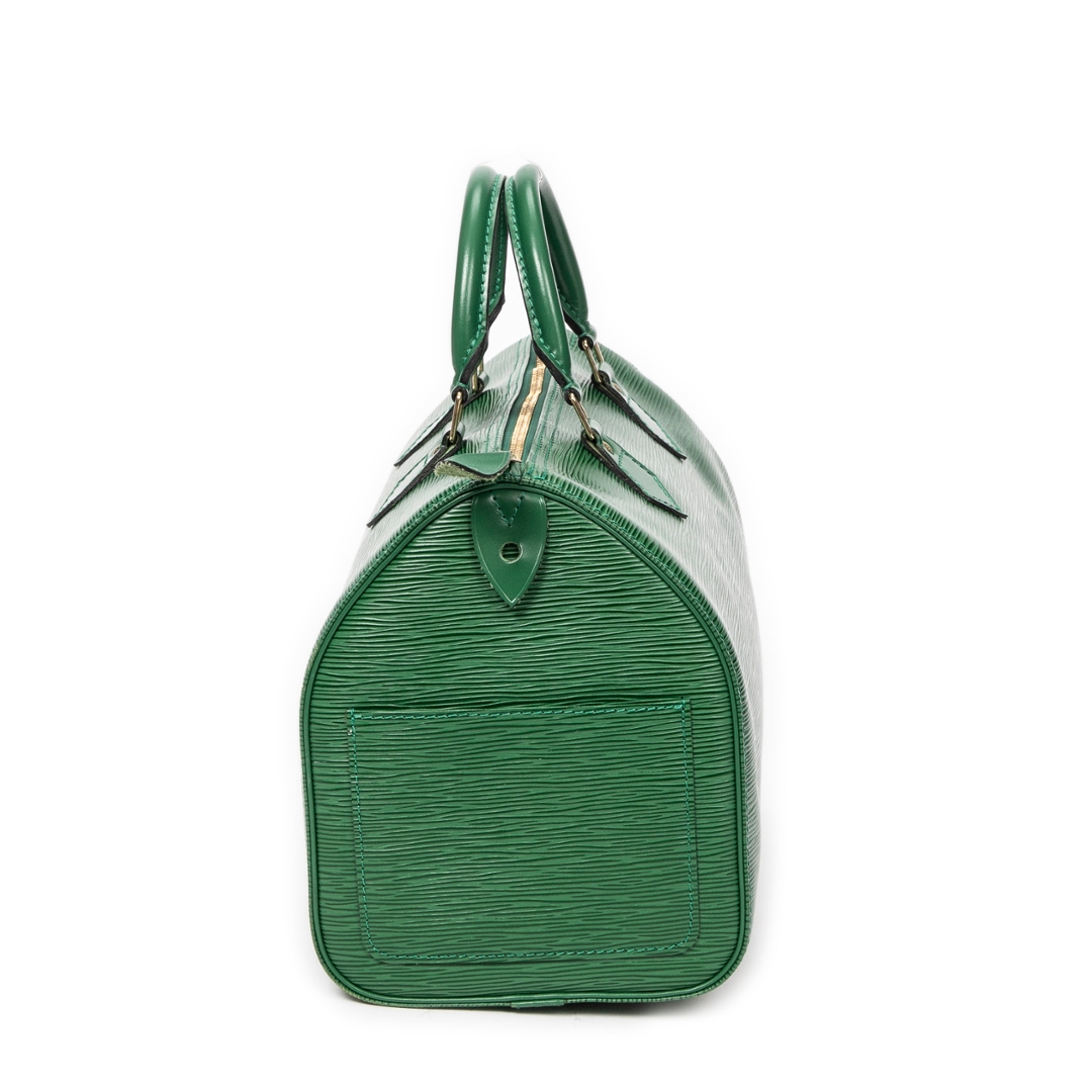 A vintage Louis Vuitton green calf leather Speedy bag with a certificate of authenticity. Approximately 22cm height, 32cm width.