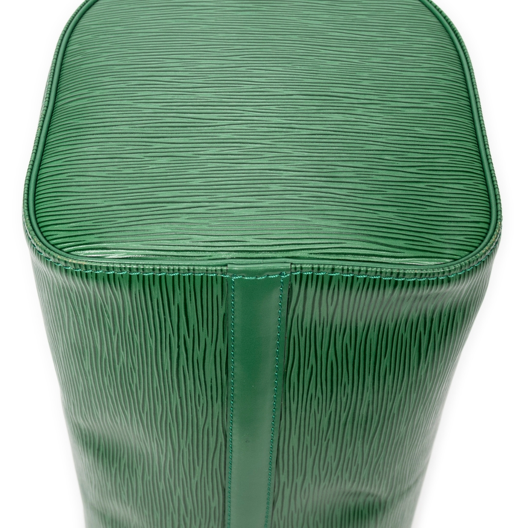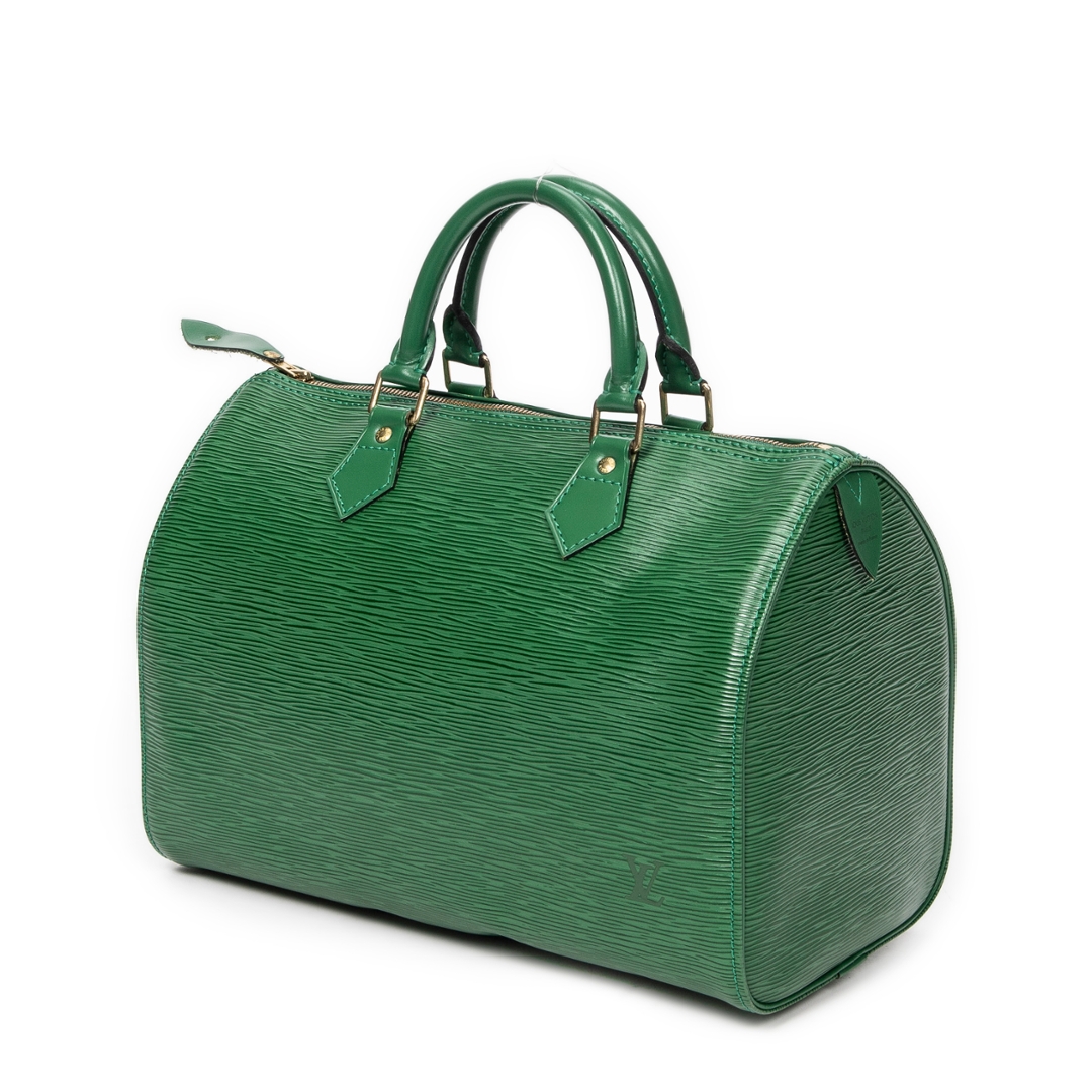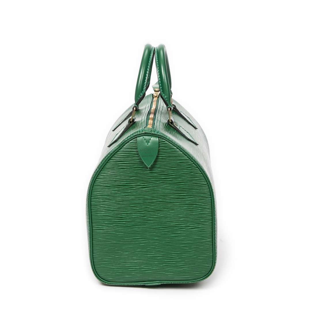 A vintage Louis Vuitton green calf leather Speedy bag with a certificate of authenticity. Approximately 22cm height, 32cm width.