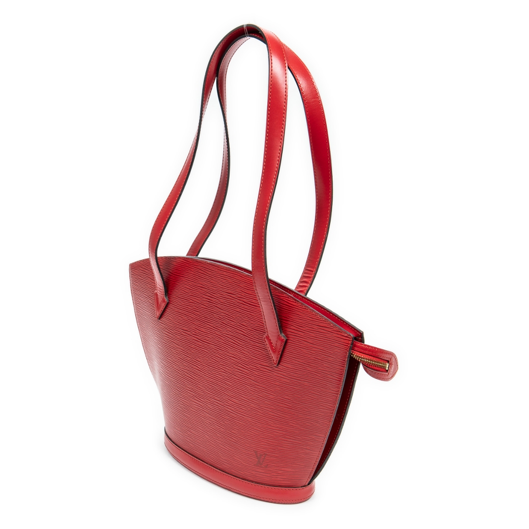 A vintage Louis Vuitton red calf leather St-Jacques Long Straps bag with a certificate of authenticity, Approximately 24cm height, 23cm width.