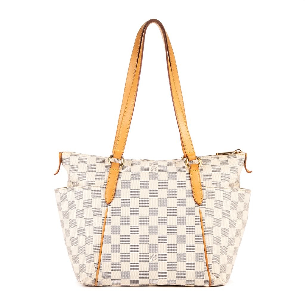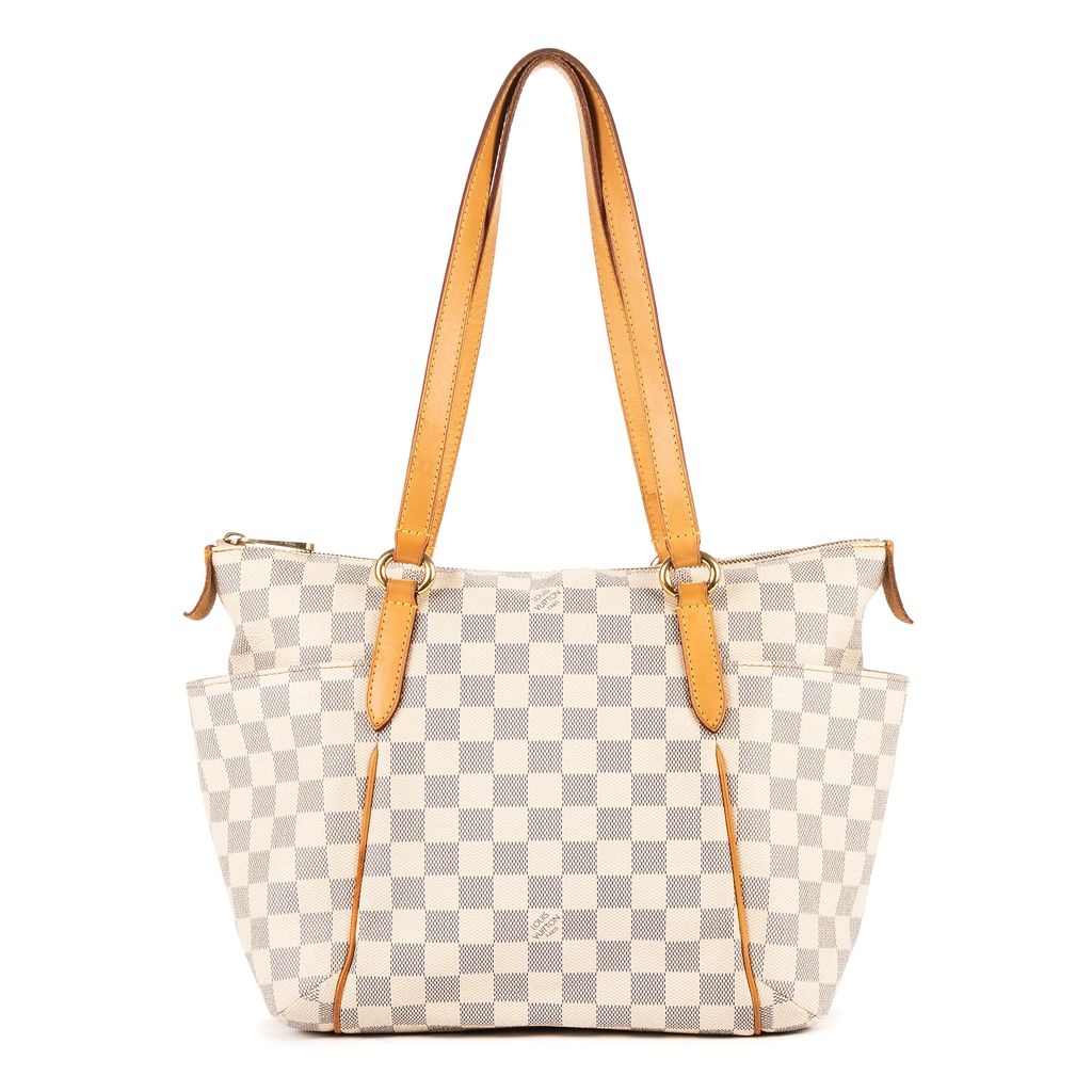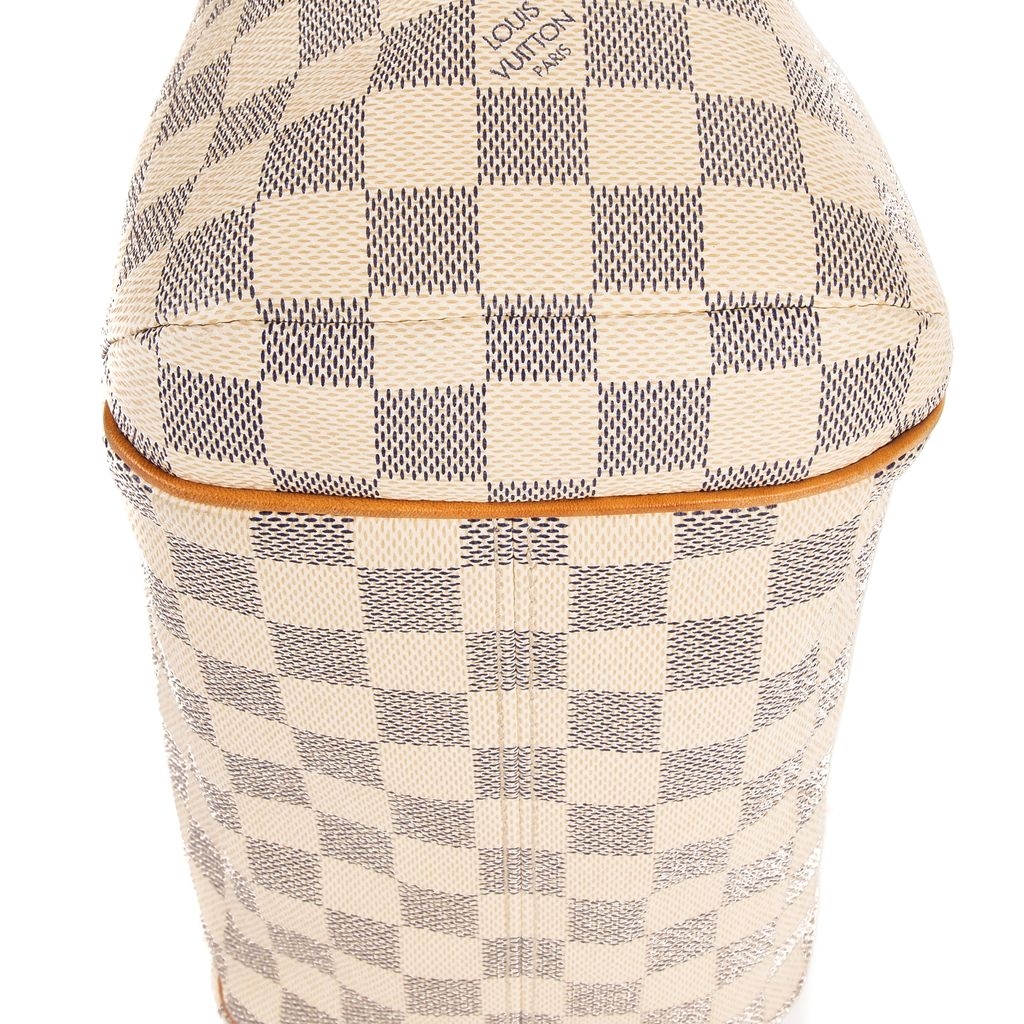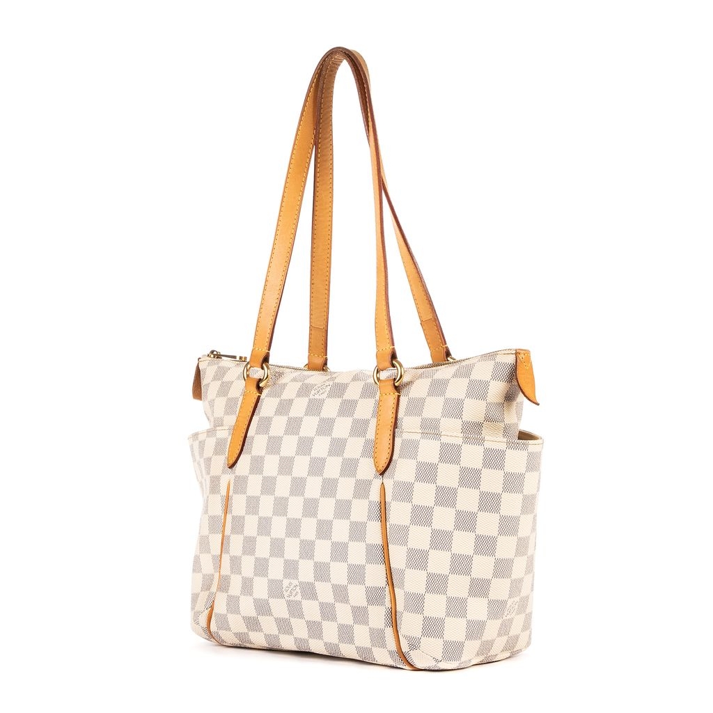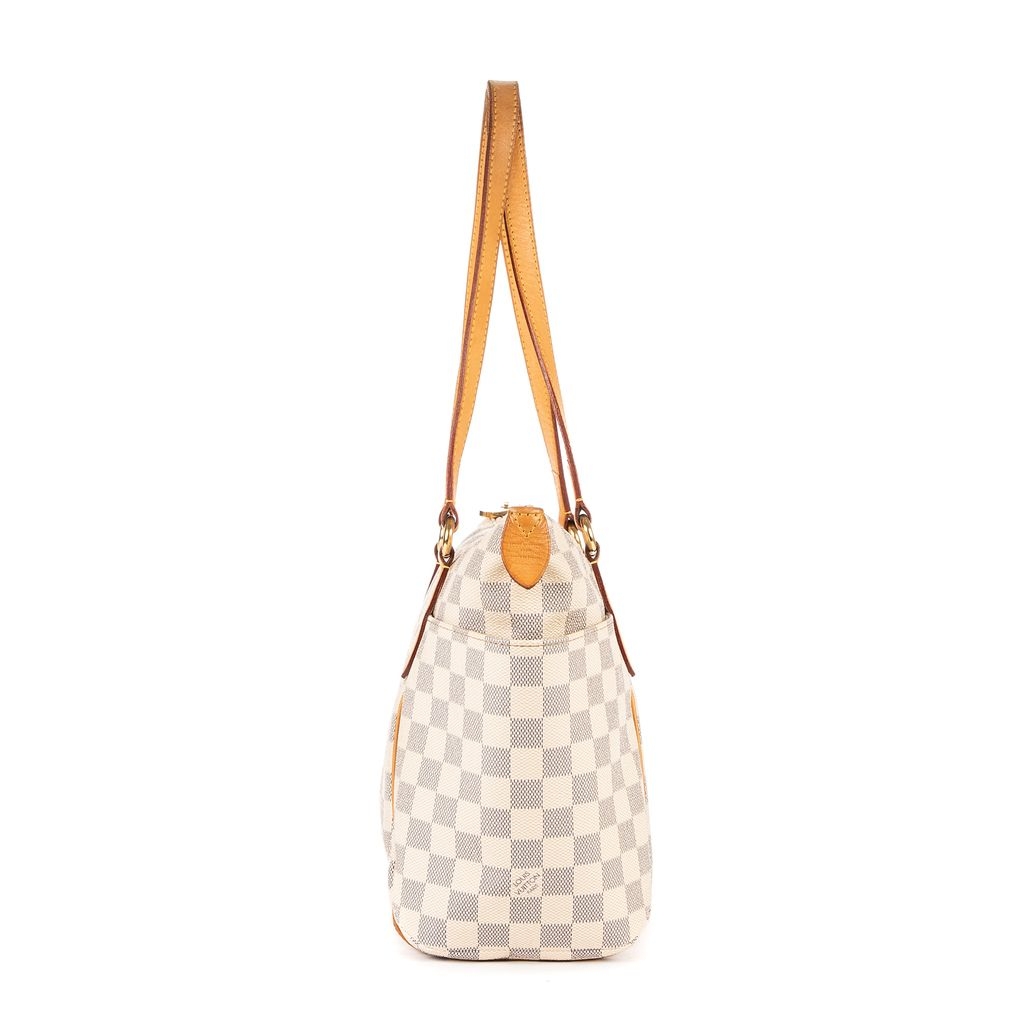 A vintage Louis Vuitton ivory-coated canvas totally bag is a chic and practical tote that reflects the brand’s perfect balance of timeless elegance and everyday function. Crafted in Louis Vuitton’s iconic Damier Azur coated canvas, it offers a light and versatile aesthetic that is ideal for both casual and sophisticated settings. The natural cowhide leather trim and gold-tone hardware add a touch of refinement to its structured yet relaxed design.