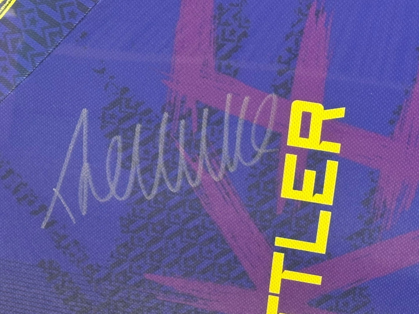 A signed and authenticated Luke Littler shirt, professionally mounted in a stunning presentation frame. Bursting with energy and colour, the shirt proudly features Littler’s signature nickname, “The Nuke,” emblazoned in bold yellow graphics, with his authentic autograph prominently displayed, making this a centrepiece of any memorabilia collection.