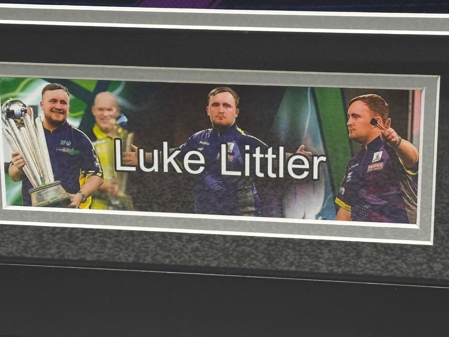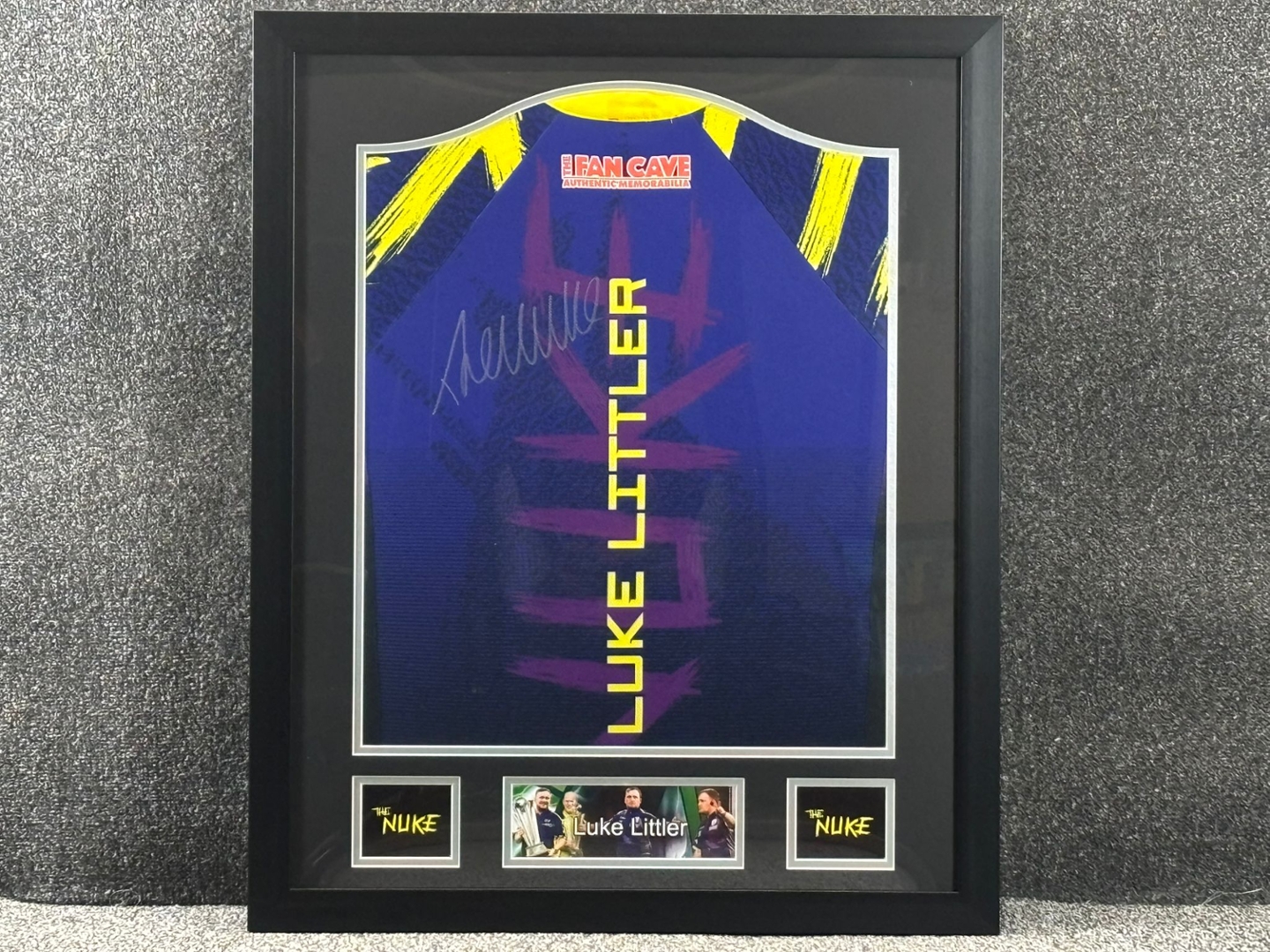 A signed and authenticated Luke Littler Shirt in a presentation frame. Approx 86cm height, 68cm width.