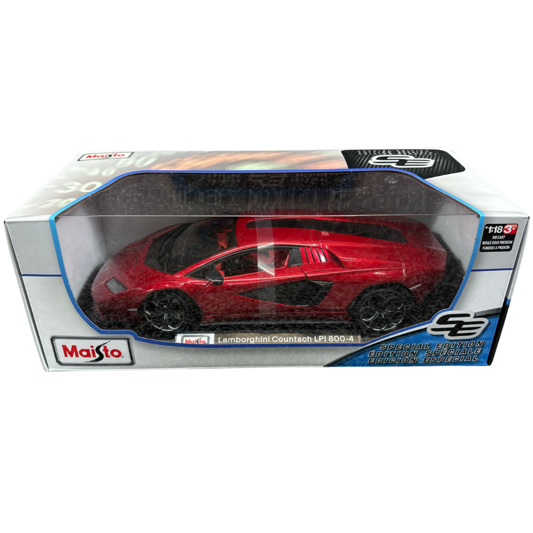 A 1:18 scale Maisto Lamborghini Countach LPI 800-4 die-cast model car. A modern tribute to the iconic Countach, this Special Edition model captures the bold styling and futuristic flair of Lamborghini’s limited-production hybrid masterpiece. Finished in a striking red with sharp black accents, the model exudes supercar charisma and cutting-edge design.