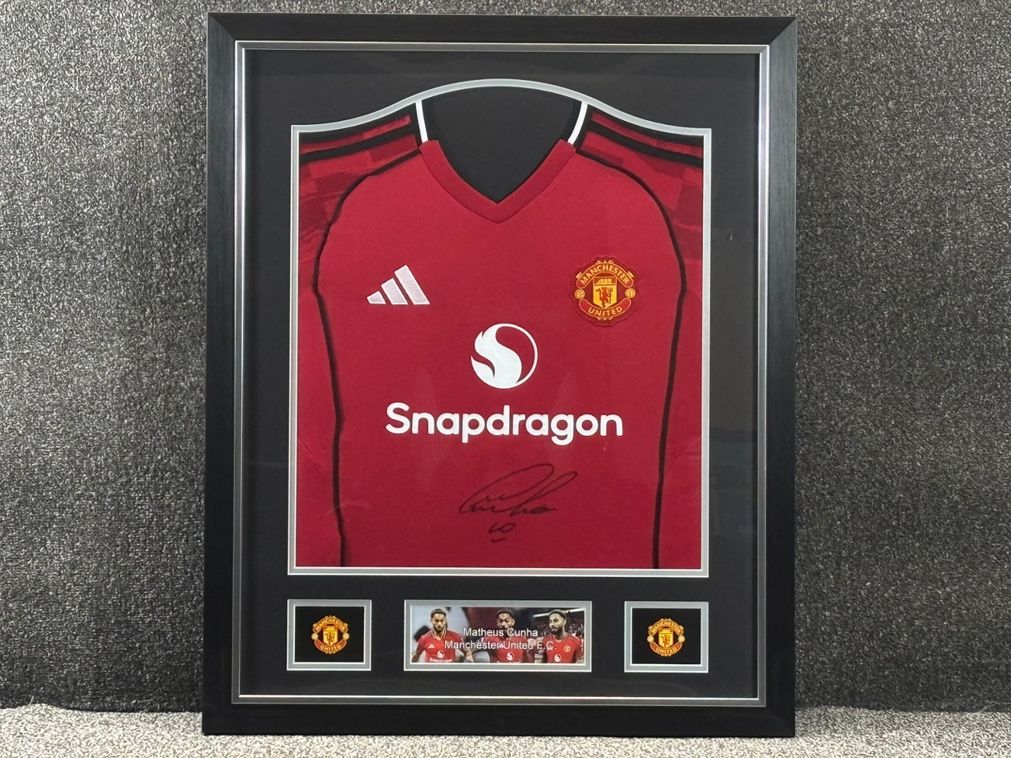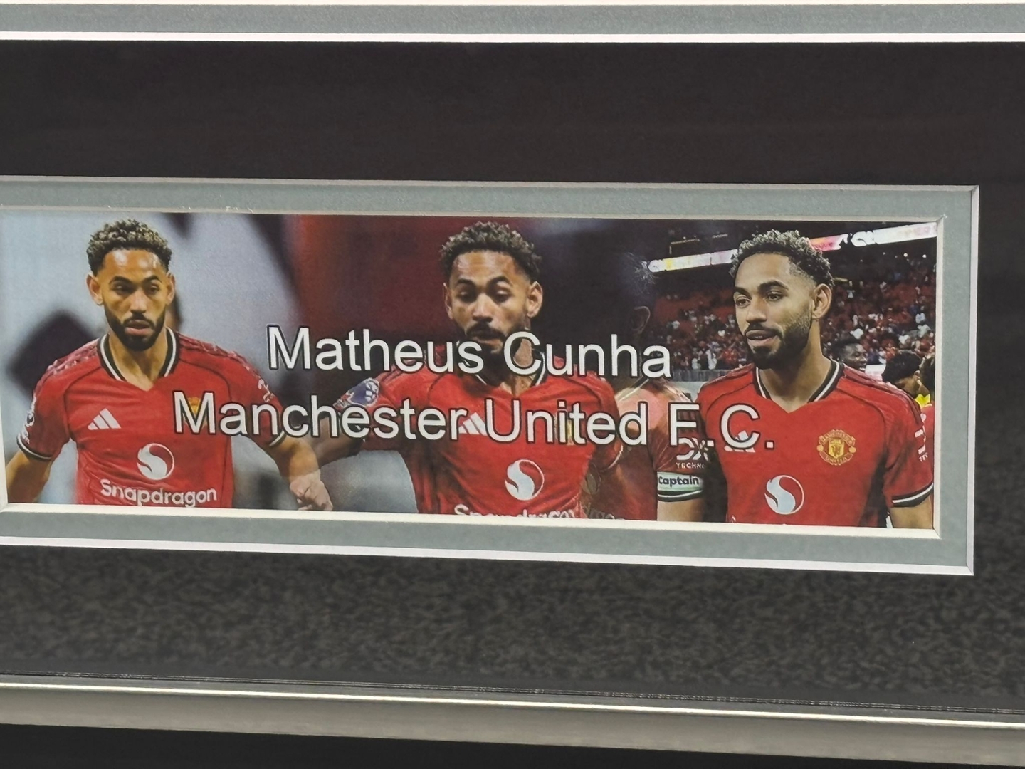 A signed and authenticated Matheus Cunha Man United Football Shirt in a presentation frame. Approx 83cm height, 68cm width.