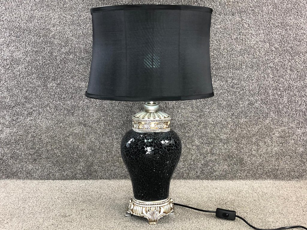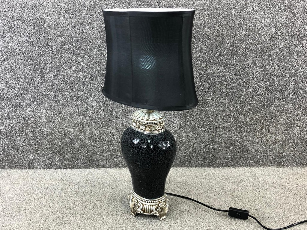 A medium table top black crushed mosaic glass centred traditional style lamp with a black shade. Approx 25" height, 14" width.