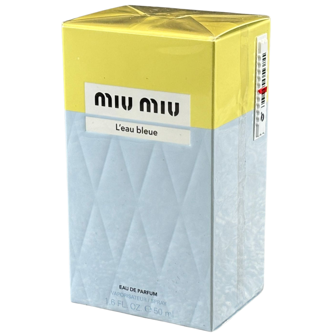 A 50ml bottle of Miu Miu L’Eau Bleue Eau De Parfum, presented in its original presentation box and offering a distinctive, contemporary fragrance from the Miu Miu collection. This refined scent reflects the brand’s modern, fashion-forward identity, combining elegance with a confident and unconventional character.