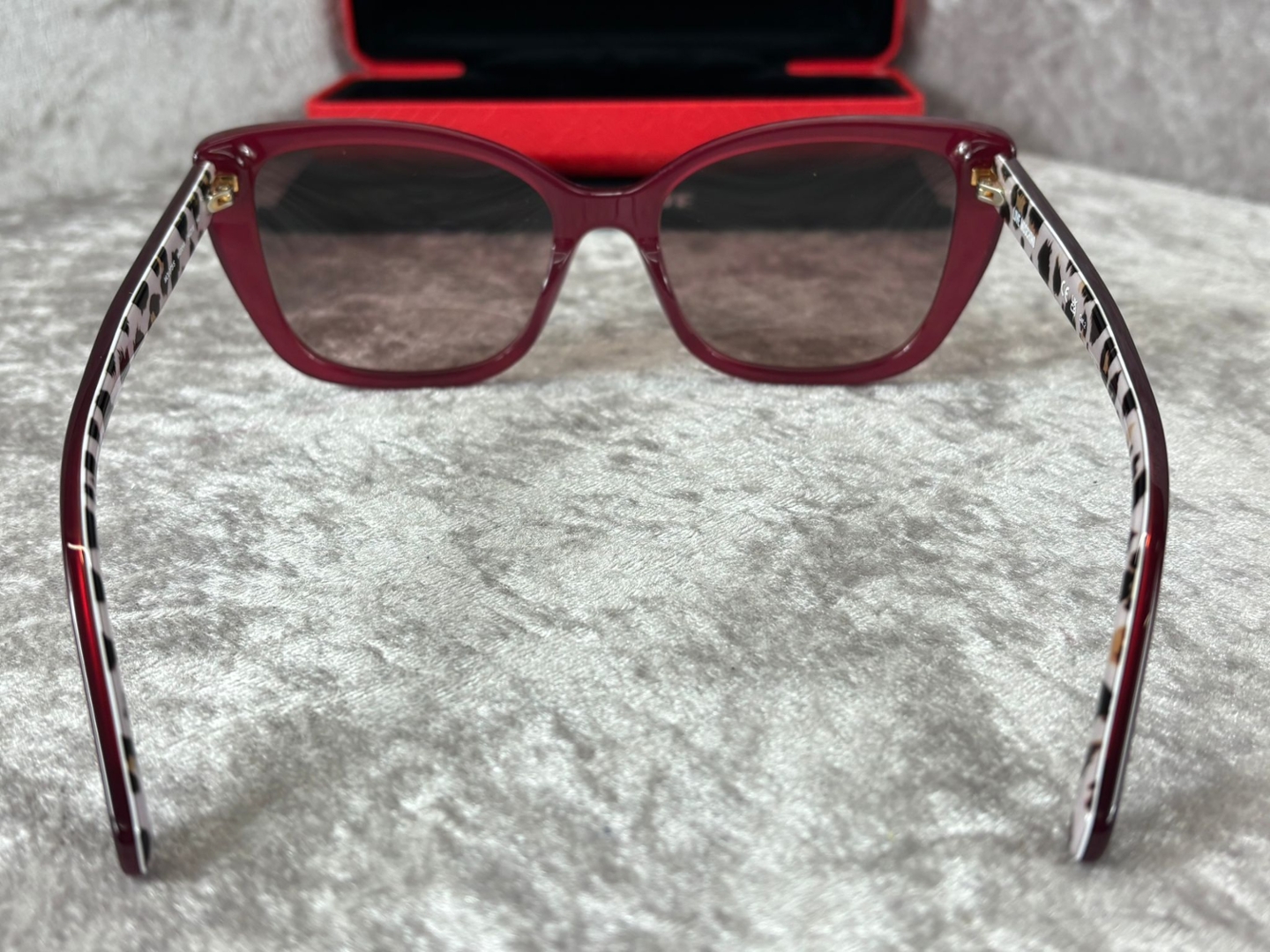 The frame is complemented by gradient tinted lenses that provide reliable sun protection while maintaining a refined finish. Subtle gold-tone detailing at the temples enhances the luxurious feel, alongside signature Moschino branding for unmistakable designer appeal. The patterned inner arms add an unexpected touch of character, elevating the overall design with a distinctive twist.