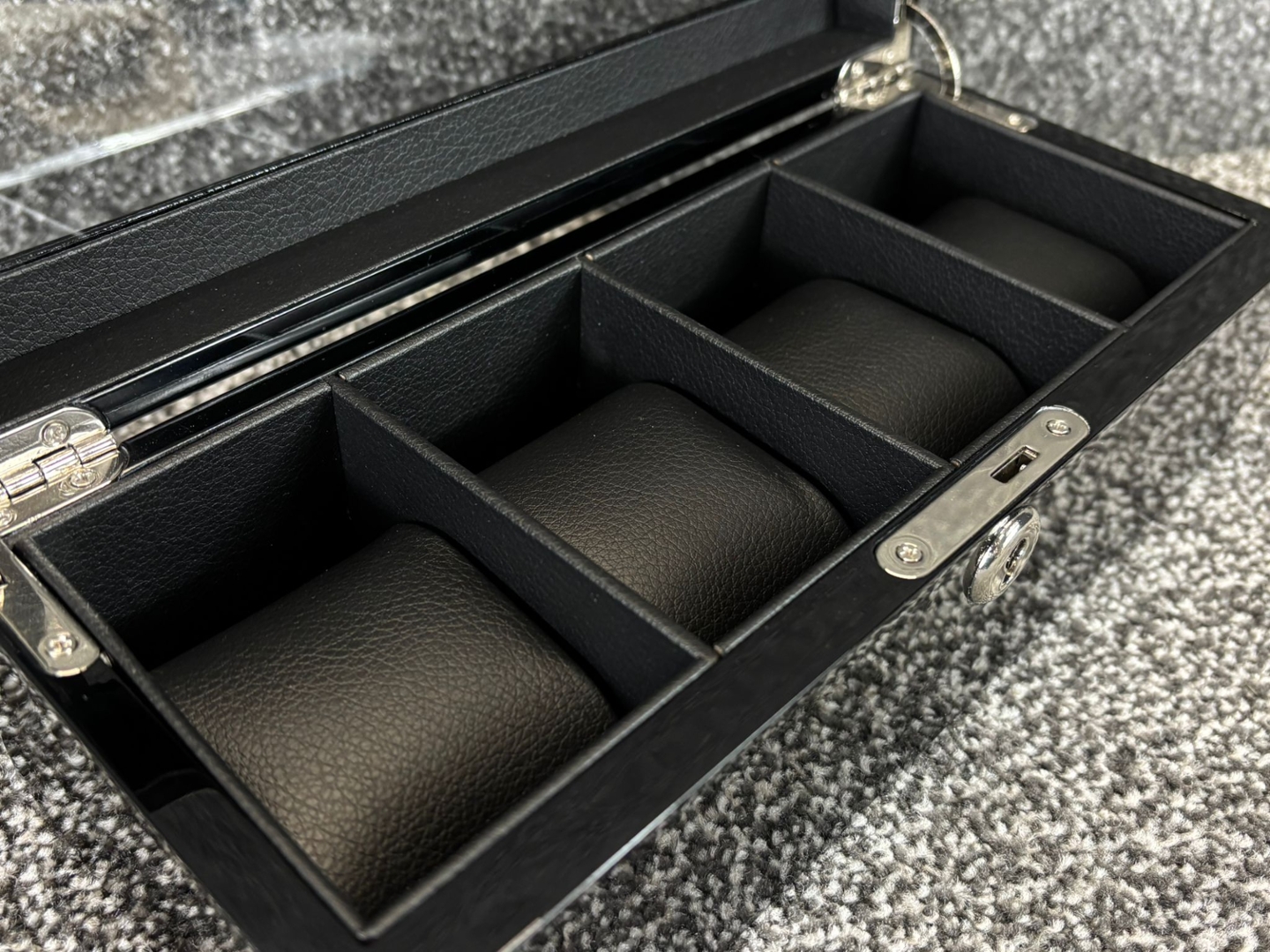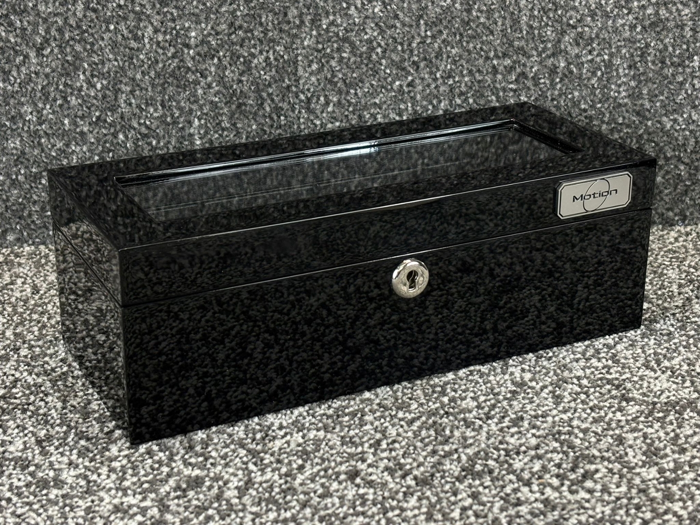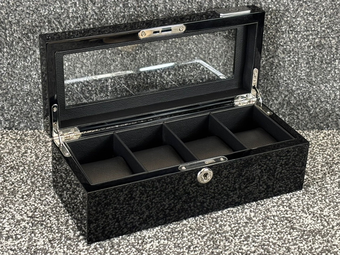 A Motion 4 Compartment Black Wooden Piano Finish Watch Box, crafted to offer a refined and practical storage solution for a smaller, considered watch collection. The exterior is finished in a deep black piano lacquer, complemented by a clear glass display lid that allows the contents to be viewed while remaining securely enclosed. Its clean, rectangular form gives the piece a smart and contemporary appearance.