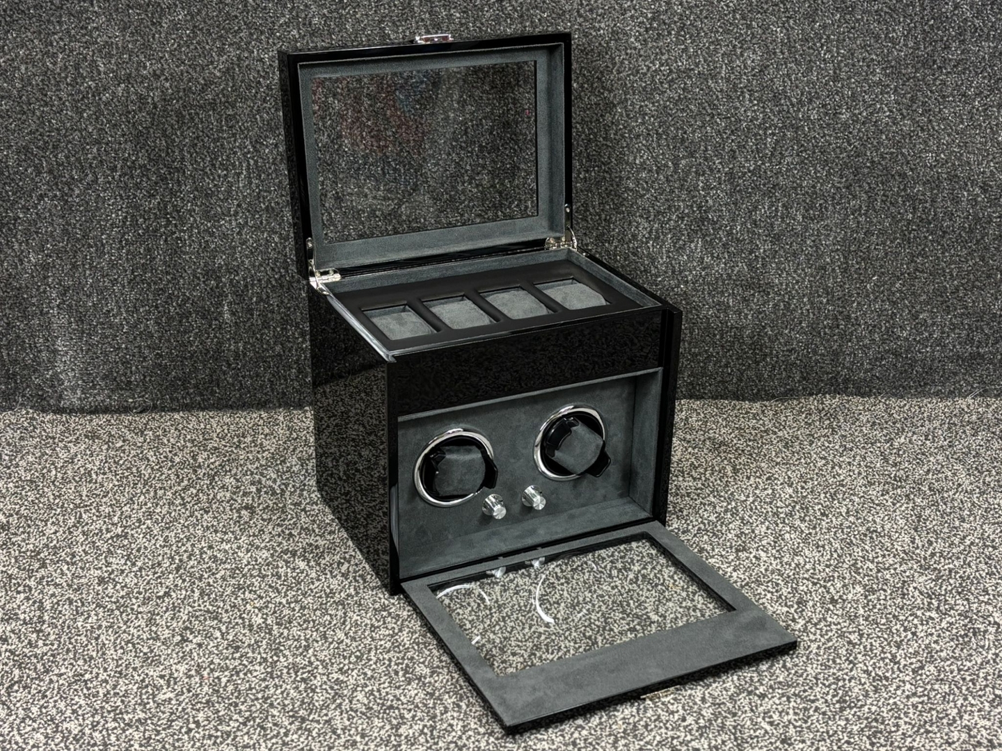 A Motion Double Black Wooden Piano Finish Watch Winder, comprising a four watch storage compartment at the top & with a black leather & grey suede interior. Approx 27cm height, 30cm width, 22cm depth.