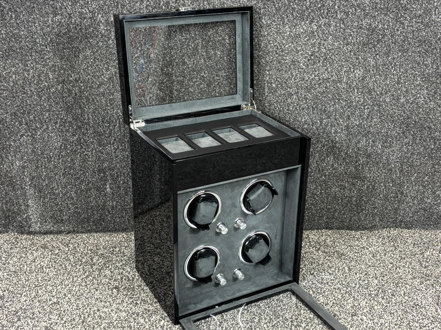A Motion Quad Black Wooden Piano Finish Watch Winder, comprising a four watch storage compartment on top & with a black leather & grey suede interior. Approx 38cm height, 30cm width, 22cm depth.