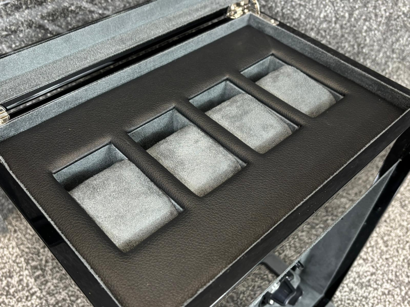 Opening the lid reveals a plush grey suede interior, adding a touch of refinement to the winder. With dimensions of approximately 38cm in height, 30cm in width, and 22cm in depth, this winder provides ample space while maintaining a compact and stylish design.